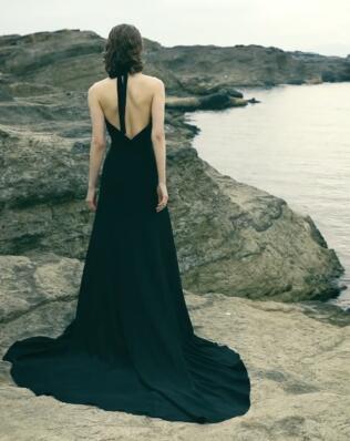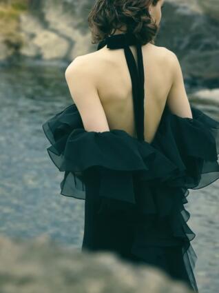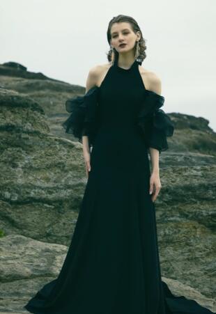 送料無料!ウエディングドレス カラードレス 黒 取り外し可能な袖 フリフリ袖 細見えシルエット ホルターネック トレーン/ロング(ご指定自由)!前撮り パーティー/披露宴/結婚式/花嫁/二次会 | David1021k Dress(ダヴィドレス)