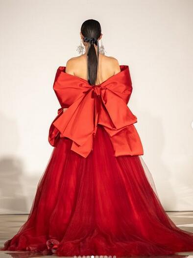 送料無料!パーティドレス カラードレス レッド/赤 背中見せ/バックレス 蝶々結びリボン オフショルダー ボリューム感満点 トレーン/ロング(ご指定自由)!前撮り パーティー/披露宴/結婚式/花嫁/二次会
