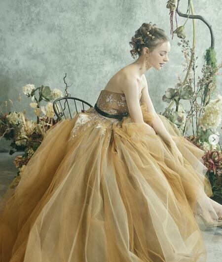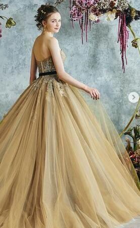 送料無料!ウエディングドレス リボン カラードレス イエロー/黄色い ビスチェドレス ソフトチュール 柔らかく重ねたチュールスカート プリンセスライン ビスチェドレス トレーン/ロング(ご指定自由)!前撮り パーティー/披露宴/結婚式/花嫁/二次会 | David1021k Dress(ダヴィドレス)