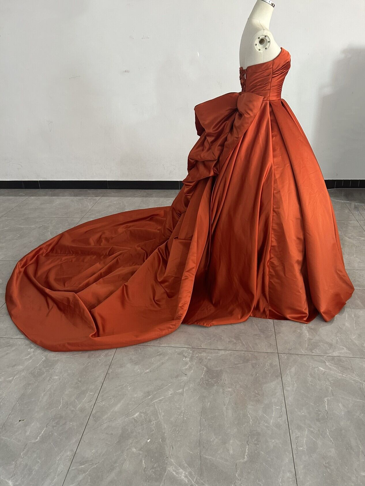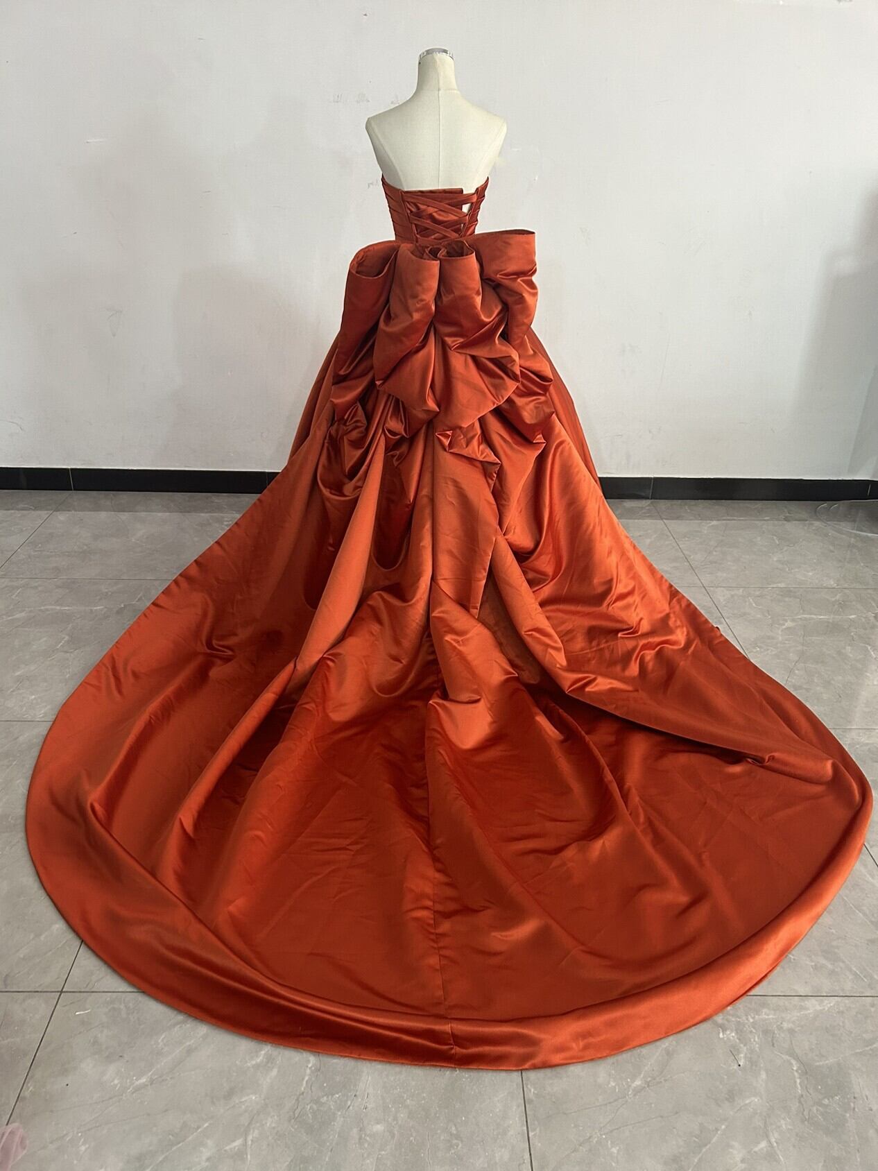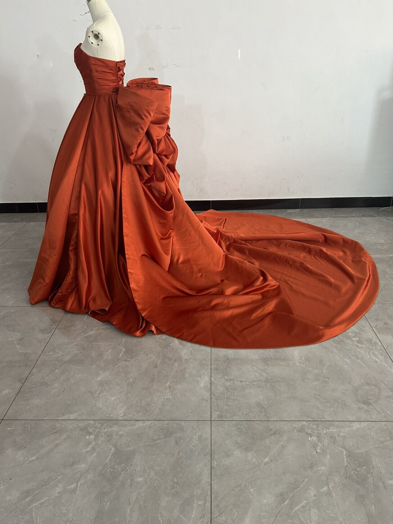 高品質!テラコッタ色 ベアトップ カラードレス 取り外し袖 華やかなトレーン ふっくら柔らかなバックリボン /結婚式