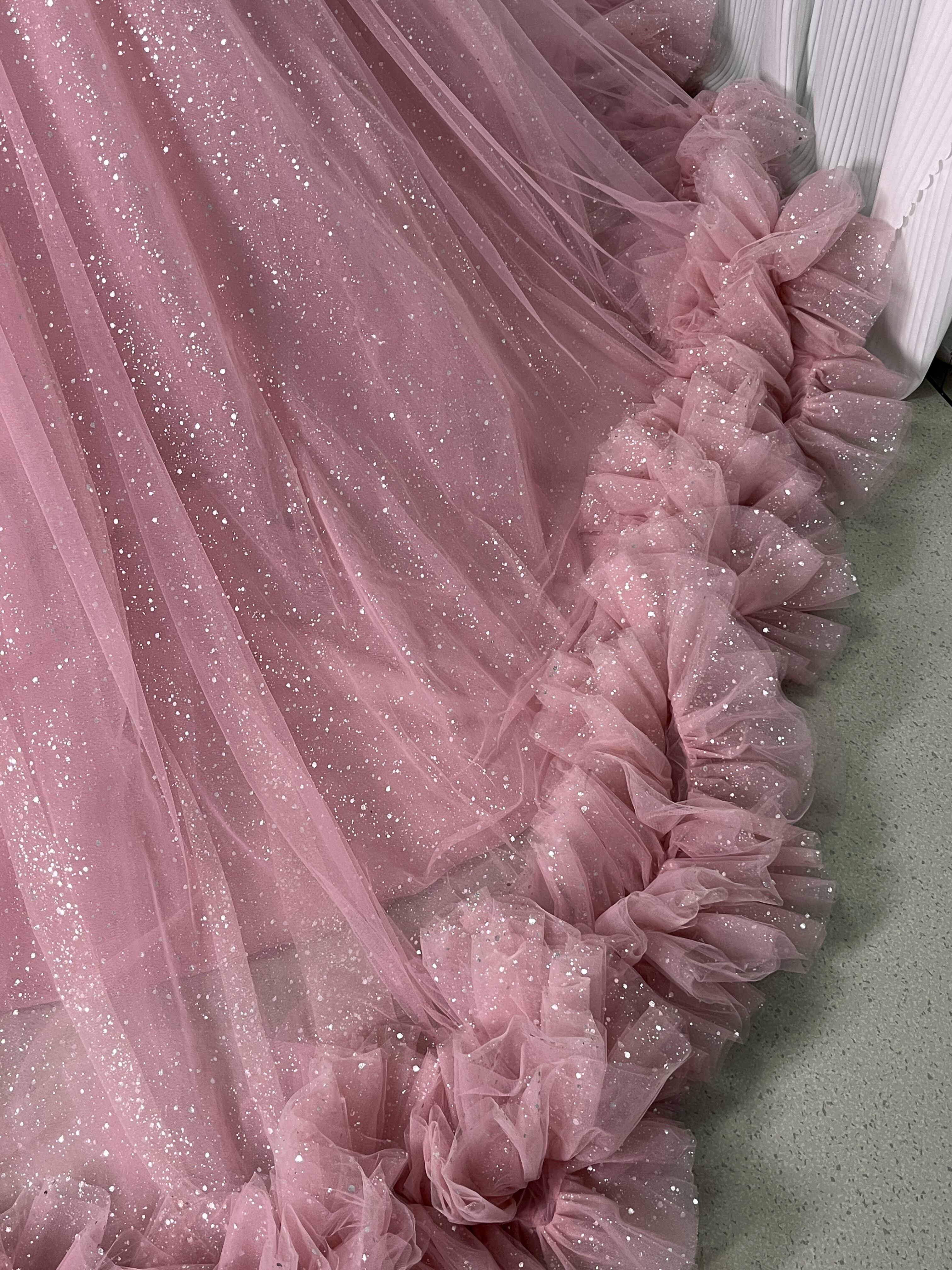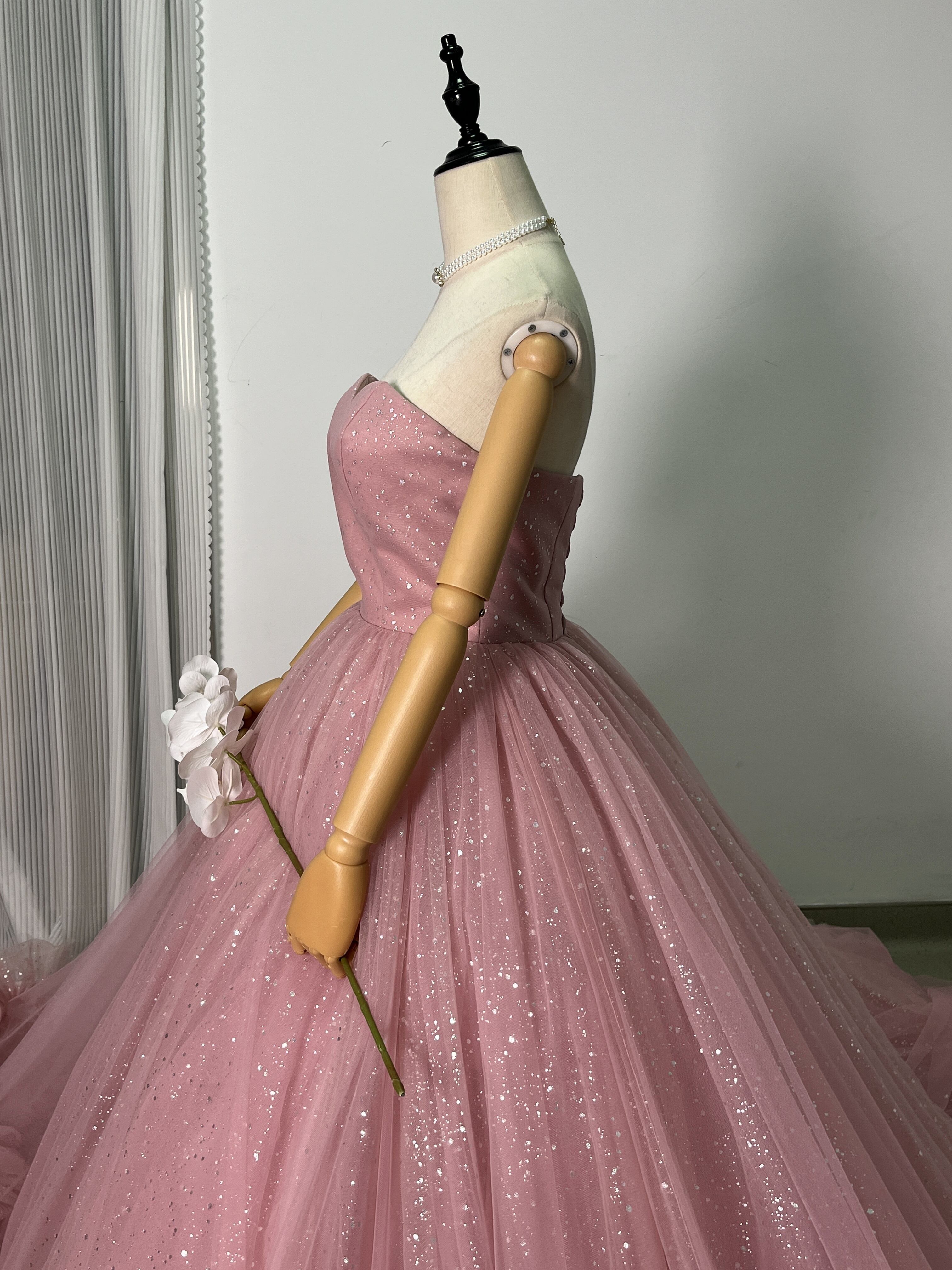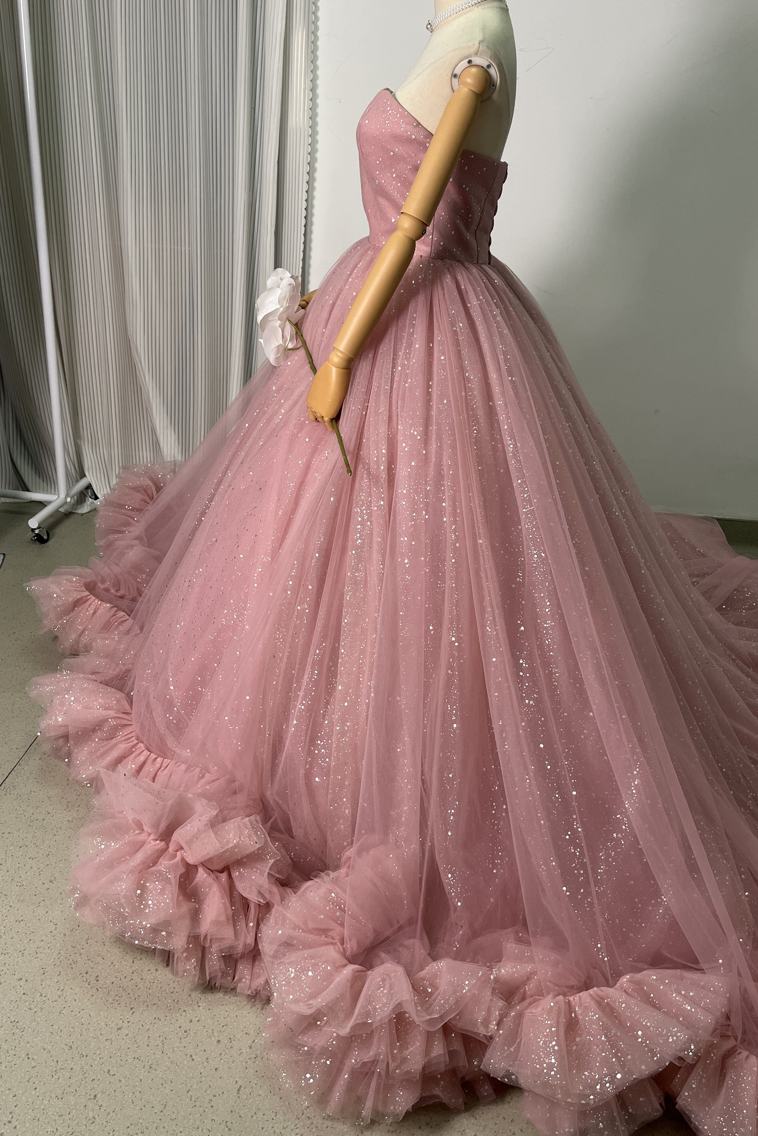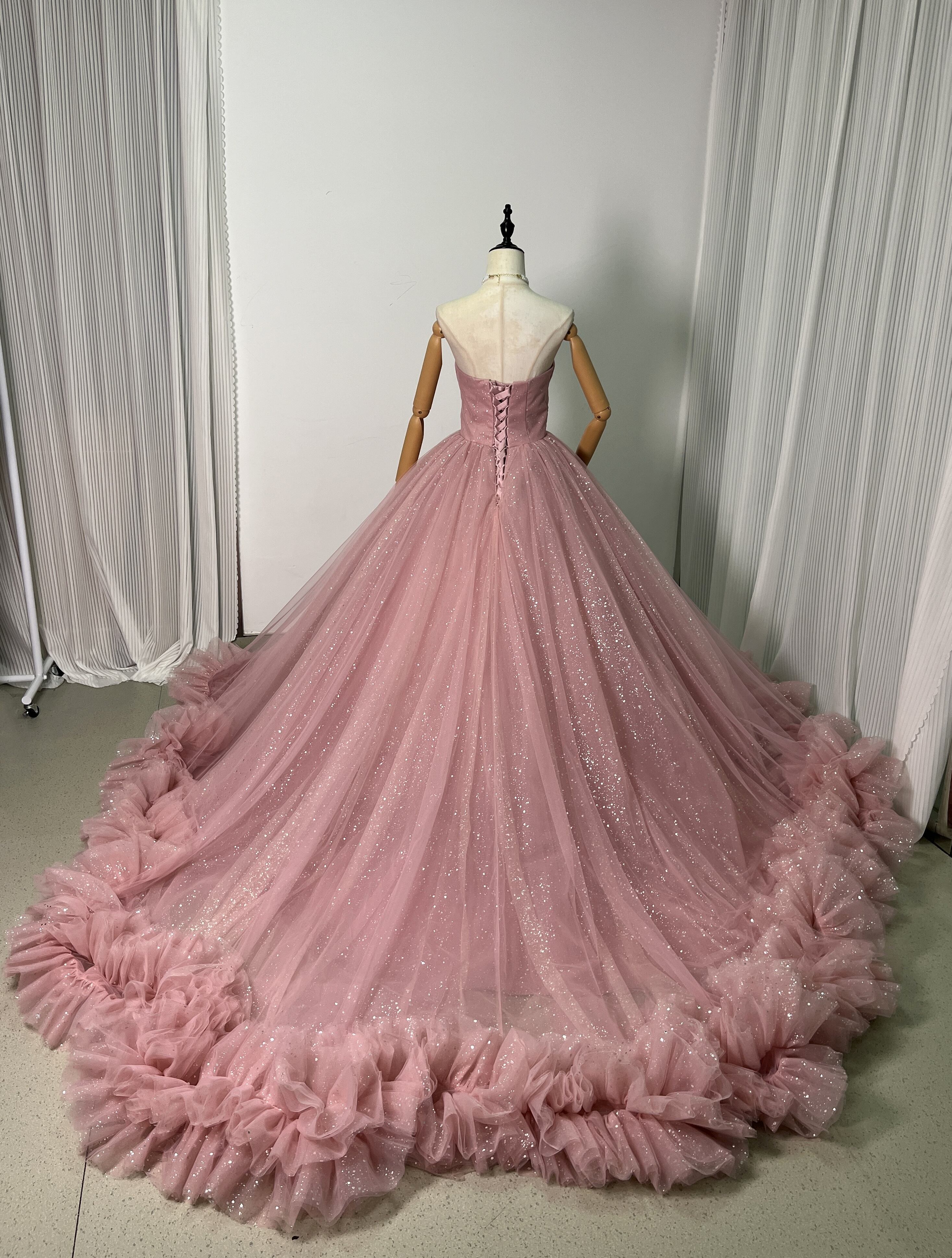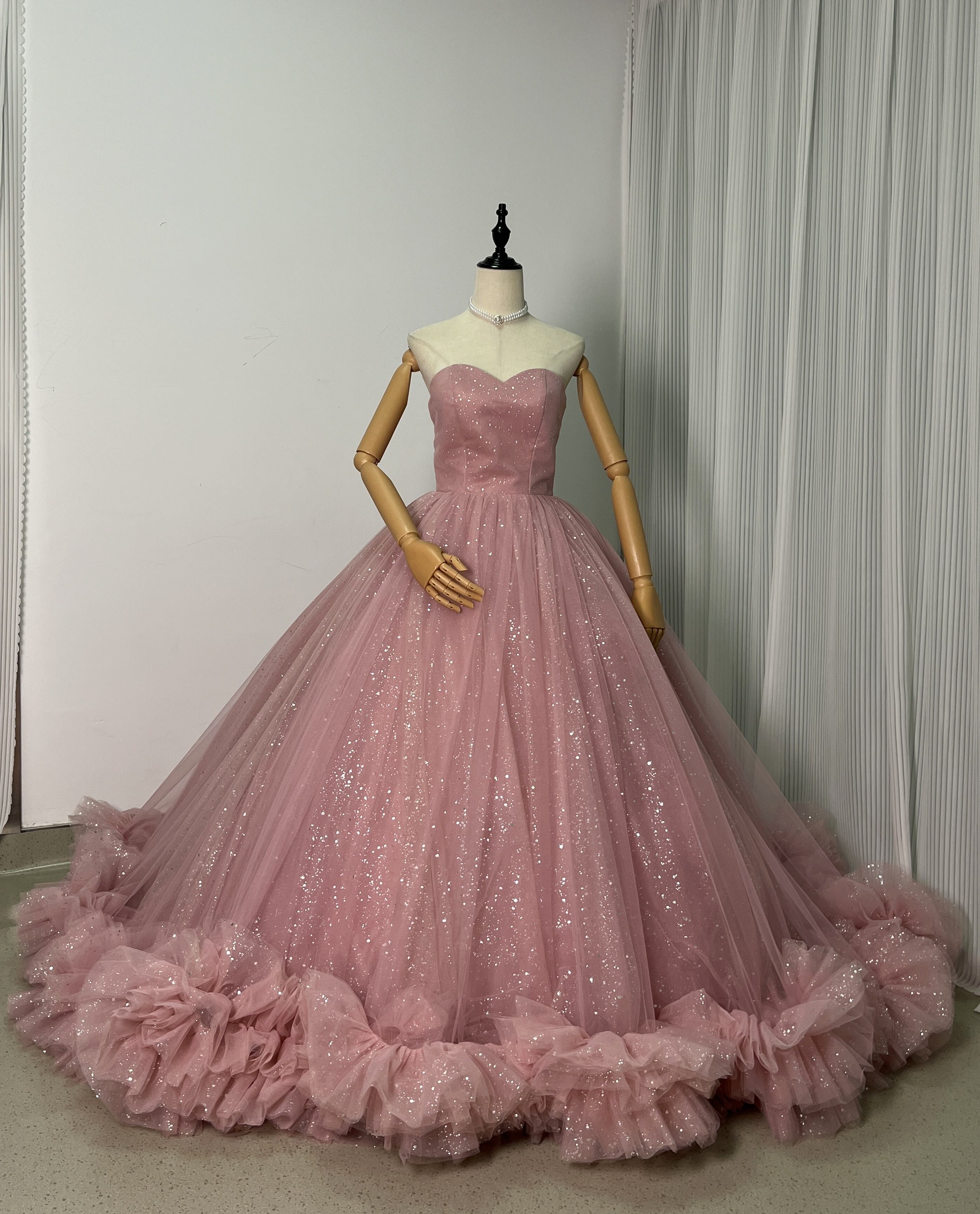 高品質!ピンク ベアトップ カラードレス 華やかなトレー ンふわふわドレス /結婚式