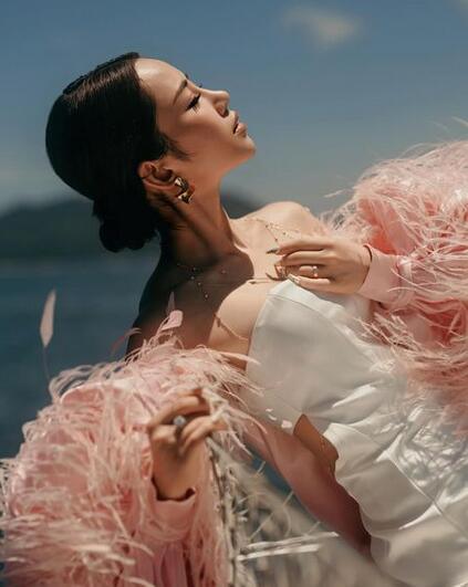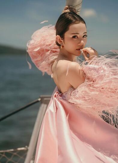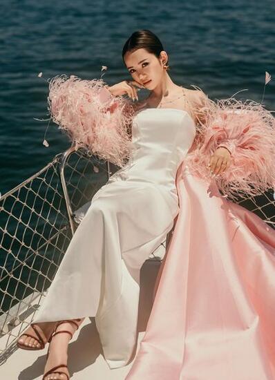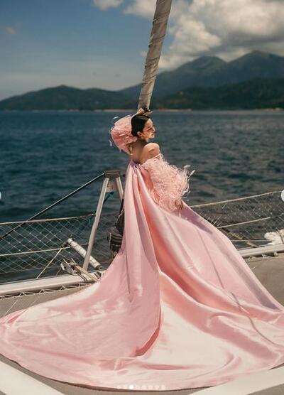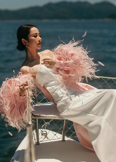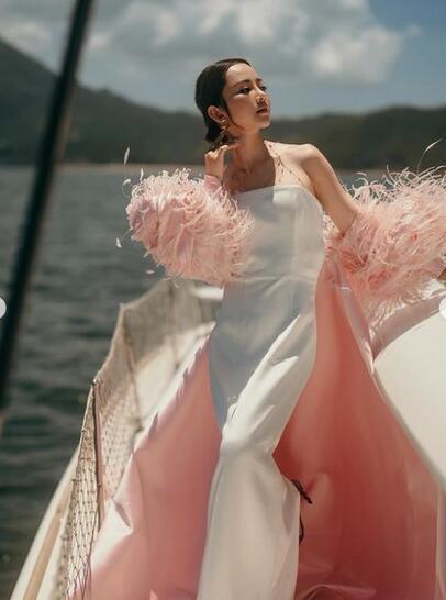 高品質!ファーフェザー ウエディングドレス もふもふ袖 ビスチェドレス マントトレーン ピンクカラードレス マーメイドライン 優雅なシルエット 背中見せ/バックレス 細見えシルエット