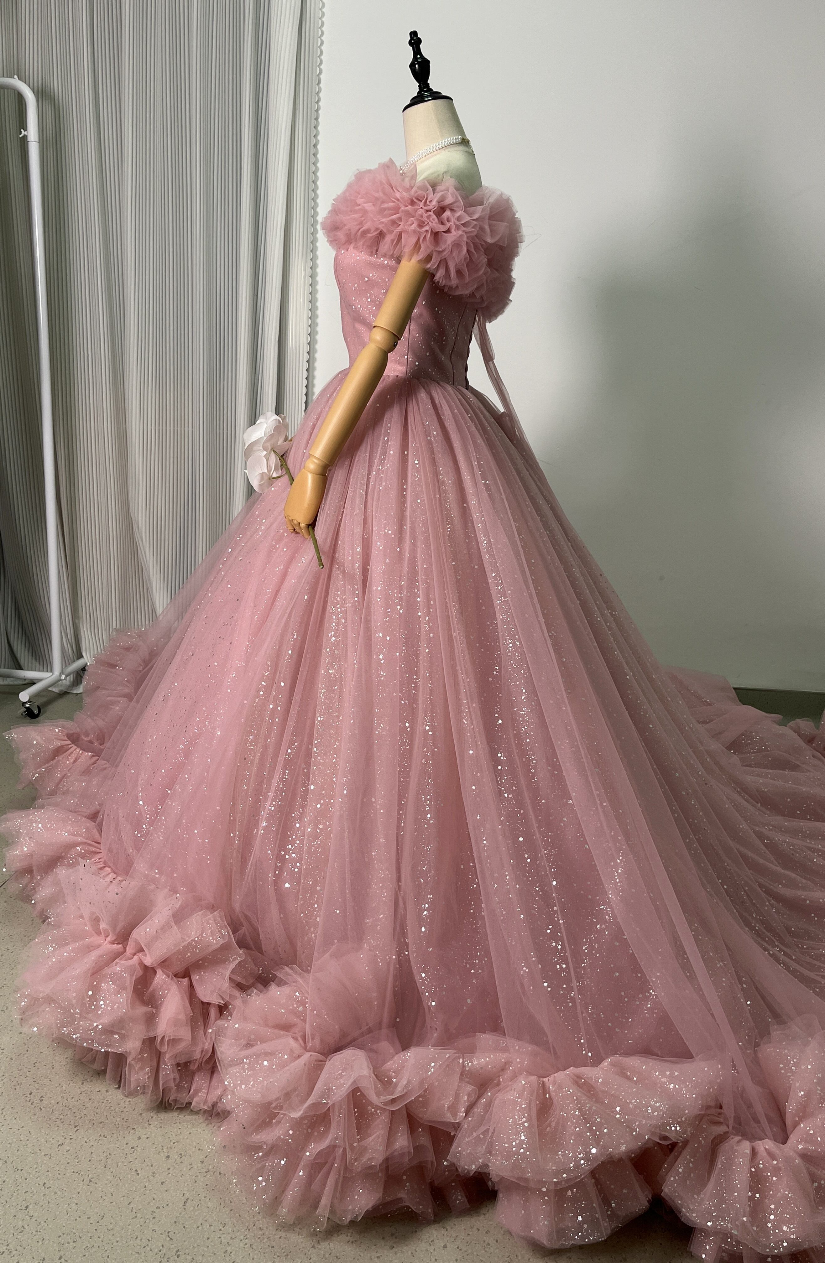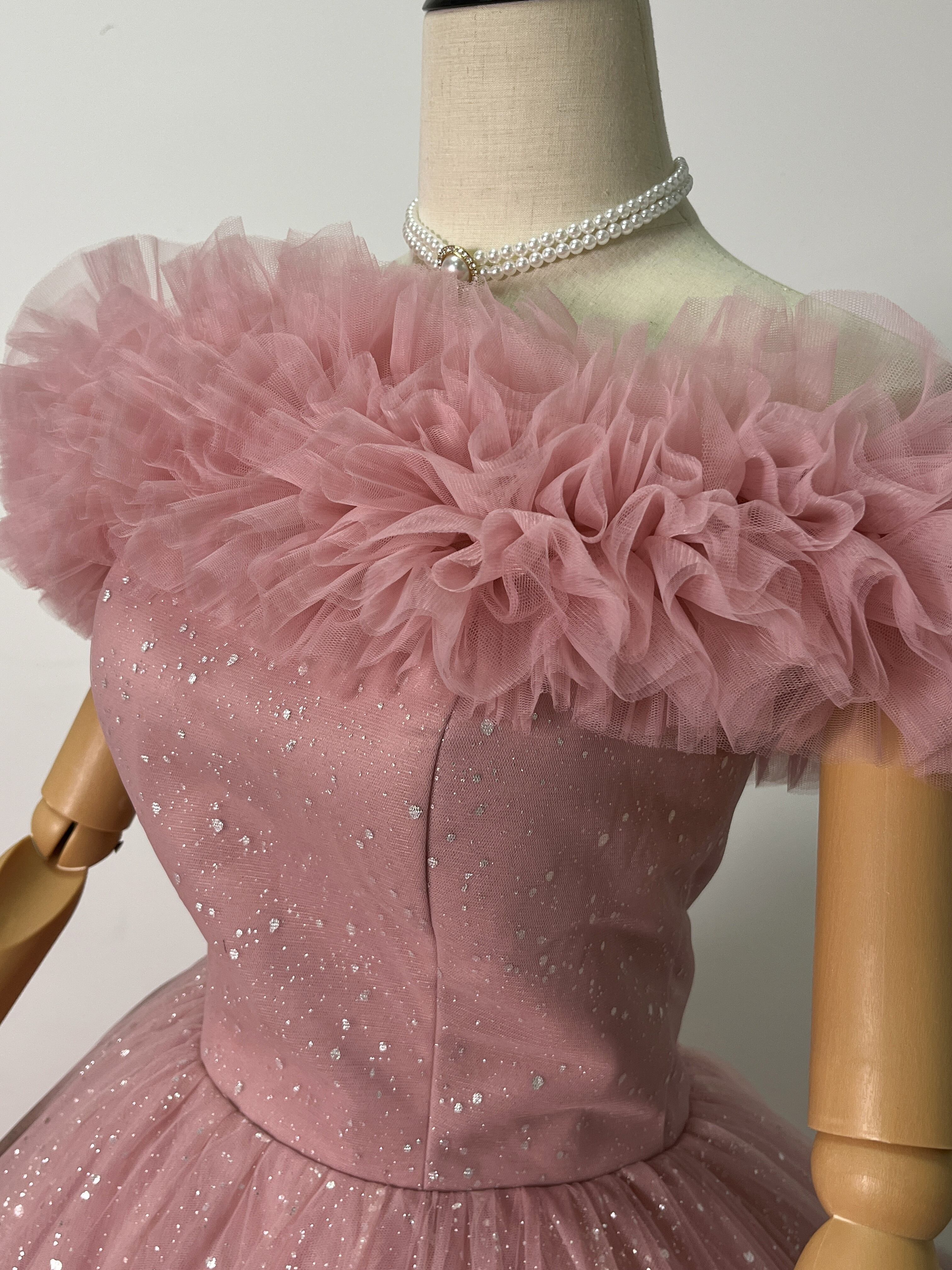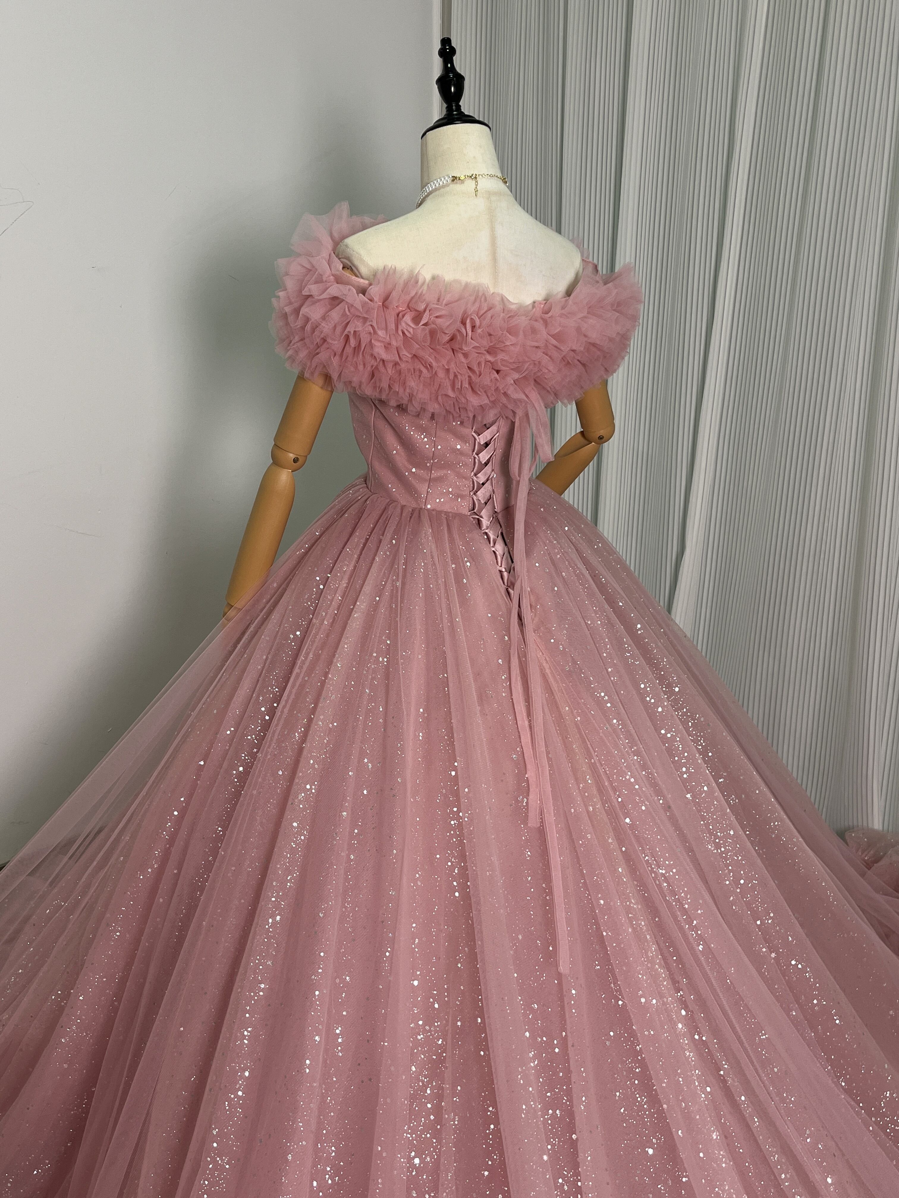 高品質!ピンク オフショルダー カラードレス キラキラチュール 華やかなトレー ンふわふわドレス /結婚式