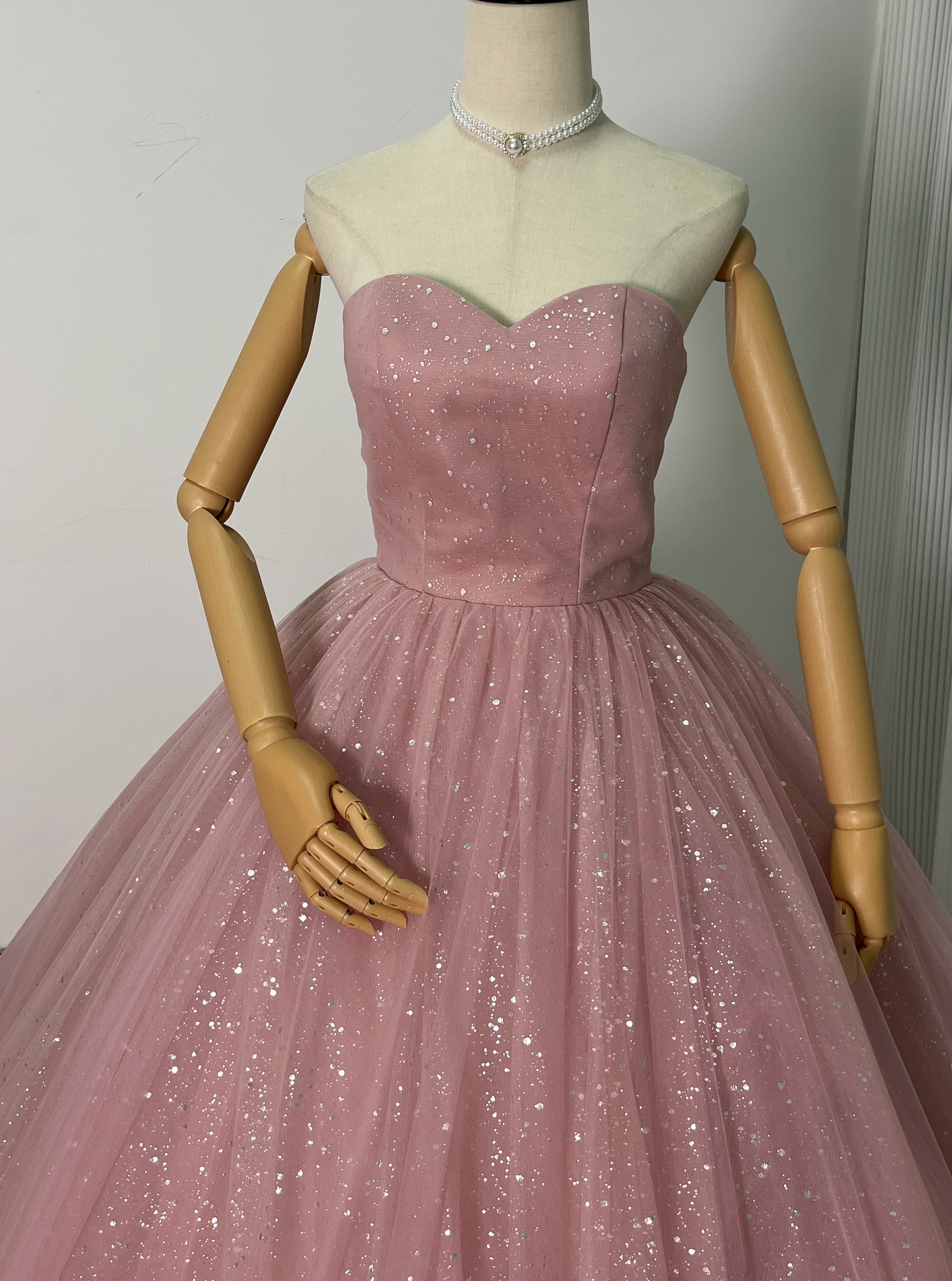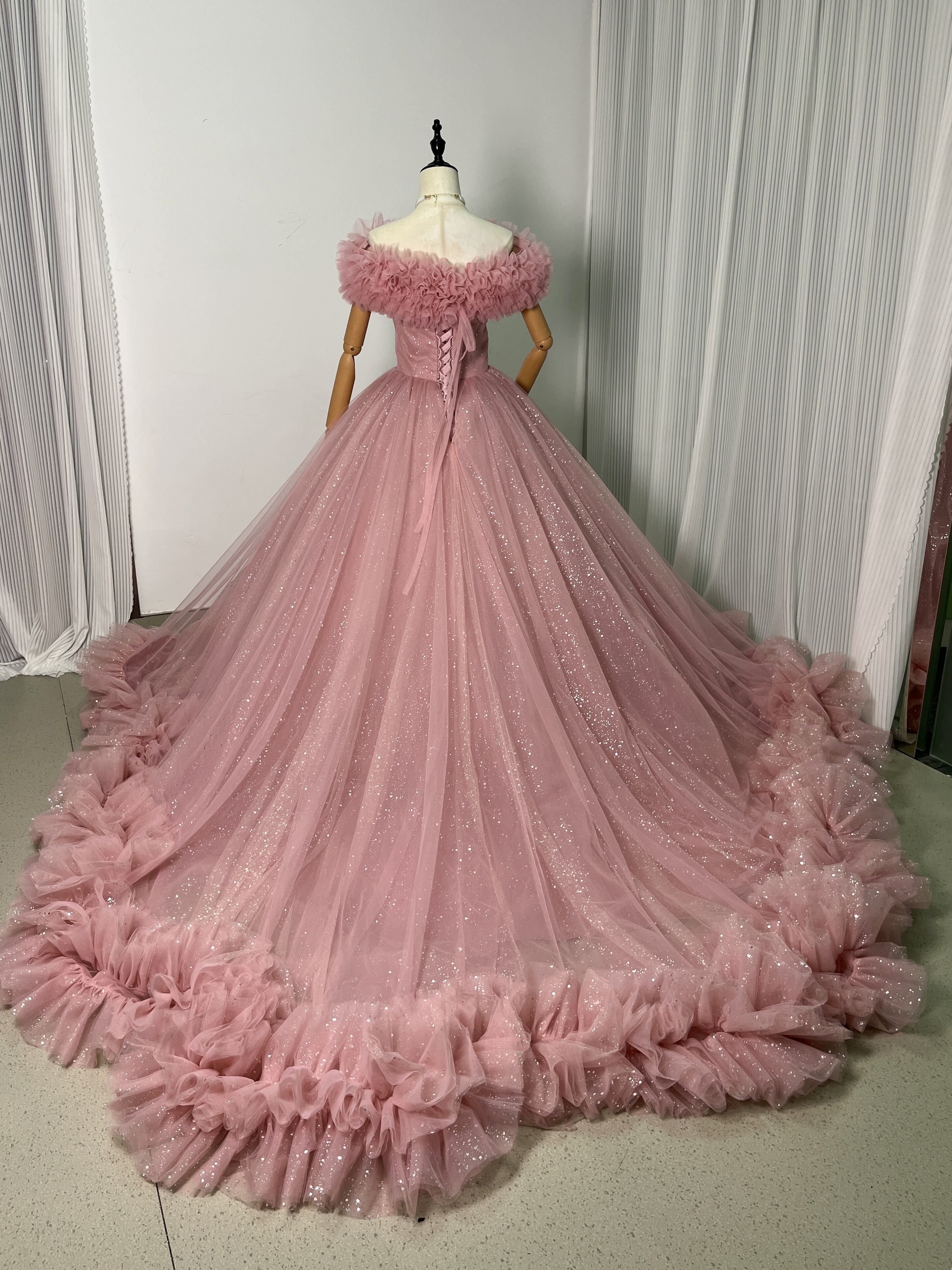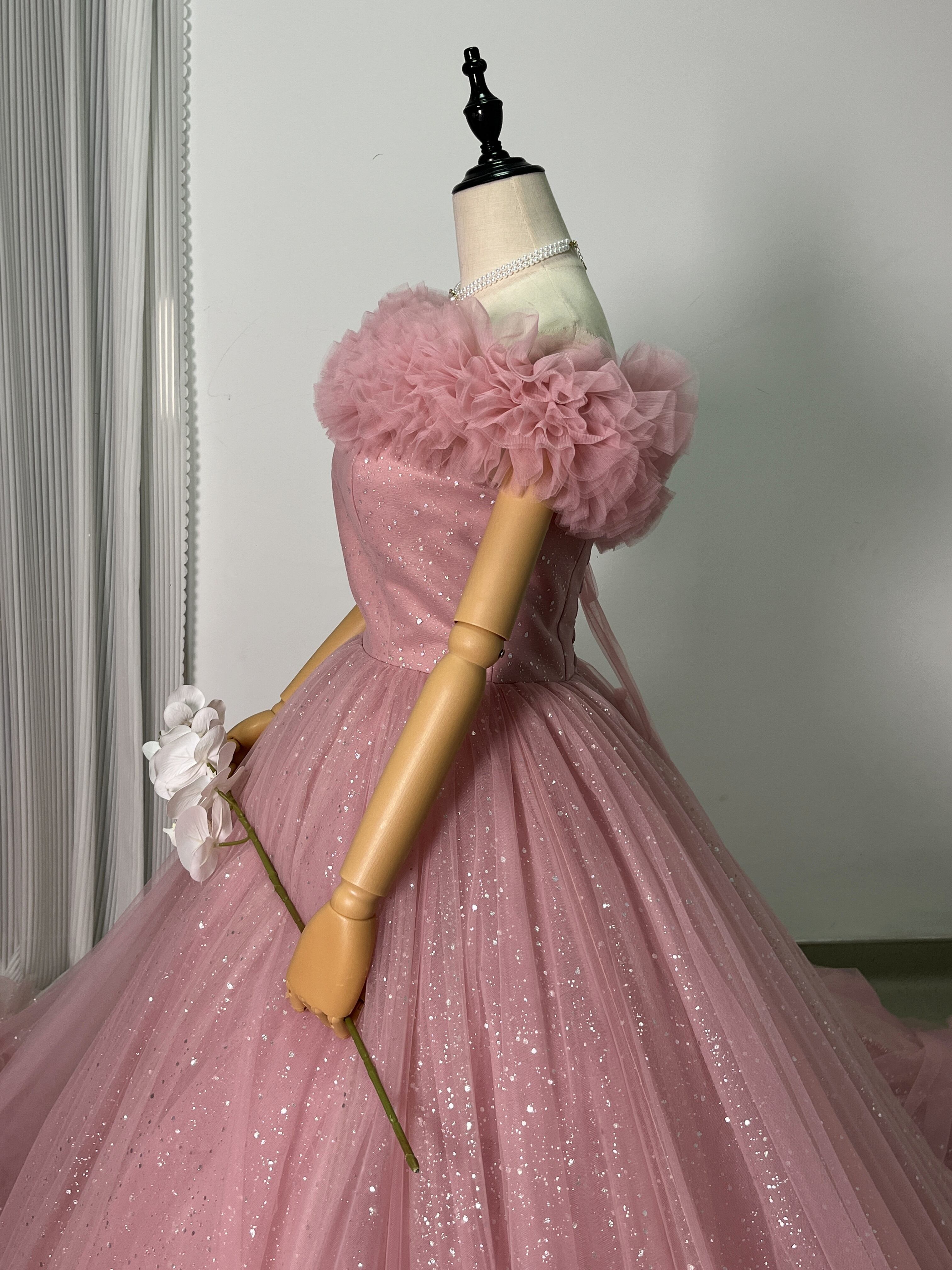高品質!ピンク オフショルダー カラードレス キラキラチュール 華やかなトレー ンふわふわドレス /結婚式