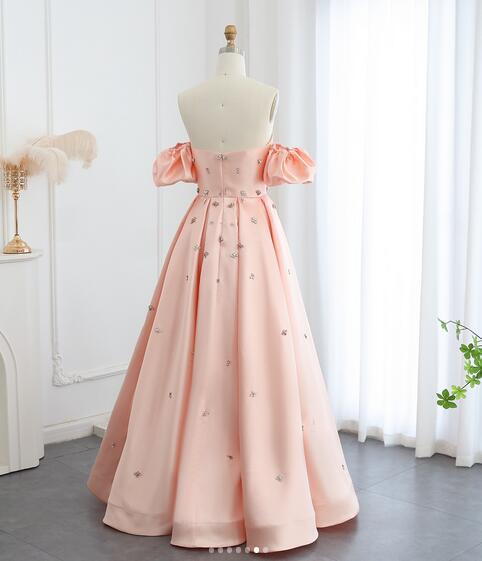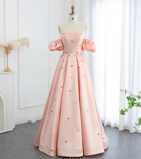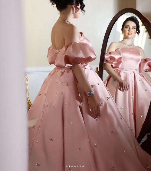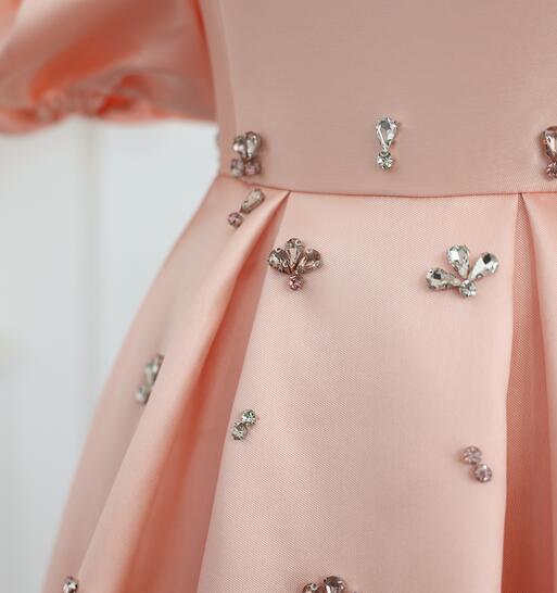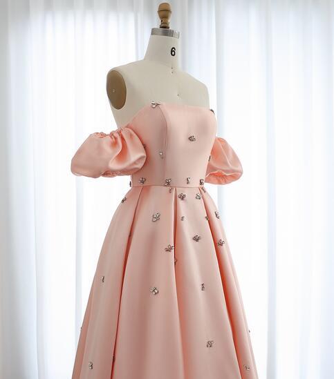 豪華!カラードレス パーティドレス パフスリープ ピンク プリンセスライン 高級サテン ビジュー キラキラ 可愛い かわいい トレーン/ロング(ご指定自由)!前撮り パーティー/披露宴/結婚式/花嫁/二次会 | David1021k Dress(ダヴィドレス)