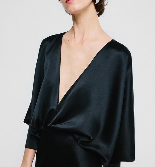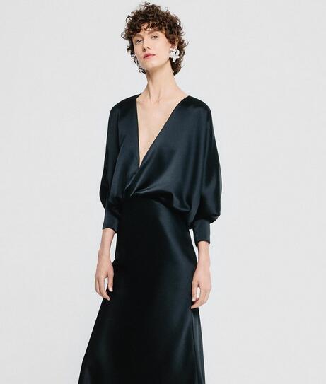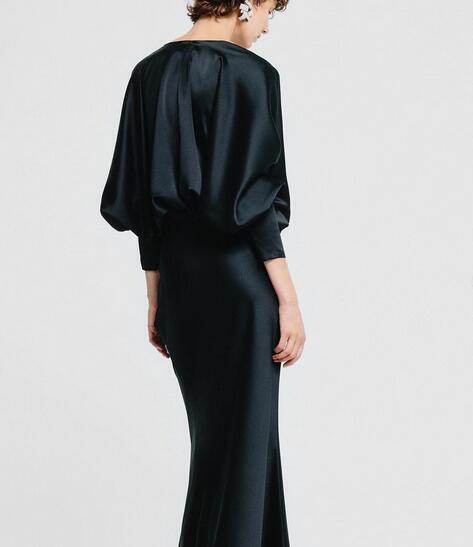 高品質!カラードレス パーティドレス ブラック/黒 七分袖丈 Vネック 高級サテン 光沢感 カッコイイ トレーン/ロング(ご指定自由)!前撮り パーティー/披露宴/結婚式/花嫁/二次会 | David1021k Dress(ダヴィドレス)