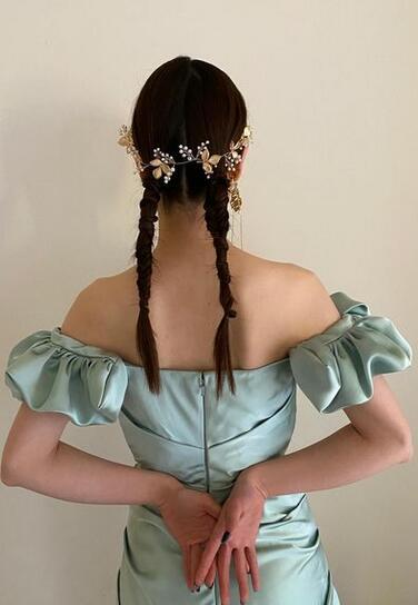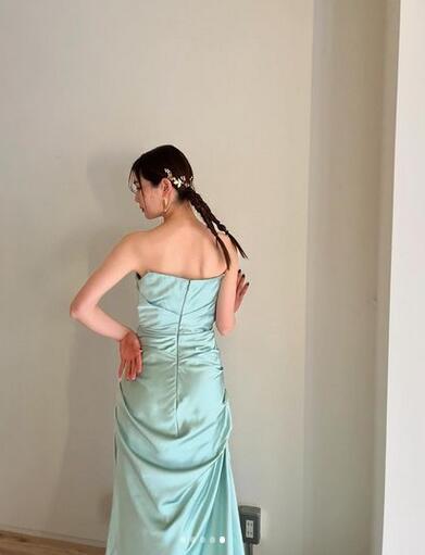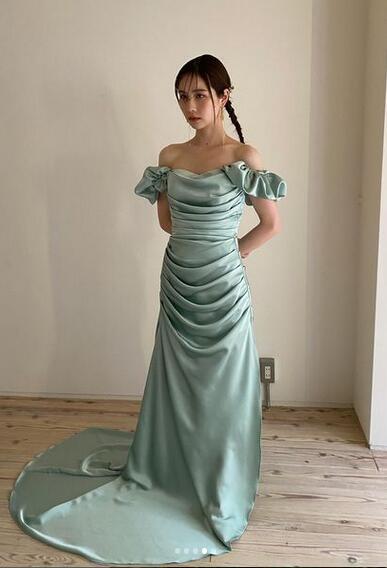 送料無料!ウエディングドレス パーティドレス グリーン 取り外し可能 フリフリスリーブ 高級サテン 優雅なシルエット ソフトハートカット 背中見せ/バックレス かわいい トレーン/ロング(ご指定自由)!前撮り パーティー/披露宴/結婚式/花嫁/二次会 | David1021k Dress(ダヴィドレス)