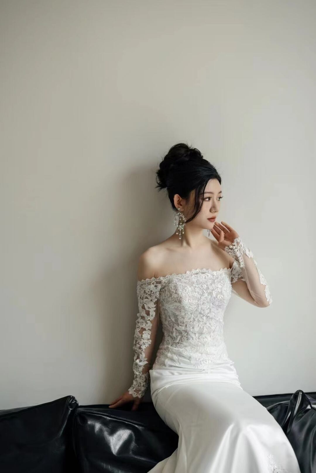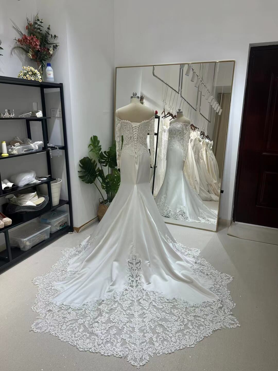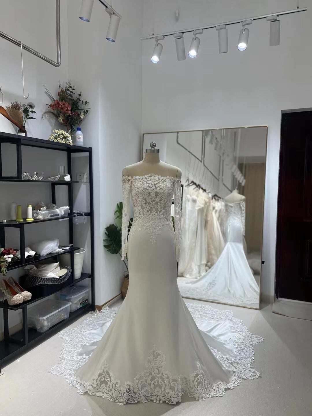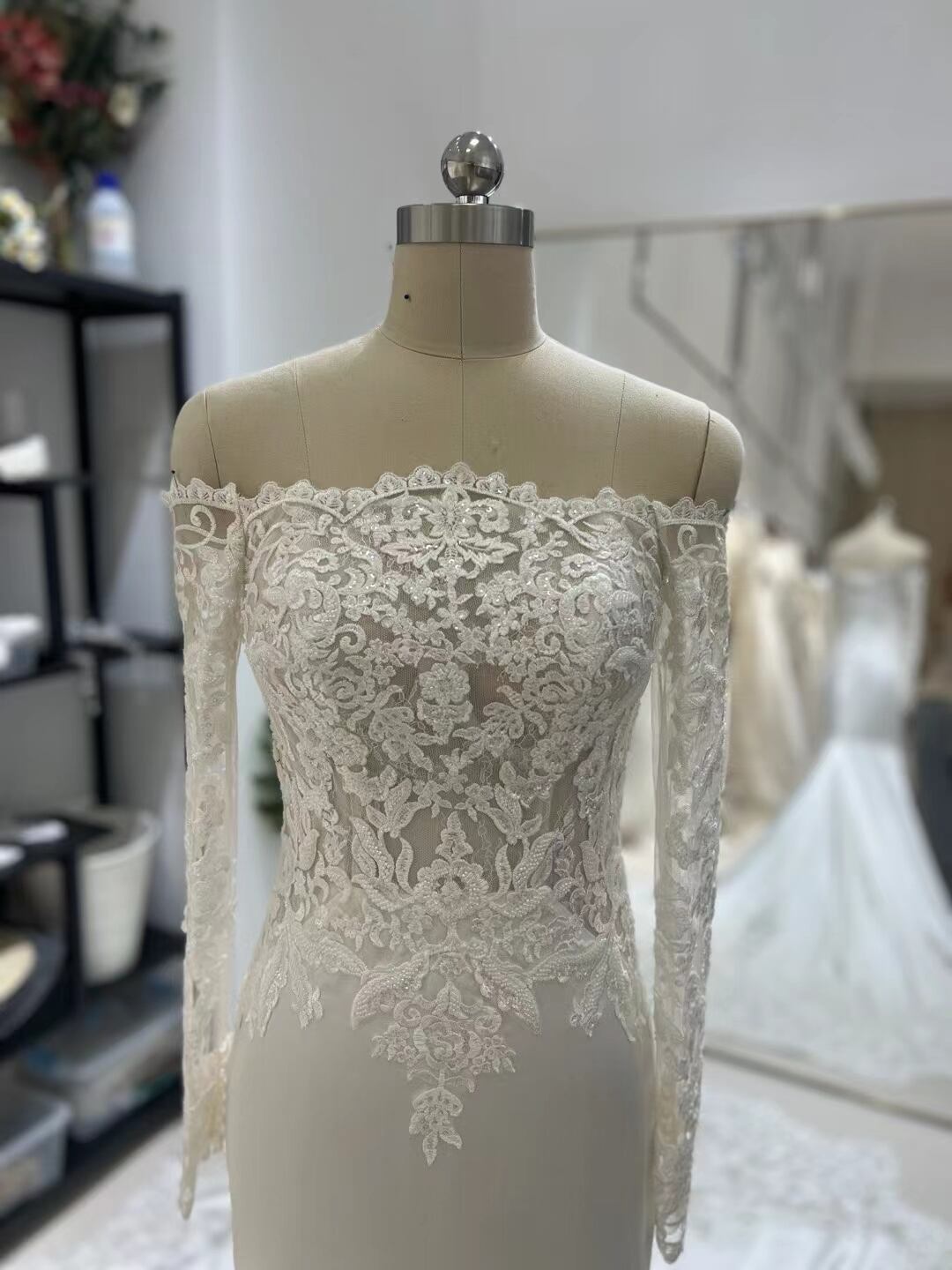 高品質!ウエディングドレス 繊細レース 花柄のモチーフ刺繍が美しく オフショルダー 総レース 美しい 花レース 優雅なシルエット クルミボタン マーメイドライン かわいい トレーン/ロング(ご指定自由)!前撮り パーティー/披露宴/結婚式/花嫁/二次会 | David1021k Dress(ダヴィドレス)