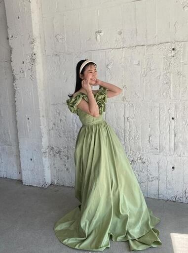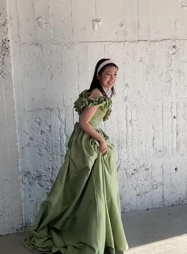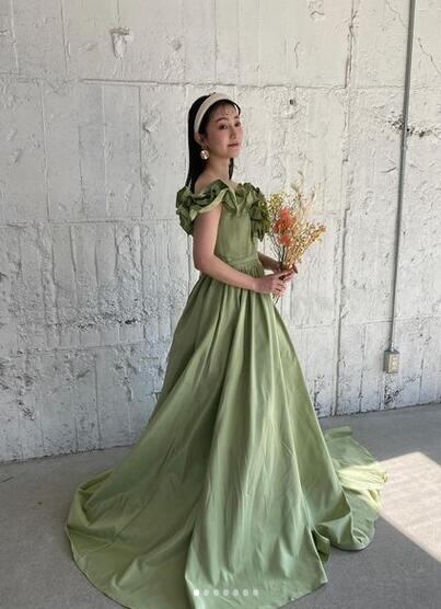 送料無料!カラードレス グリーン 美しい 繊細レース フリルオフショルダー フリフリ 優雅なシルエット かわいい トレーン/ロング(ご指定自由)!前撮り パーティー/披露宴/結婚式/花嫁/二次会 | David1021k Dress(ダヴィドレス)