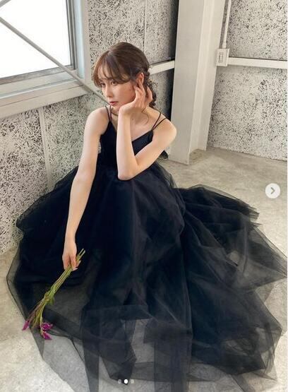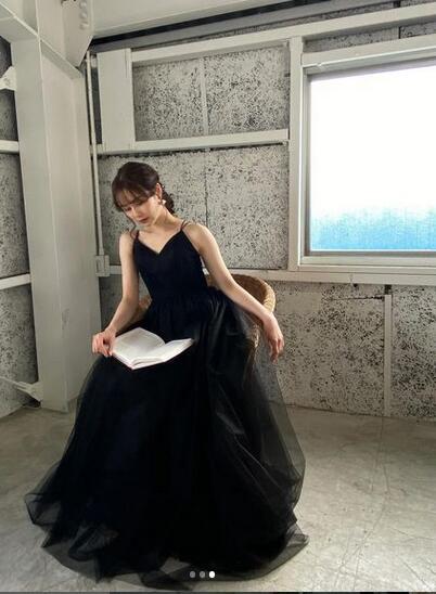 上品!カラードレス 黒/ブラック キャミソール 美しい Vネック 柔らかく重ねたチュールスカート かわいい ビスチェドレス トレーン/ロング(ご指定自由)!前撮り パーティー/披露宴/結婚式/花嫁/二次会 | David1021k Dress(ダヴィドレス)