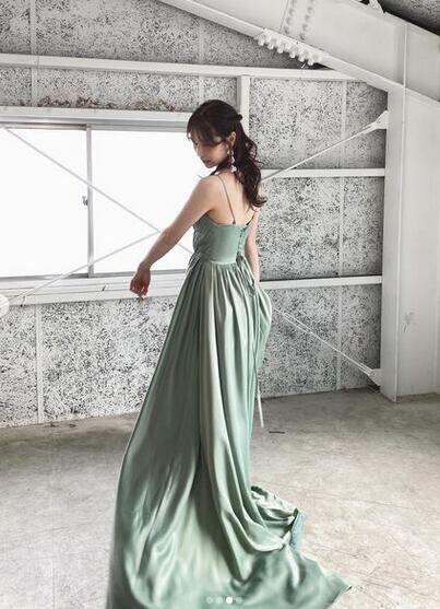 上品!カラードレス グリーン Vネック キャミソール 美しい 優雅なシルエット かわいい トレーン/ロング(ご指定自由)!前撮り パーティー/披露宴/結婚式/花嫁/二次会 | David1021k Dress(ダヴィドレス)