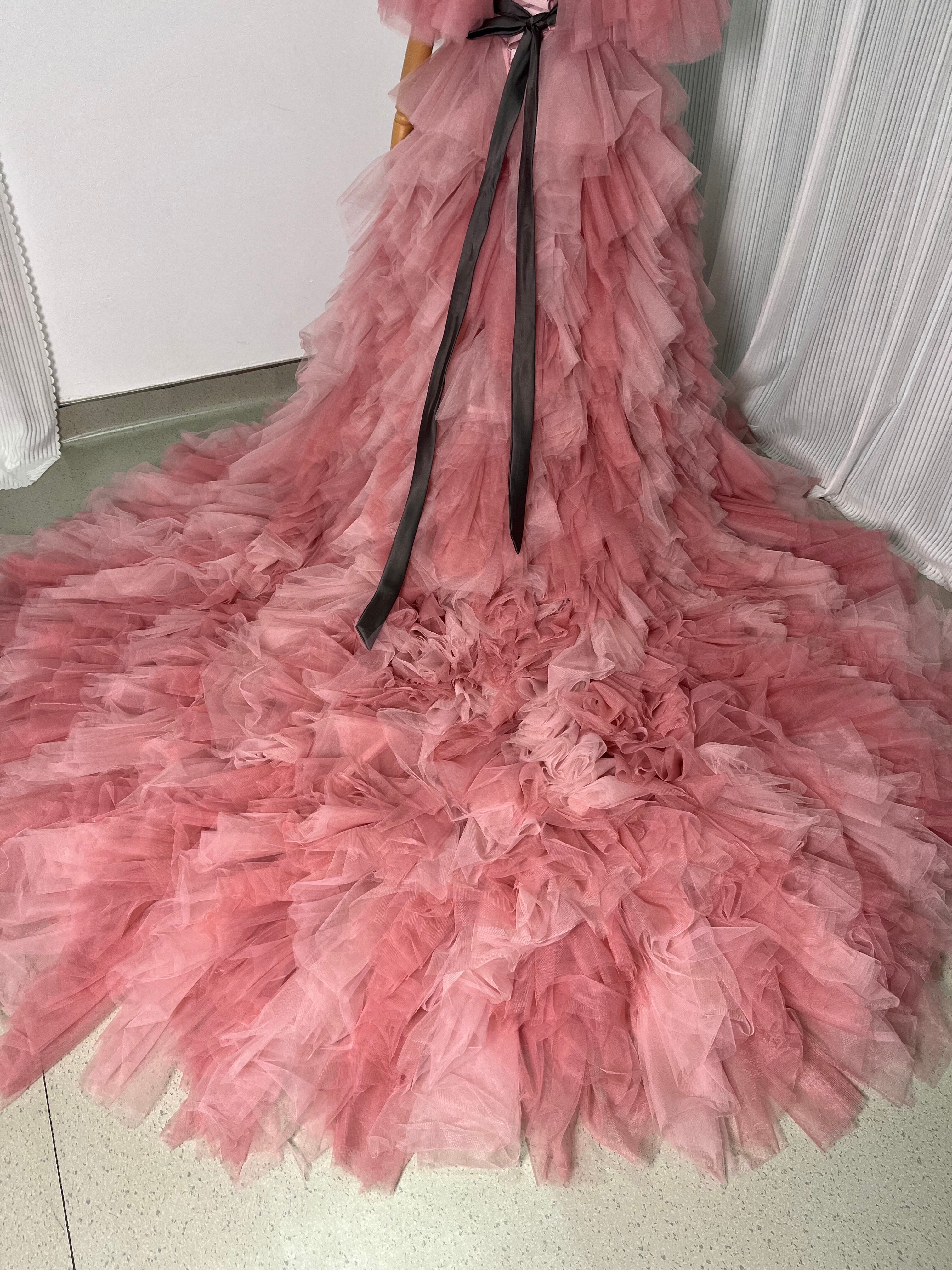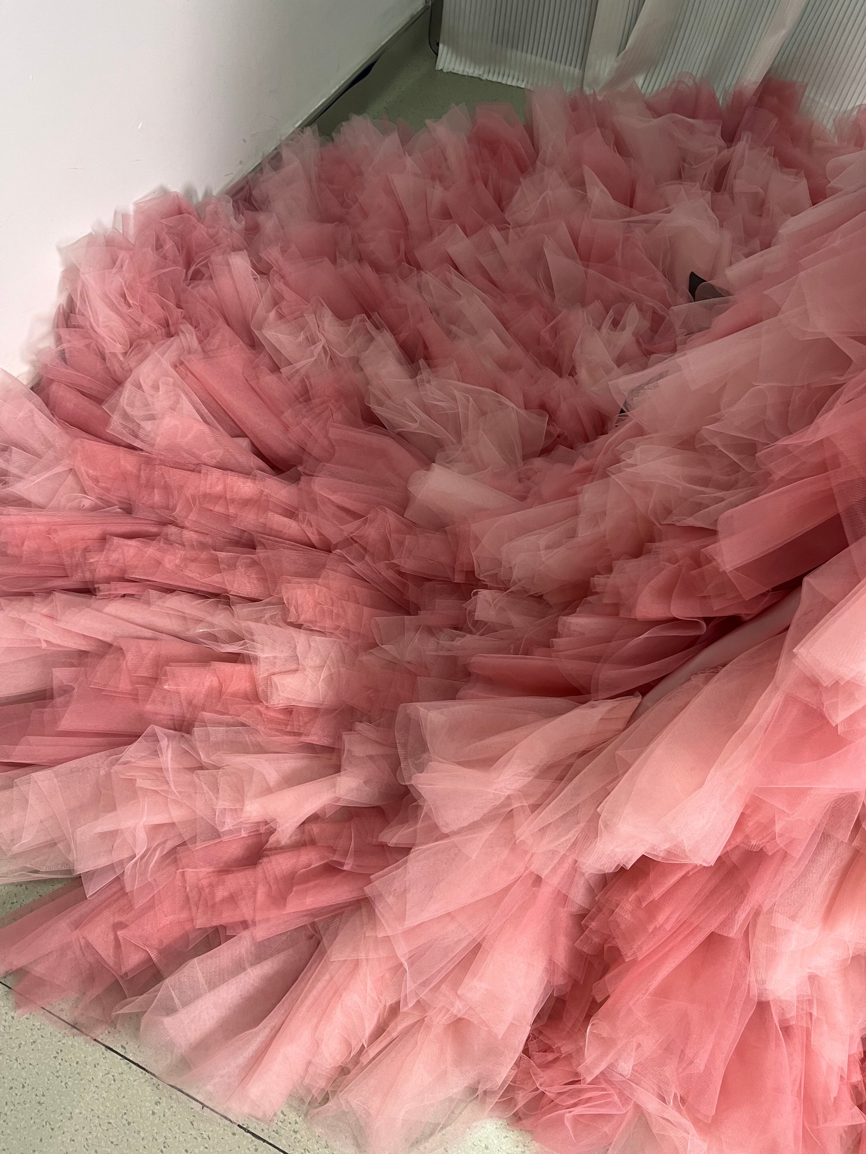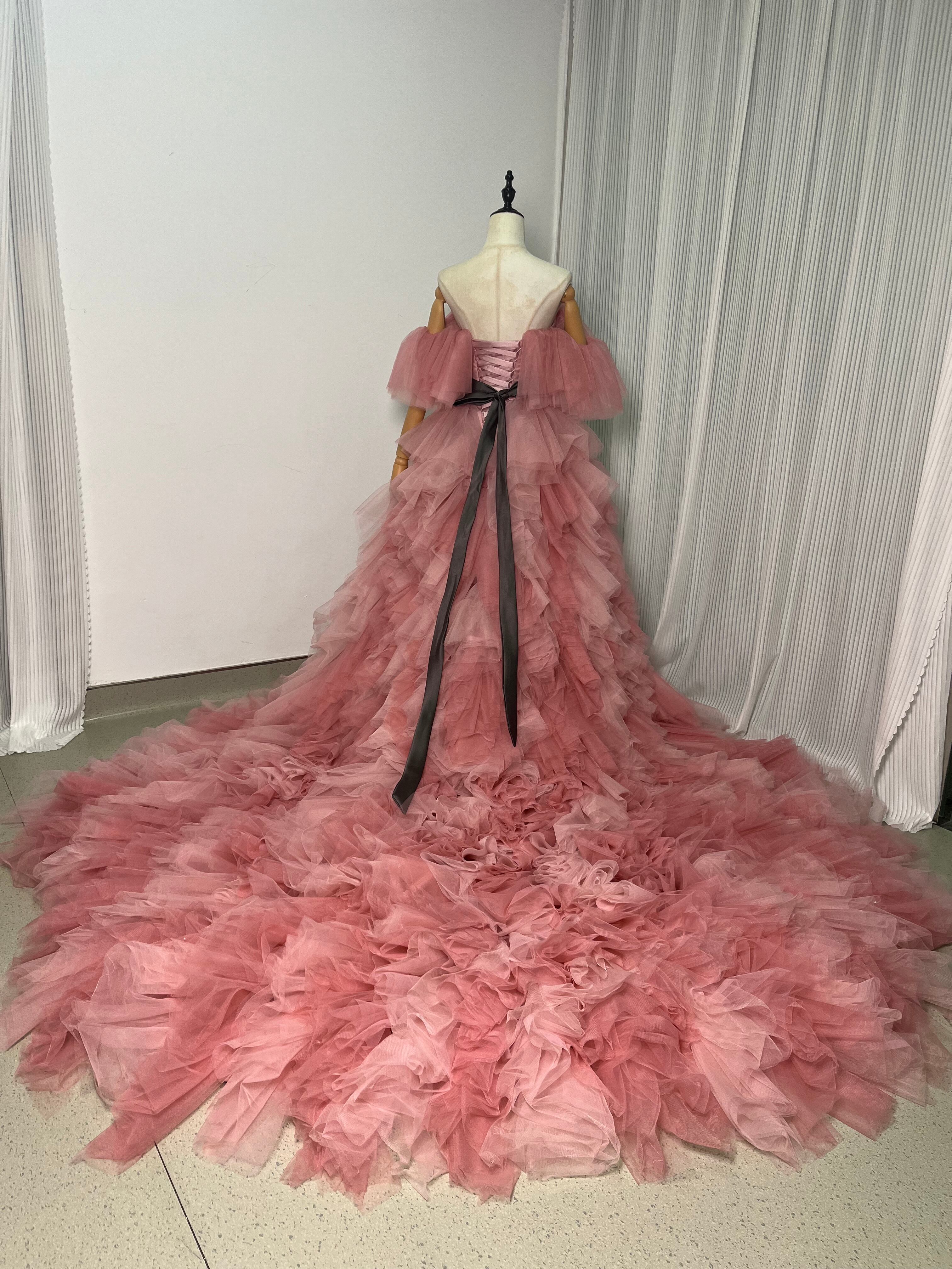 上品!パーティドレス カラードレス ピンク ソフトハートカット 柔らかく重ねたチュールスカート ビスチェドレス ロングトレーン ふっくら柔らか ボリューム感 前撮り パーティ/結婚式