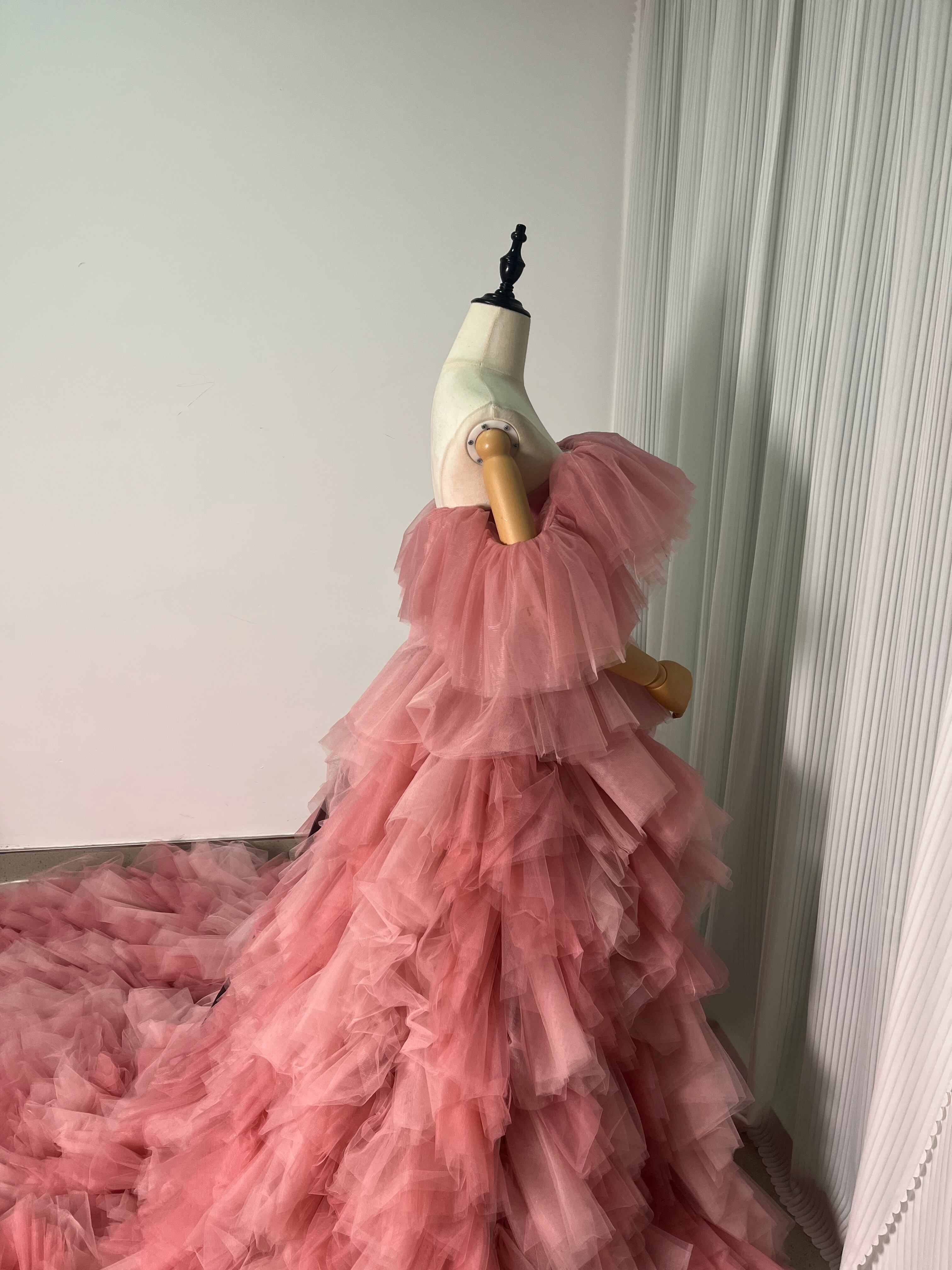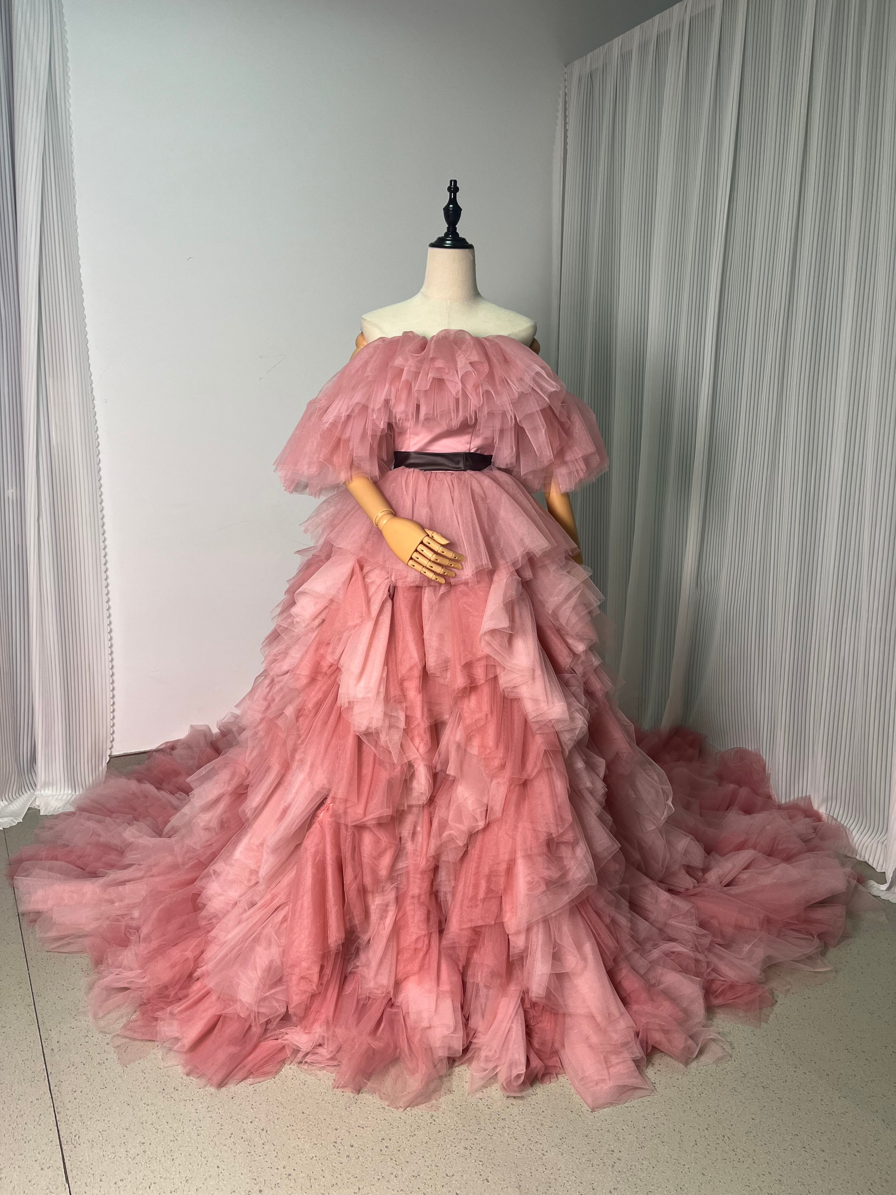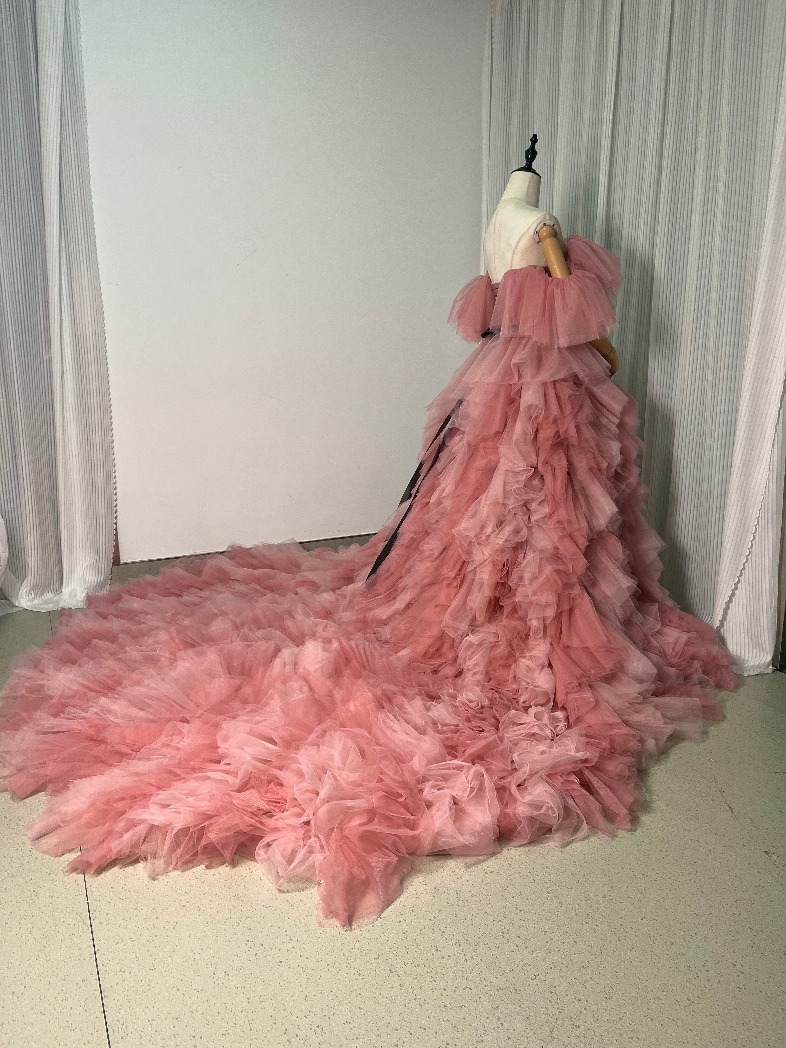 上品!パーティドレス カラードレス ピンク ソフトハートカット 柔らかく重ねたチュールスカート ビスチェドレス ロングトレーン ふっくら柔らか ボリューム感 前撮り パーティ/結婚式