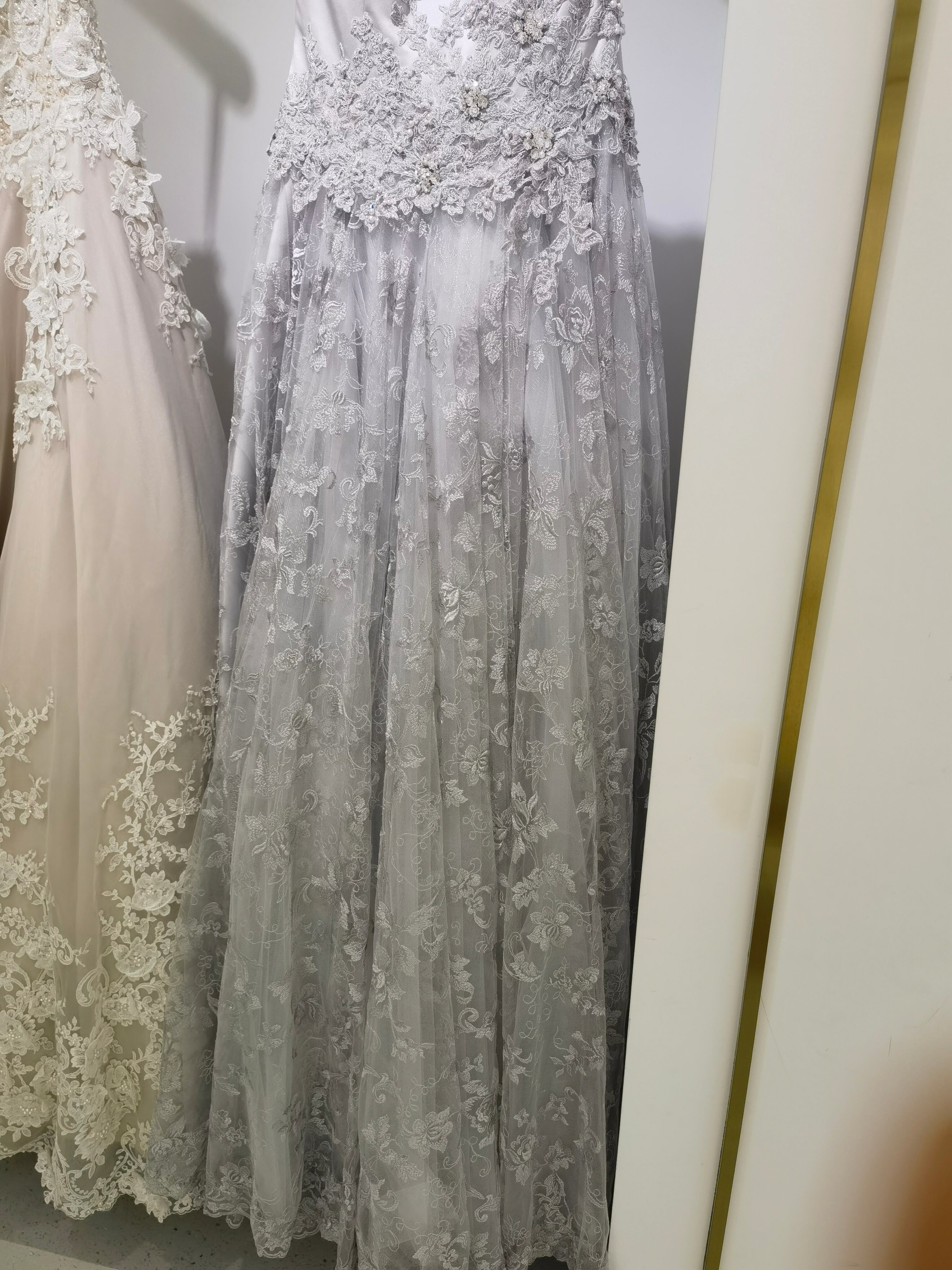 高品質! シルバー 3D立体レース刺繍 ベアトップ カラードレス 床付く