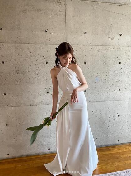 送料無料!ウエディングドレス ホルターネック ドレスのみ 美しい キャミソール 背中見せ/バックレス 優雅なシルエット 細見えシルエット かわいい フロントスリット トレーン/ロング(ご指定自由)!前撮り パーティー/披露宴/結婚式/花嫁/二次会 | David1021k Dress(ダヴィドレス)
