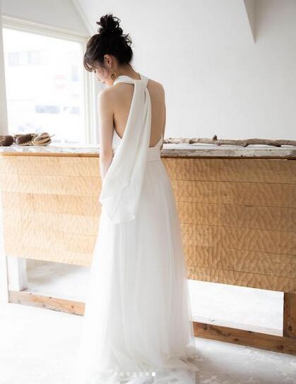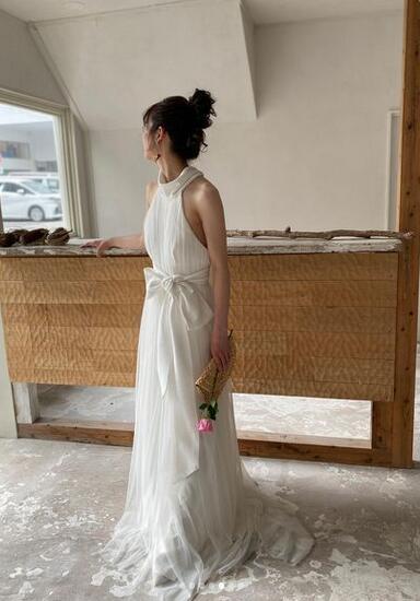 送料無料!ウエディングドレス ホルターネック ソフトチュール 美しい キャミソール 背中見せ/バックレス リボン かわいい フロントスリット トレーン/ロング(ご指定自由)!前撮り パーティー/披露宴/結婚式/花嫁/二次会 | David1021k Dress(ダヴィドレス)
