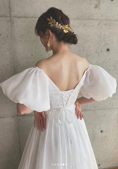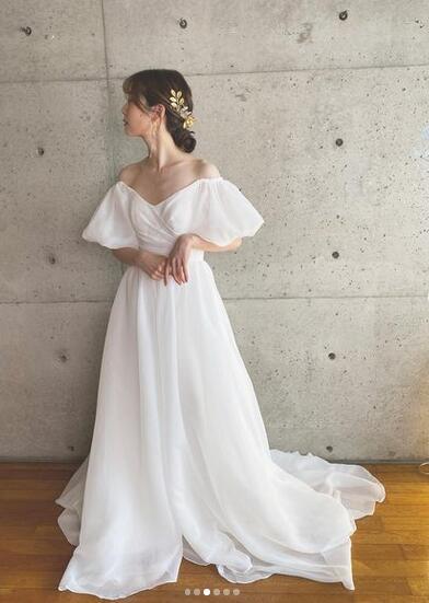 送料無料!ウエディングドレス オフショルダー ソフトチュール 美しい パフスリープ 背中見せ/バックレス Vネック かわいい フロントスリット トレーン/ロング(ご指定自由)!前撮り パーティー/披露宴/結婚式/花嫁/二次会 | David1021k Dress(ダヴィドレス)