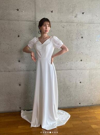 送料無料!ウエディングドレス Vネック エレガント 優雅なシルエット 高級サテン 美しい パフスリープ 背中見せ/バックレス かわいい トレーン/ロング(ご指定自由)!前撮り パーティー/披露宴/結婚式/花嫁/二次会 | David1021k Dress(ダヴィドレス)
