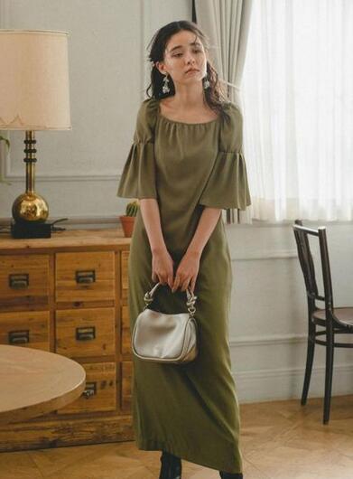 エレガント!カラードレス Vネック 美しい グリーン フリル袖 ベルスリーブ 優雅なシルエット かわいい トレーン/ロング(ご指定自由)!前撮り パーティー/披露宴/結婚式/花嫁/二次会 | David1021k Dress(ダヴィドレス)