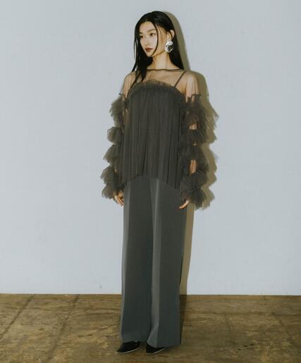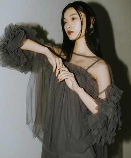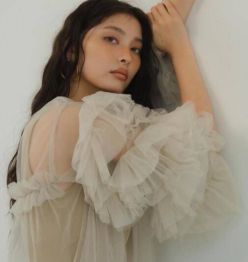 エレガント!チュールトップス フリルスリーブ クラシカル 抜群のおしゃれ見え 美しい ベージュ フリル袖 かわいい 前撮り パーティー/披露宴/結婚式/花嫁/二次会 | David1021k Dress(ダヴィドレス)