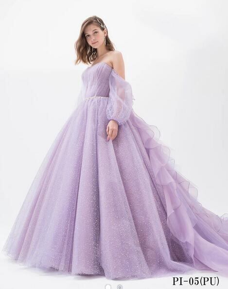 送料無料!カラードレス ラベンダー色 オフショルダー ふっくら柔らかなバックリボン パープル/紫 ソフトチュール エレガント レース プリンセスライン 素敵 パフスリープ かわいい フルオーダー可能 トレーン/ロング(ご指定自由)!前撮り パーティー/披露宴/結婚式/花嫁/二次会 | David1021k Dress(ダヴィドレス)