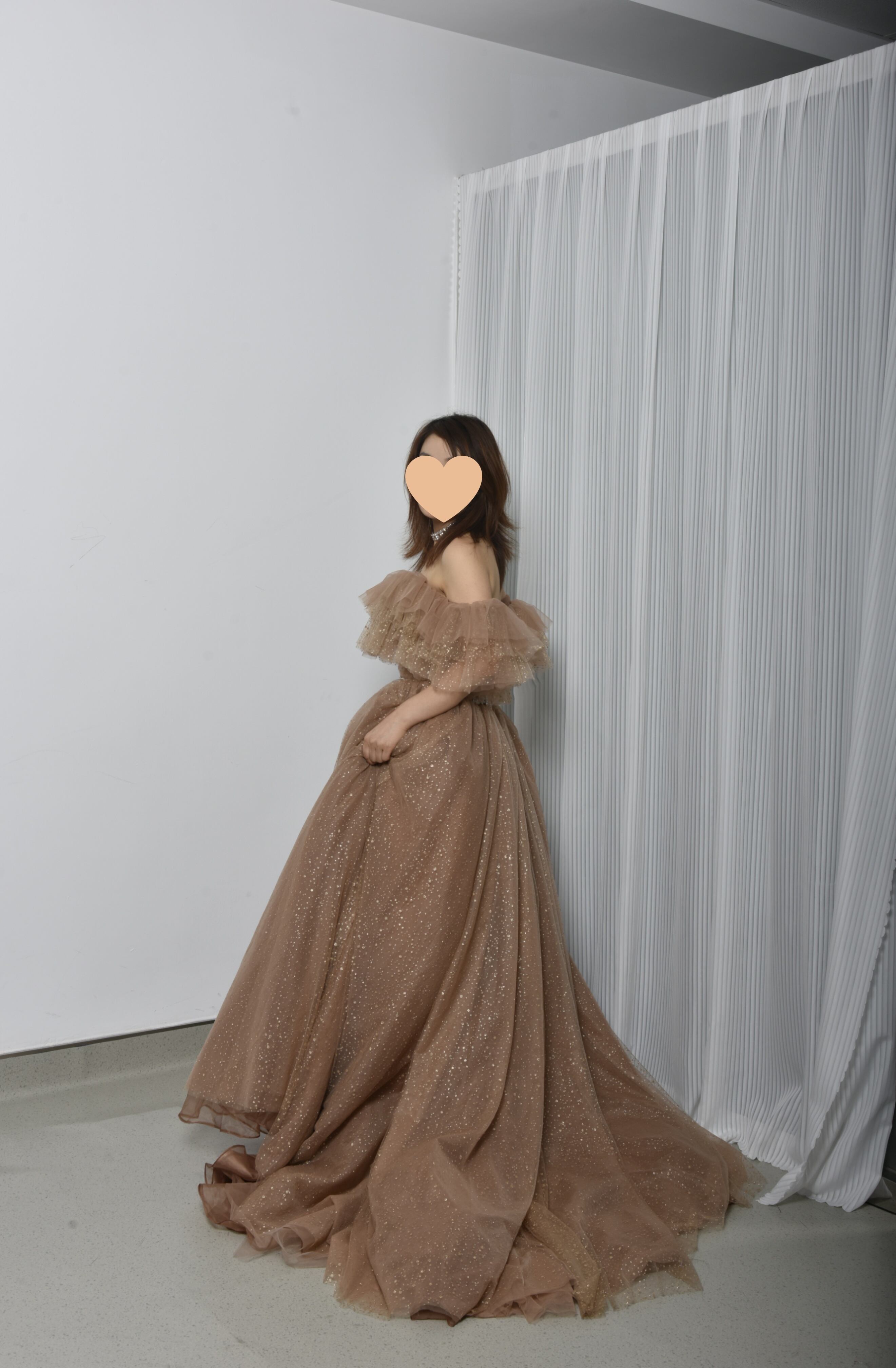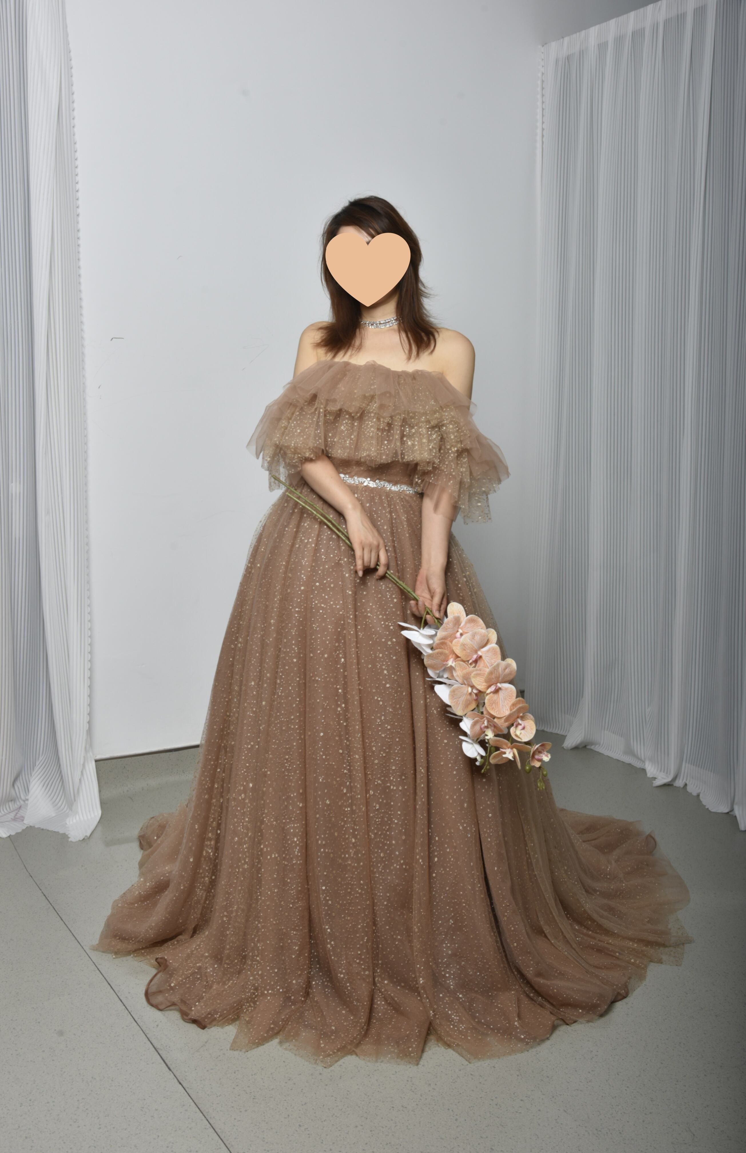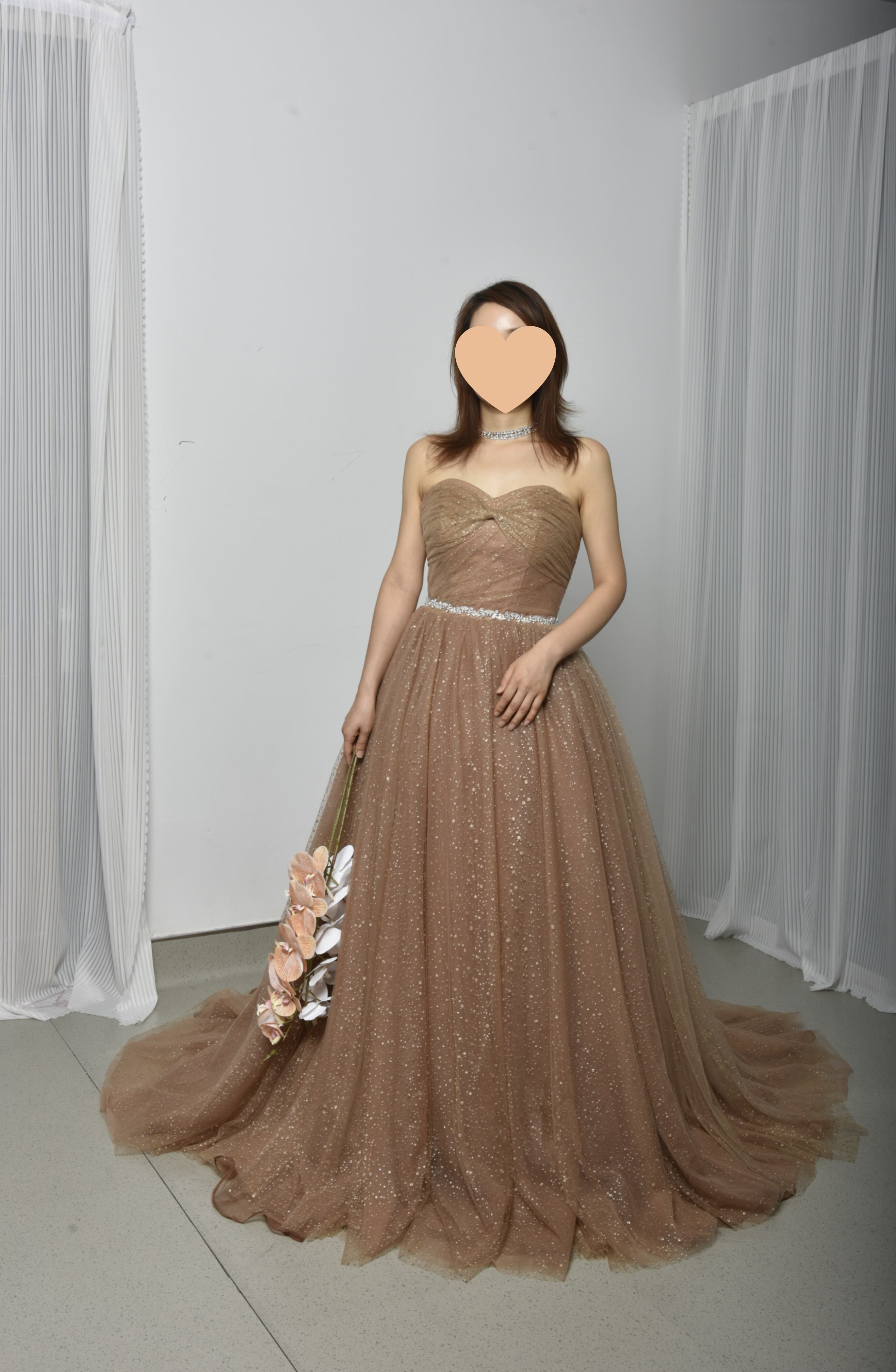 輝きな光彩を放つ ベージュ 取り外しオフショルダー  キラキラグリッターチュール カラードレス 華やかなトレーン /花嫁
