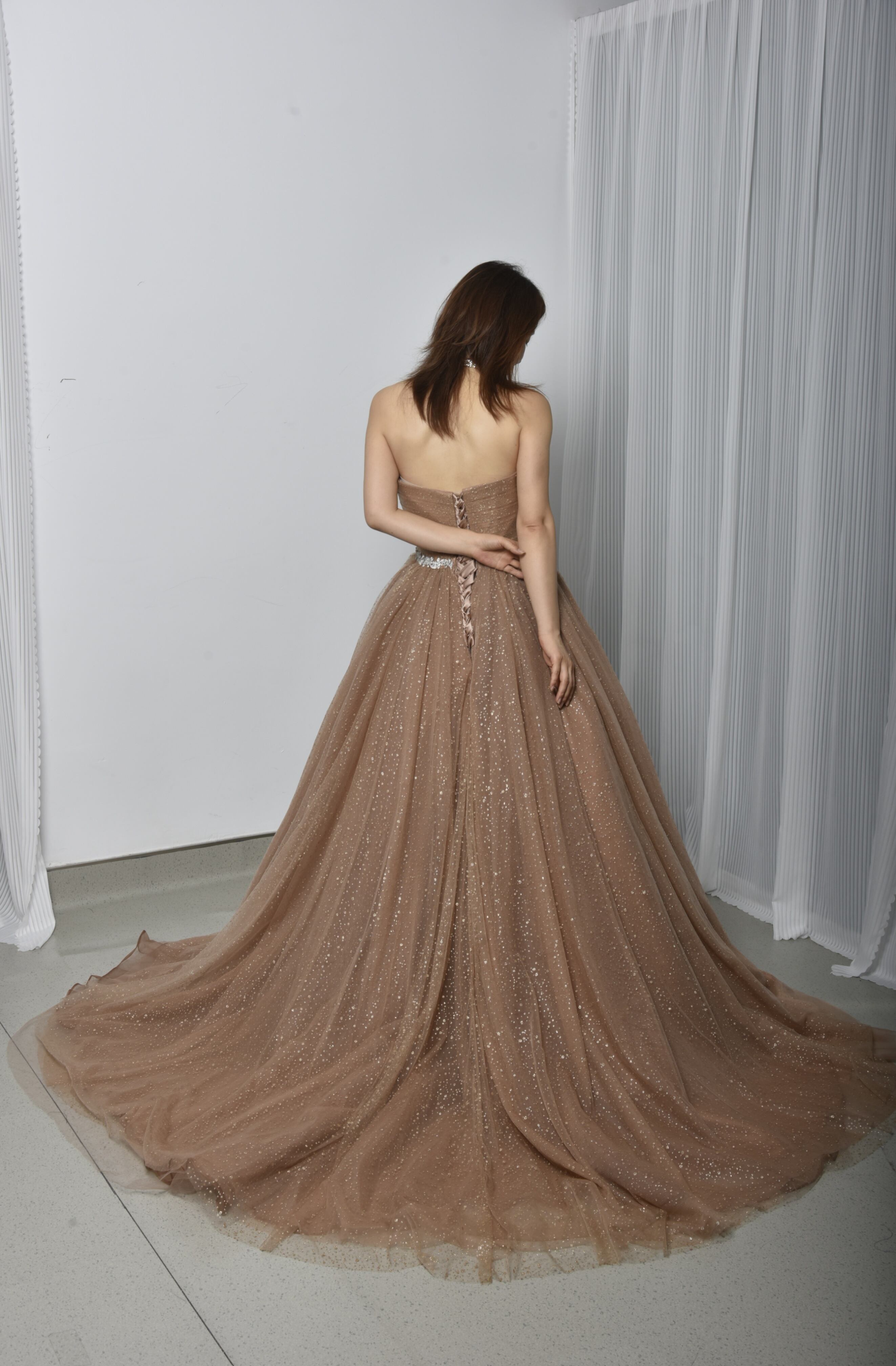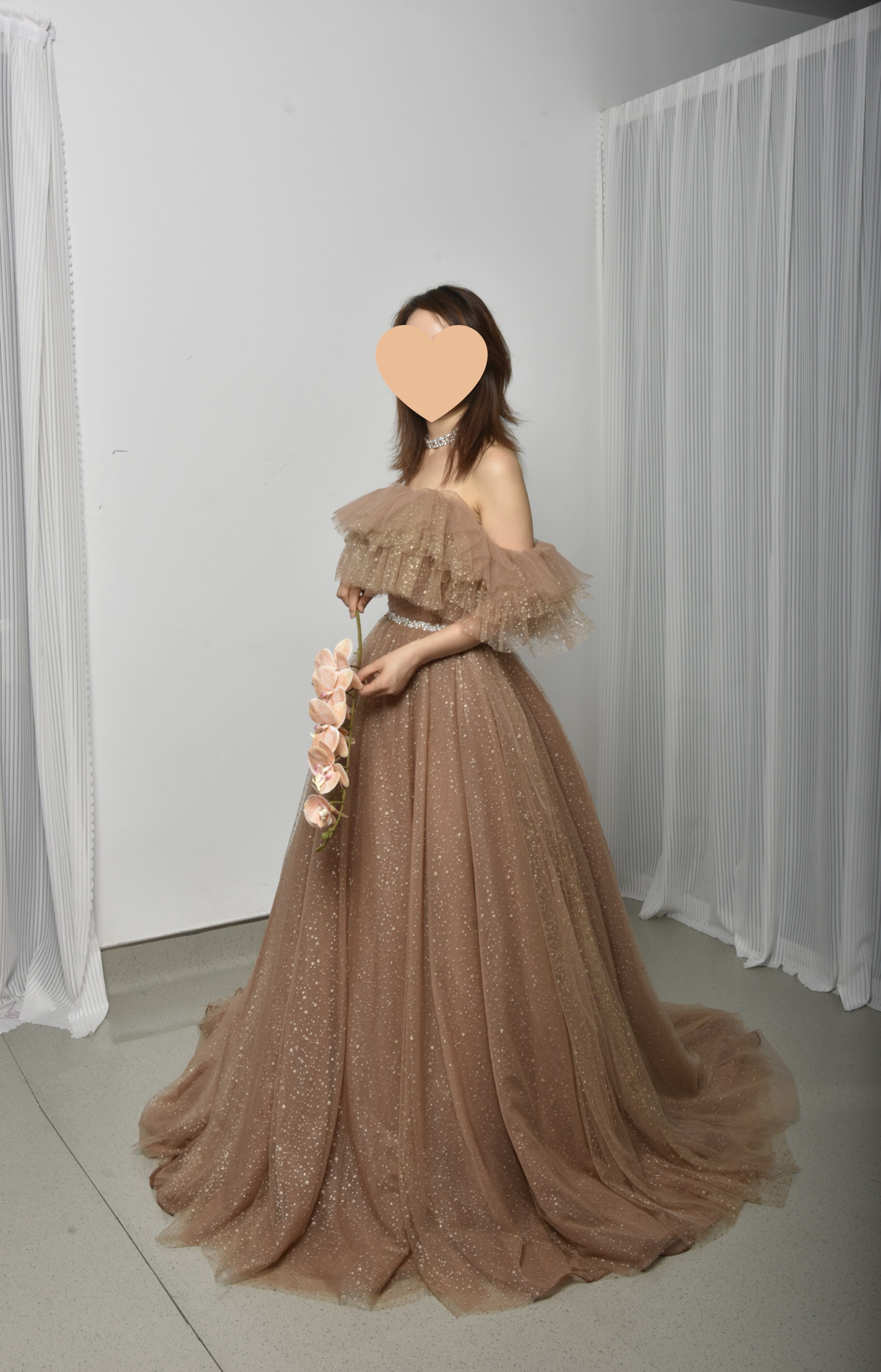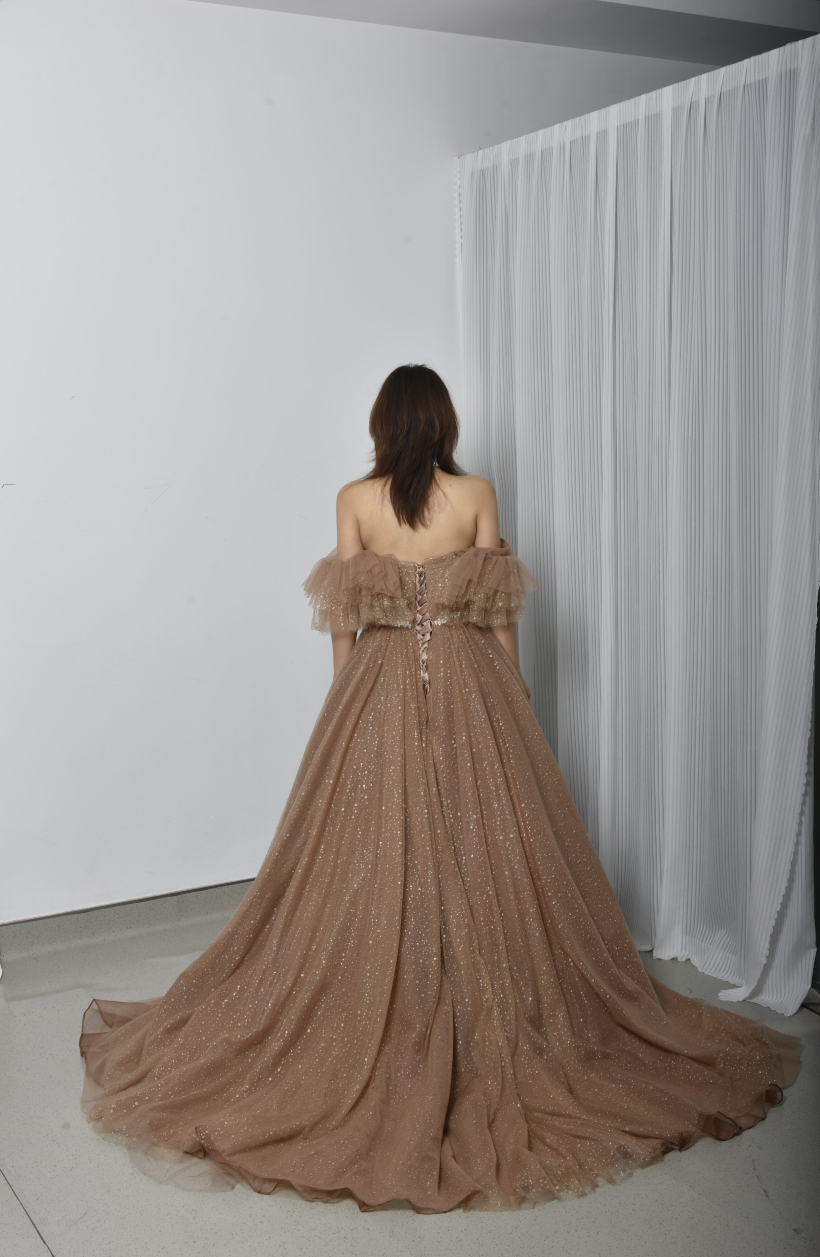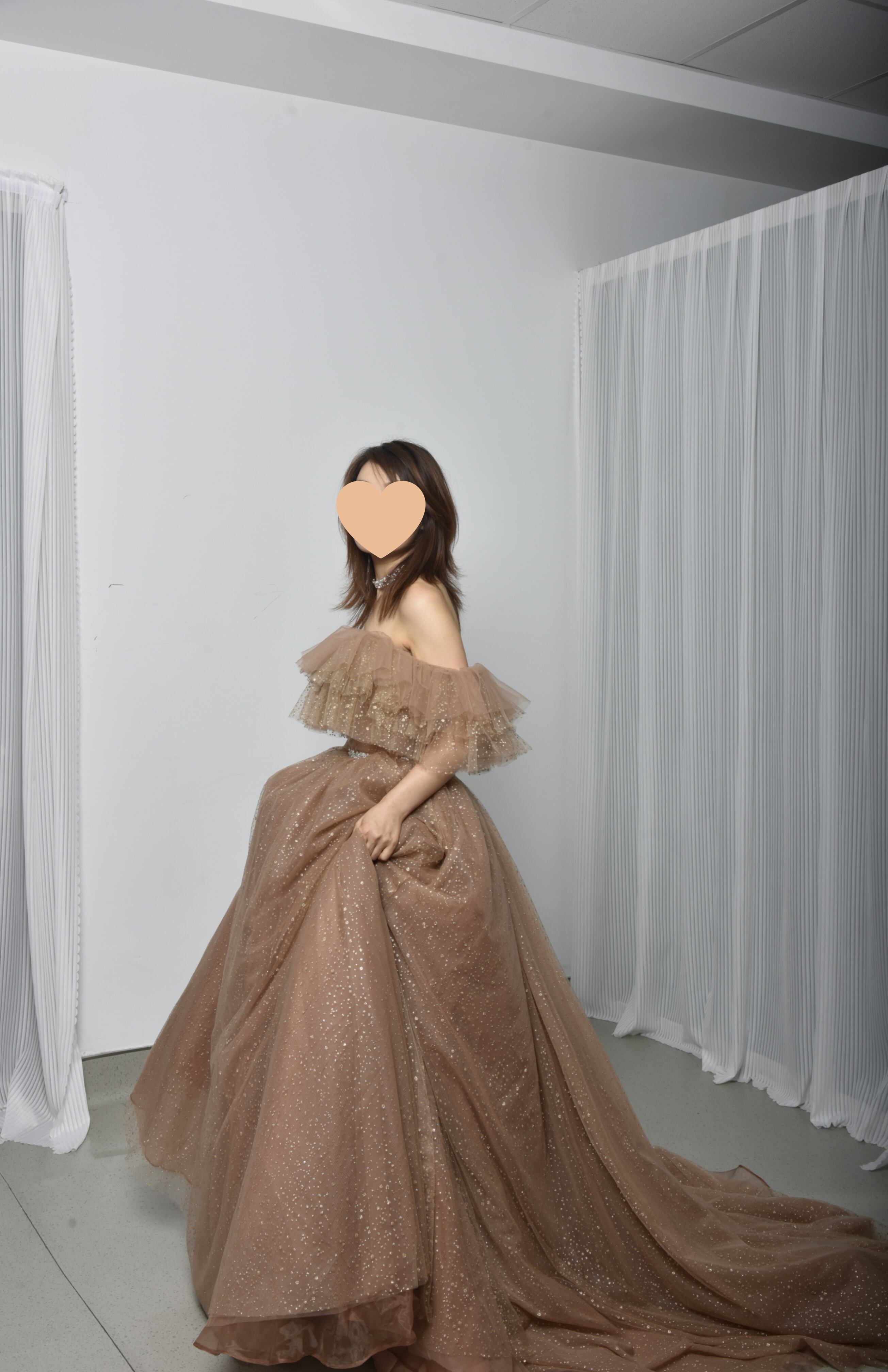輝きな光彩を放つ ベージュ 取り外しオフショルダー  キラキラグリッターチュール カラードレス 華やかなトレーン /花嫁