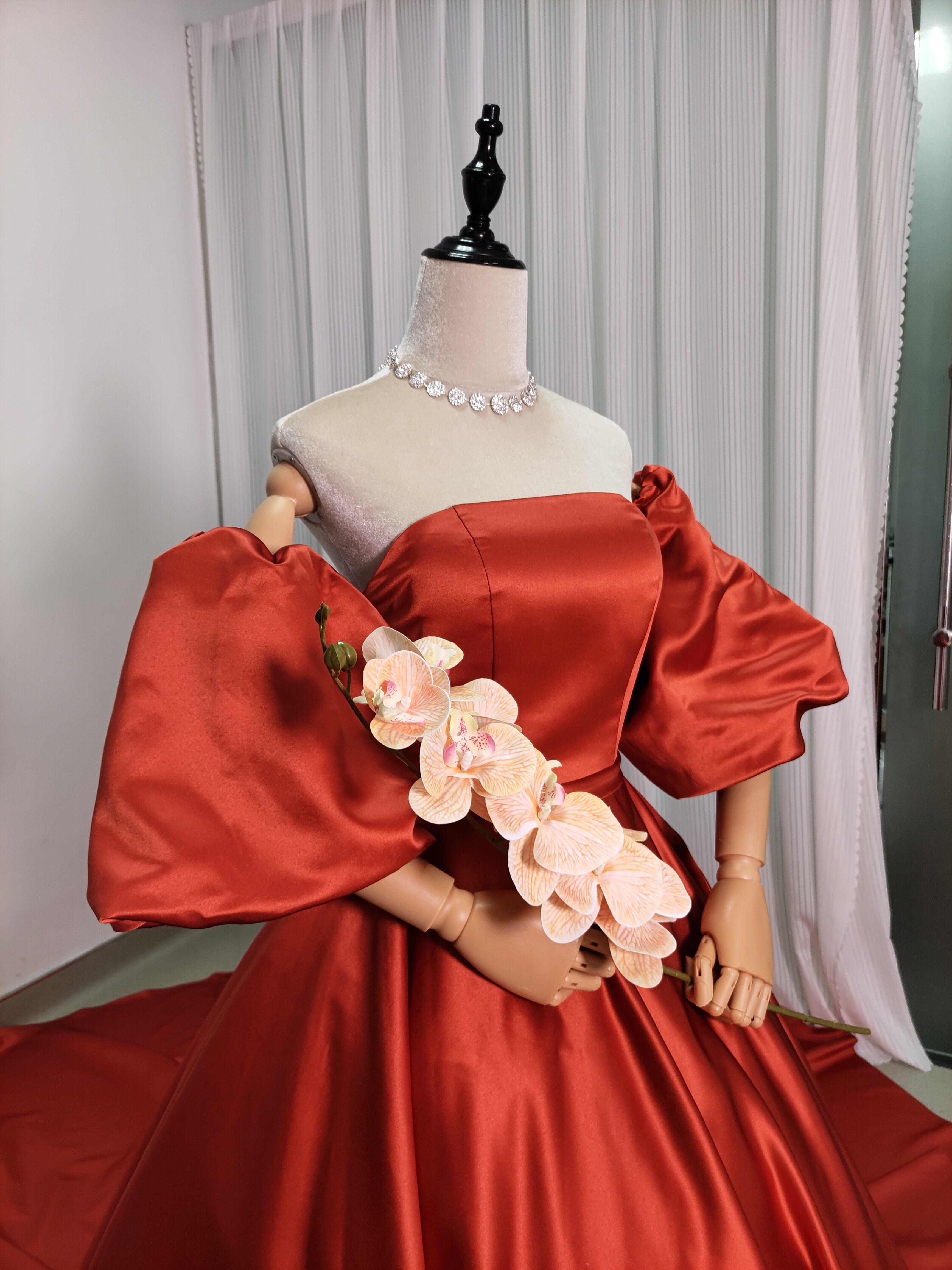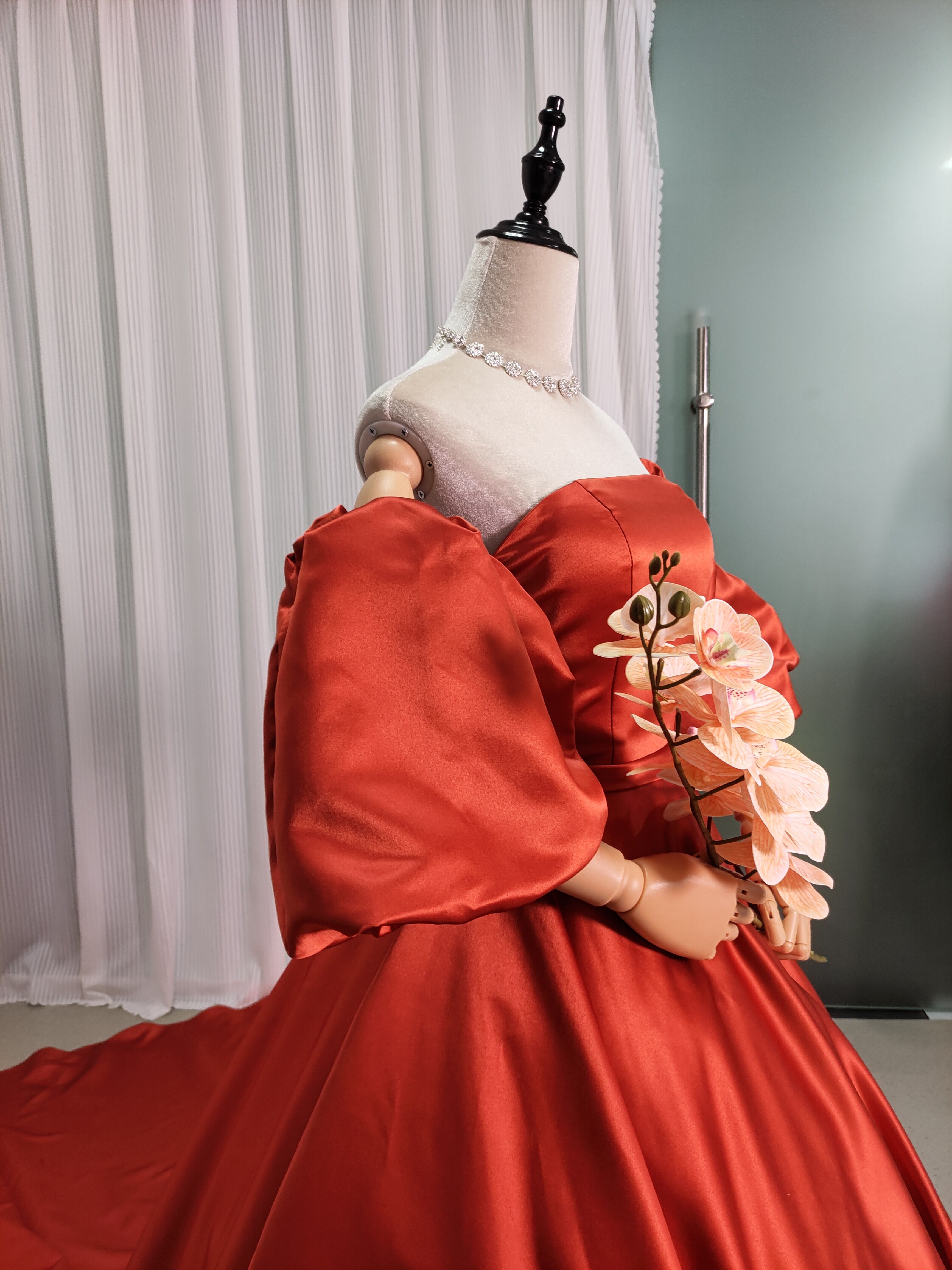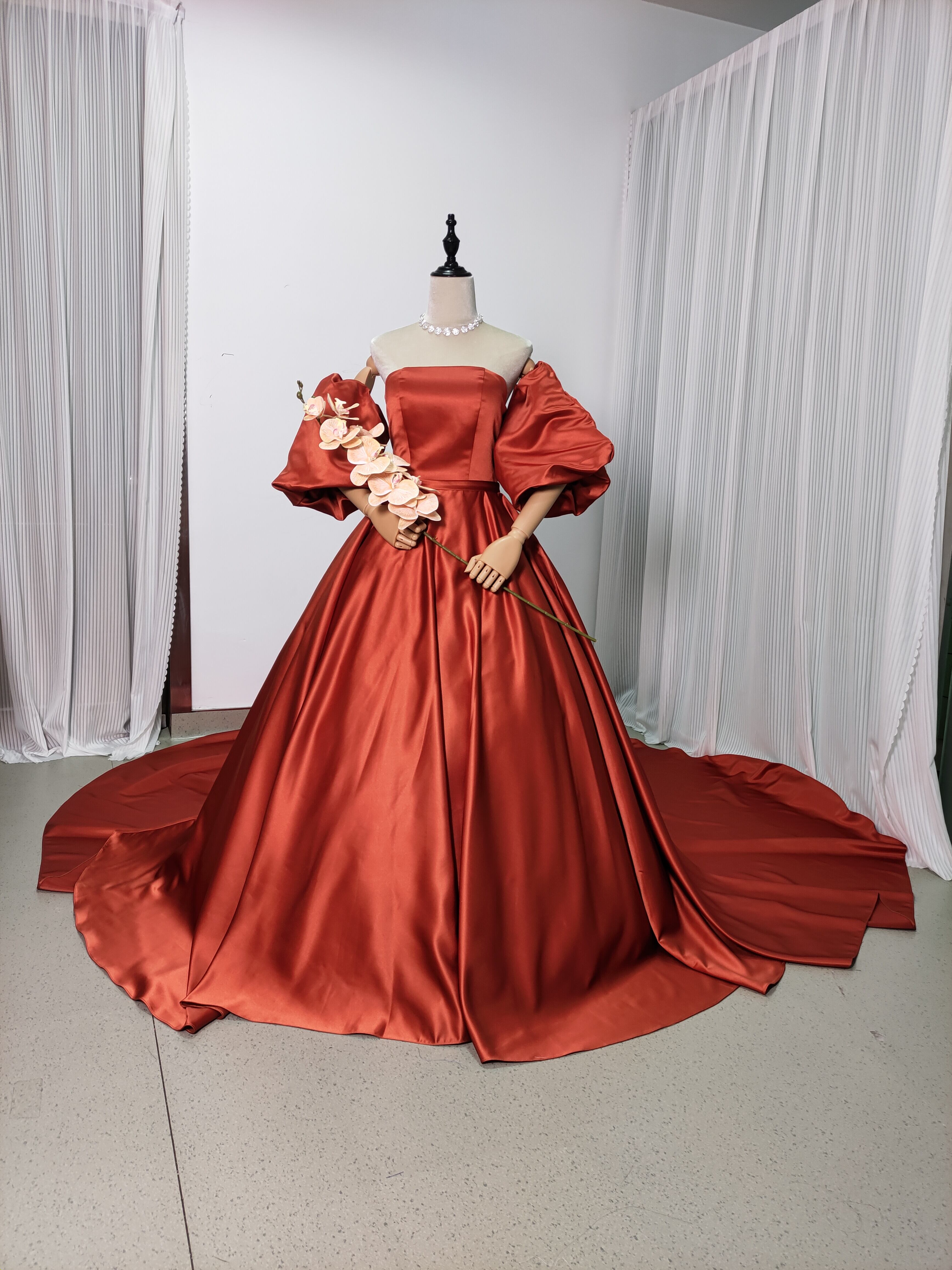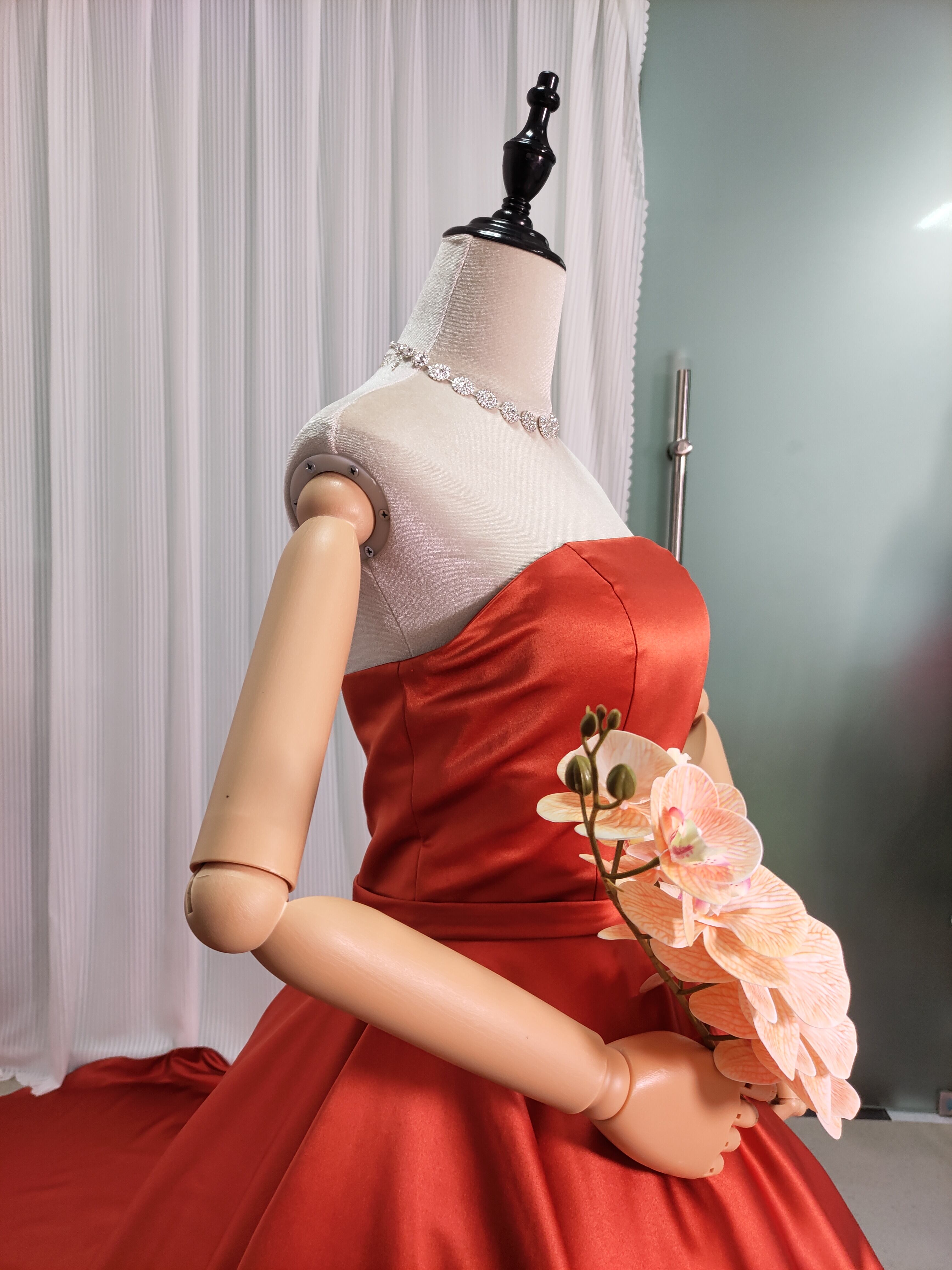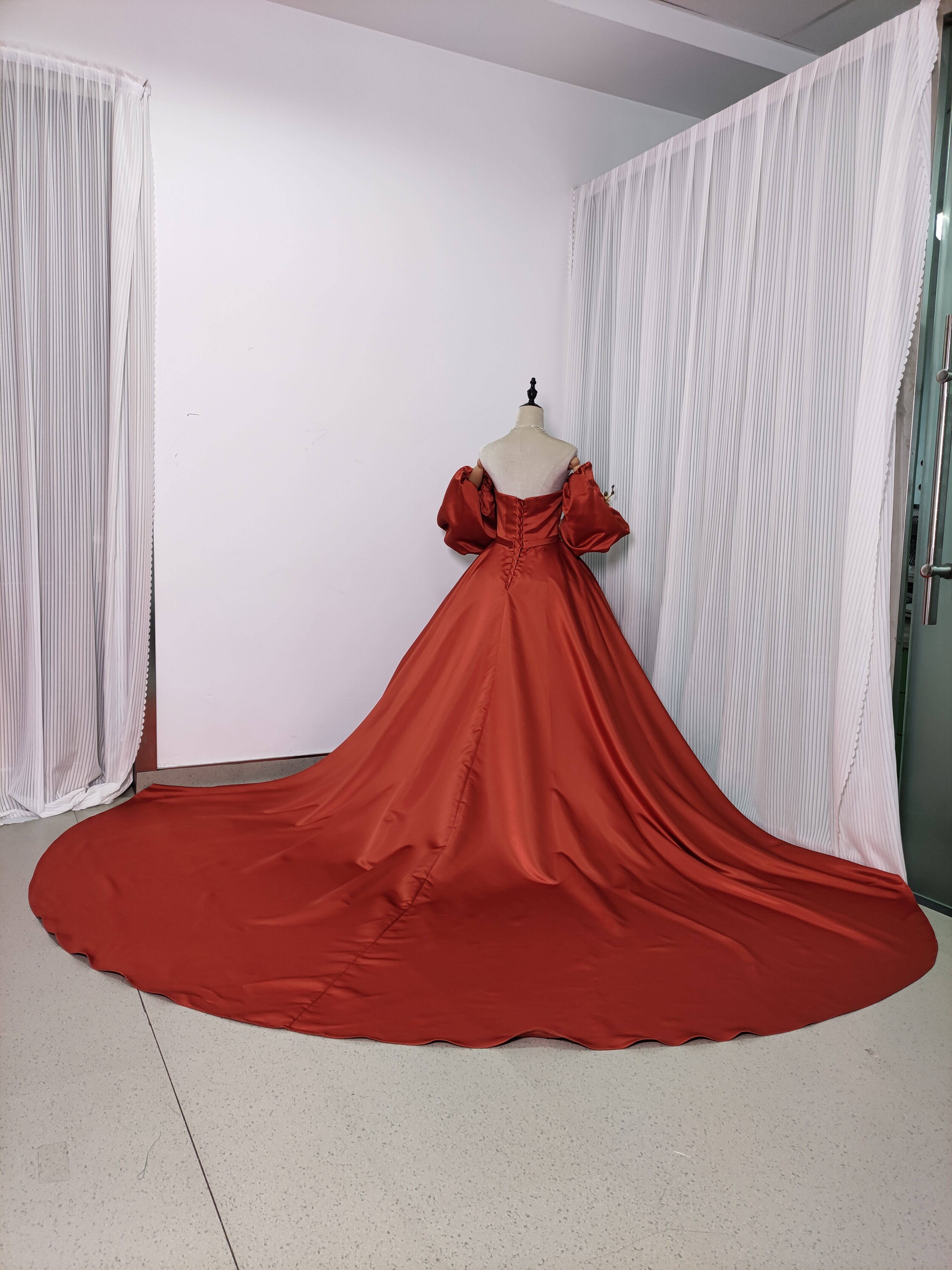 高品質!テラコッタ色 ベアトップ カラードレス 取り外し袖 華やかなトレーン 挙式/前撮り/花嫁/結婚式/