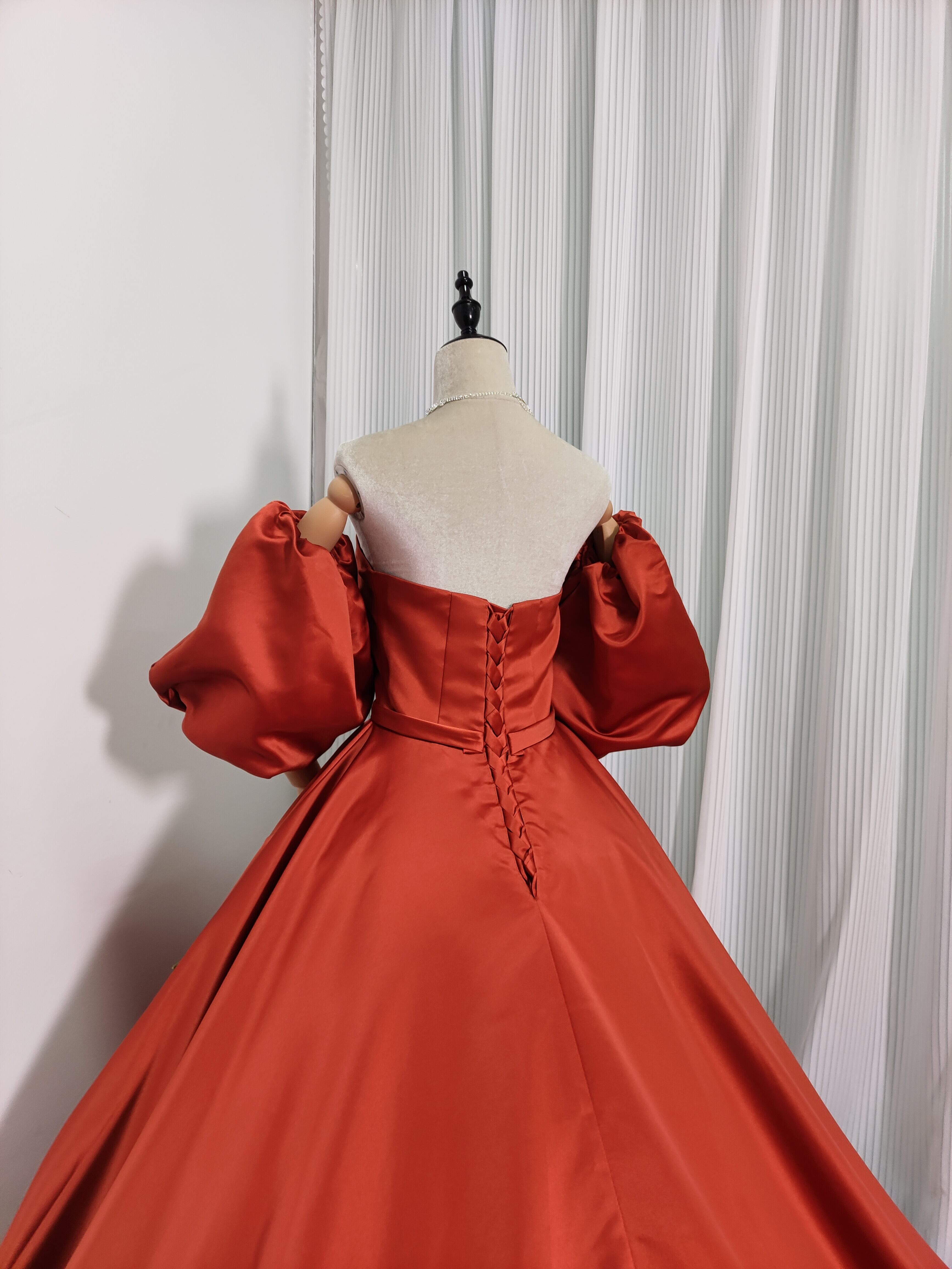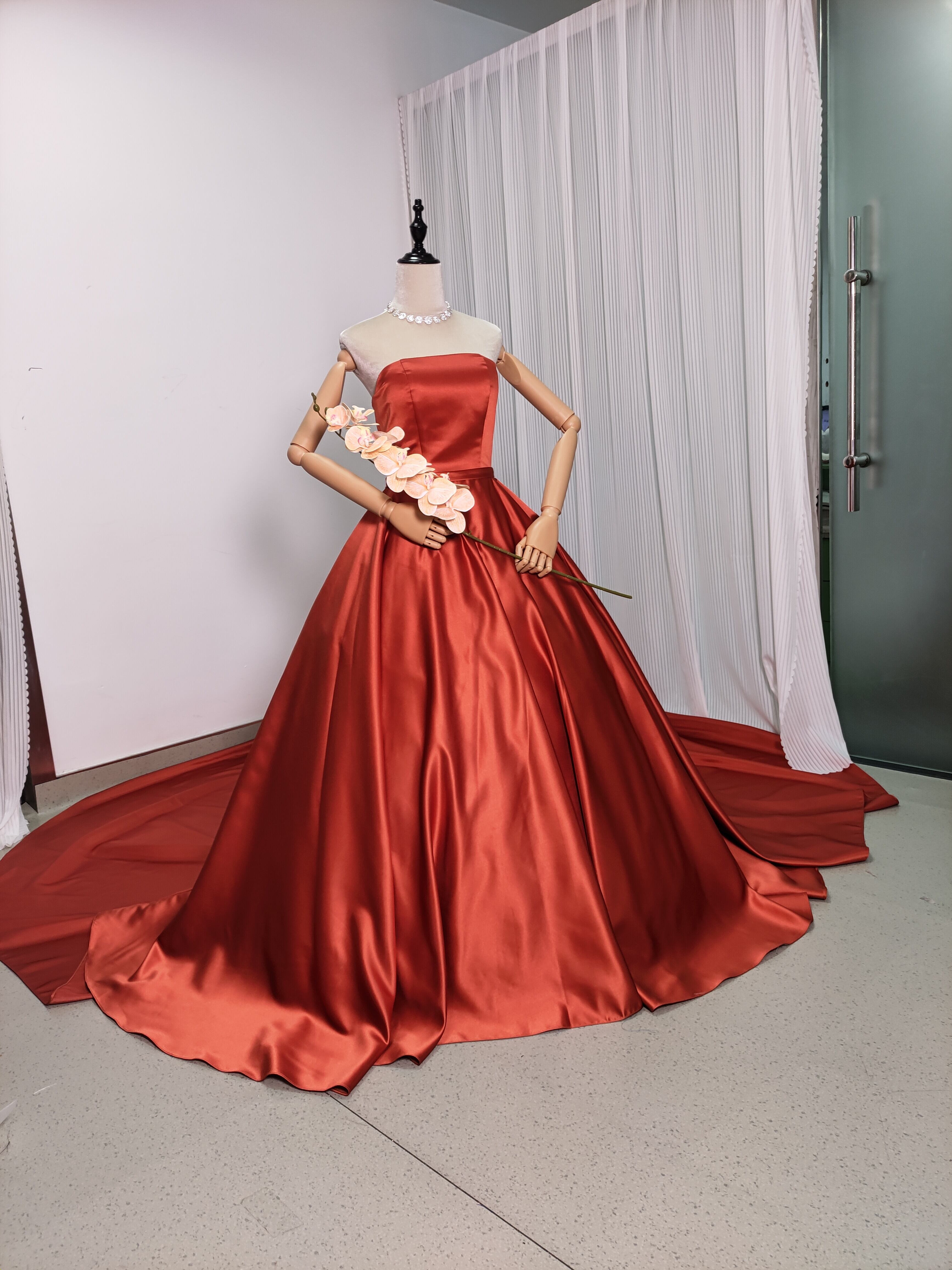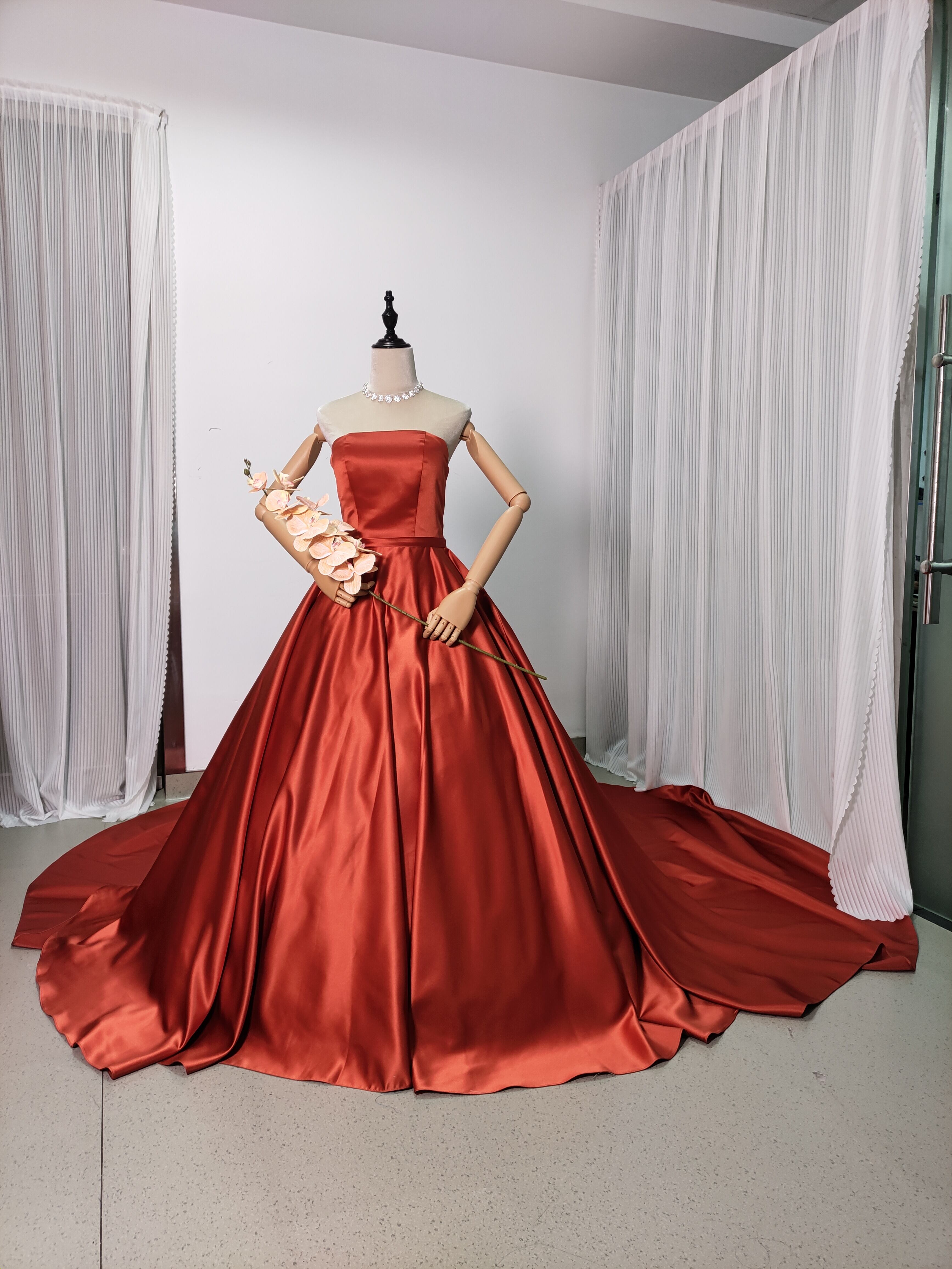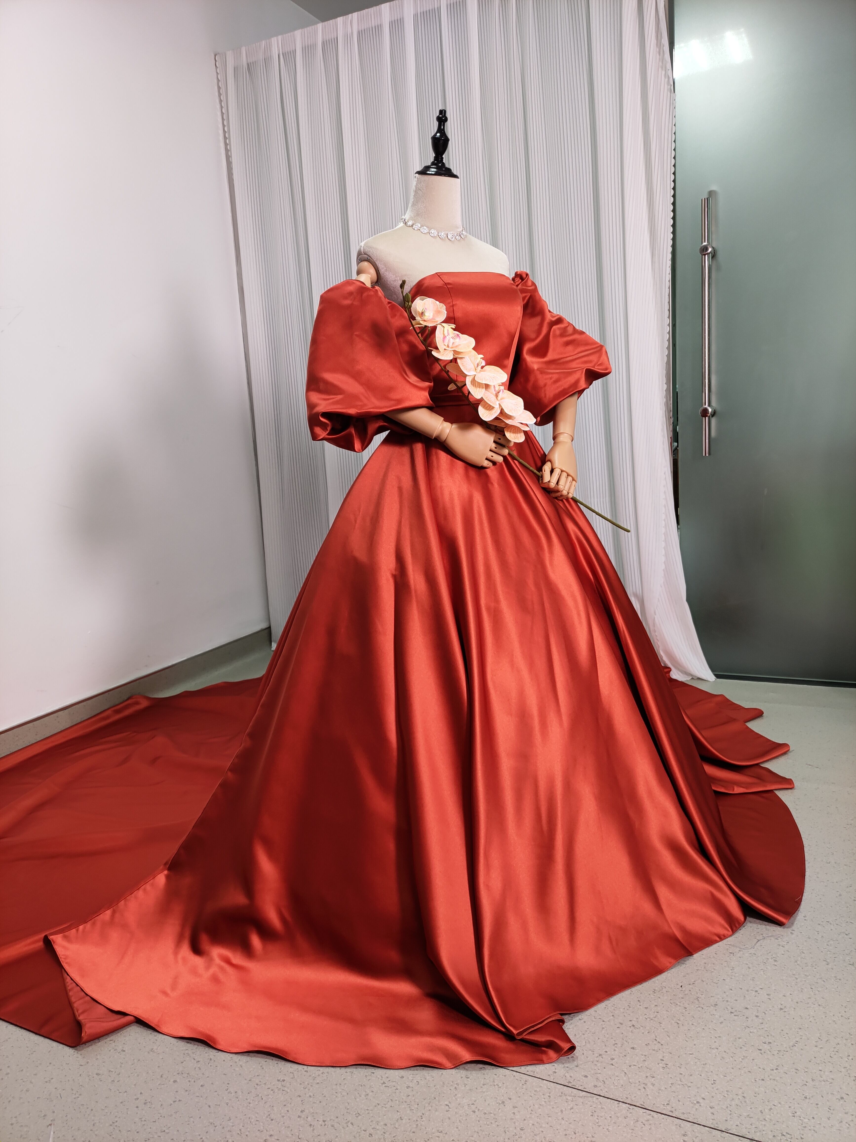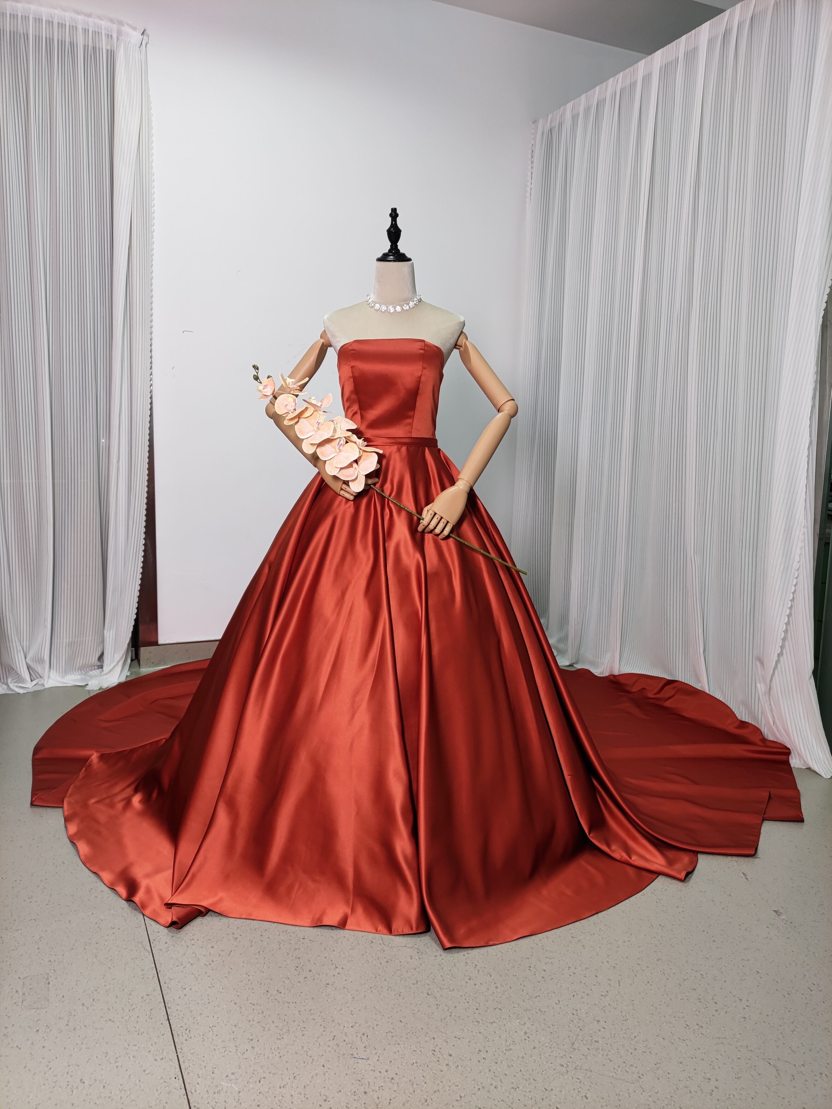 高品質!テラコッタ色 ベアトップ カラードレス 取り外し袖 華やかなトレーン 挙式/前撮り/花嫁/結婚式/