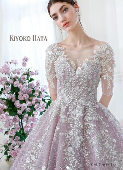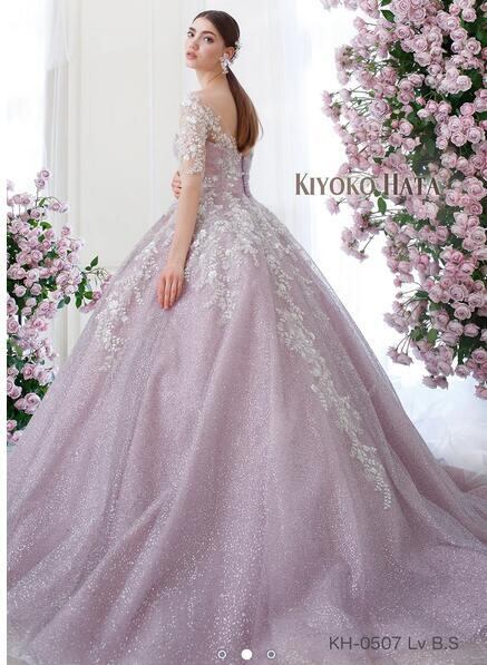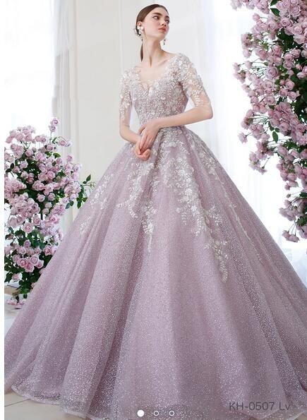送料無料!人気上昇!カラードレス パーティードレス ラベンダー色 パープル/紫 3D立体レース刺繍 華やかなトレーン 結婚式 Vネック オシャレ ソフトチュール ハンドメイド オーダードレス 結婚式/前撮り/二次会 | David1021k Dress(ダヴィドレス)