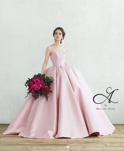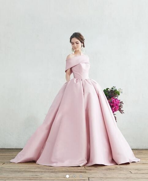 人気上昇!カラードレス 高級サテン 取り外し可能オフショルダー ピンク オシャレ プリンセスライン オーダードレス 結婚式/前撮り/二次会