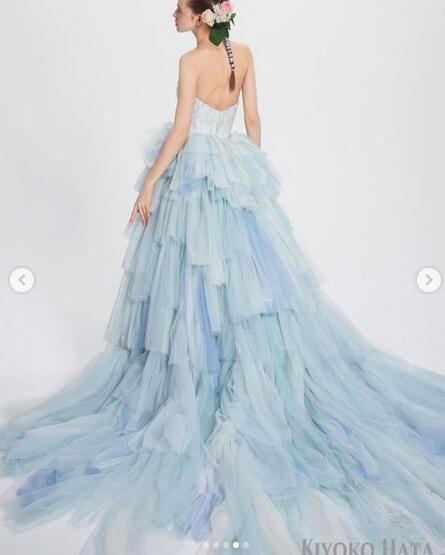 送料無料!カラードレス 爽やかで優しいブルー 取り外し可能オフショルダー ビスチェドレス 柔らかく重ねたチュール パーティドレス 結婚式/前撮り
