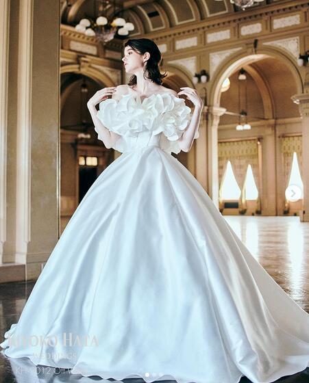 高品質!ウエディングドレス ハートカット 取り外しオフショルダー オシャレ オフホワイト プリンセスライン オーダードレス 結婚式/前撮り 披露宴/ステージ/演奏ドレス 高級サテン | David1021k Dress(ダヴィドレス)