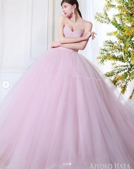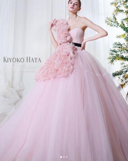 送料無料!ピンクカラードレス 取り外し可能3Dフラワー ビスチェドレス オシャレ 柔らかく重ねたチュール オーダードレス サッシュベルト 結婚式/前撮り パーティドレス 披露宴