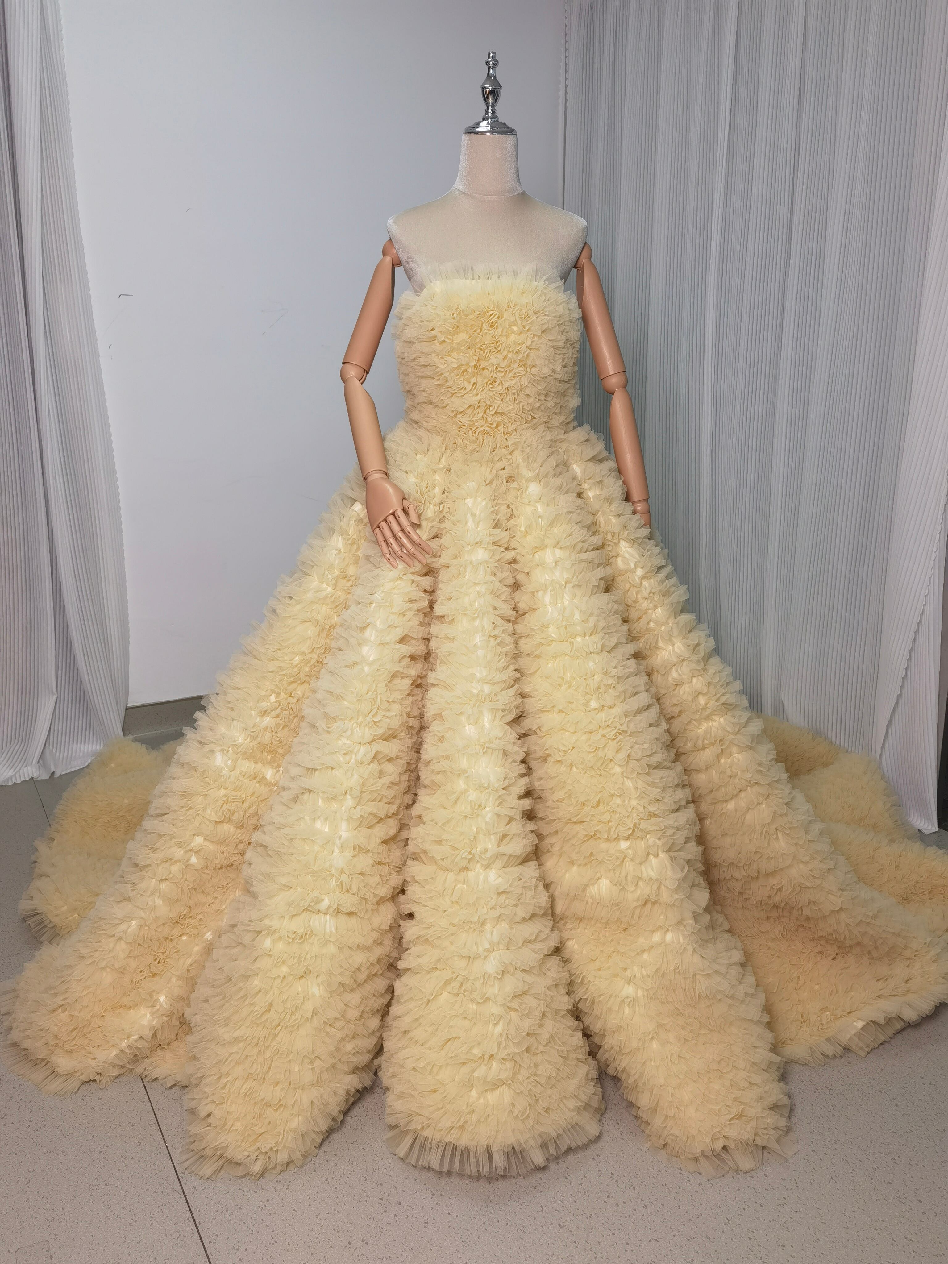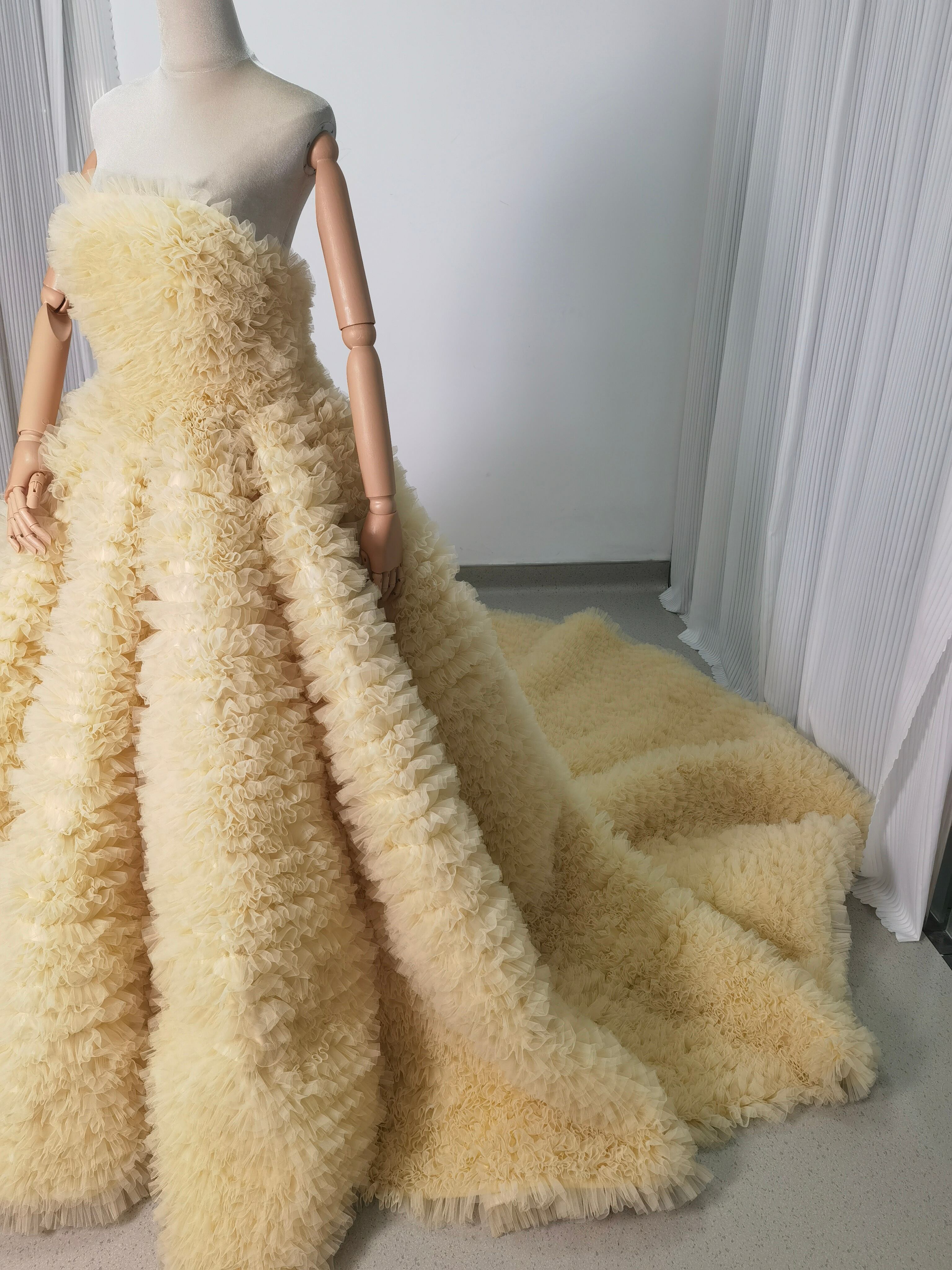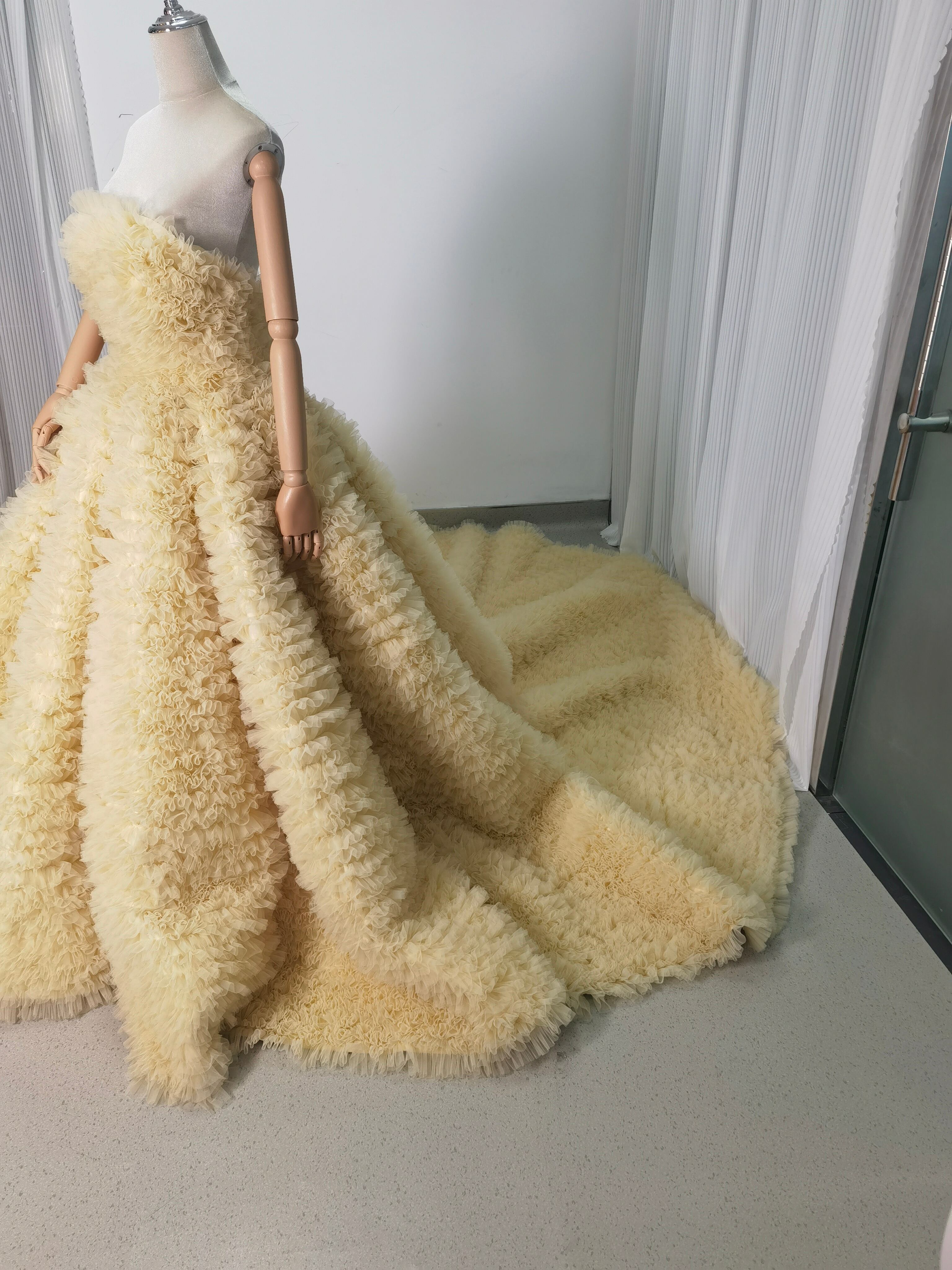 送料無料!パステルイエロー カラードレス もこもこドレス オフショルダー オシャレ プリンセスライン オーダードレス パーティドレス 結婚式/前撮り/二次会/ステージ/豪華な演奏ドレス