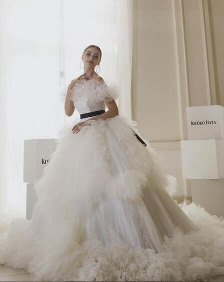 高品質!ウエディングドレス サッシュベルト オシャレ キラキラチュール ボリューミー オフショルダー オーダードレス ソフトチュール 結婚式/前撮り 披露宴 | David1021k Dress(ダヴィドレス)