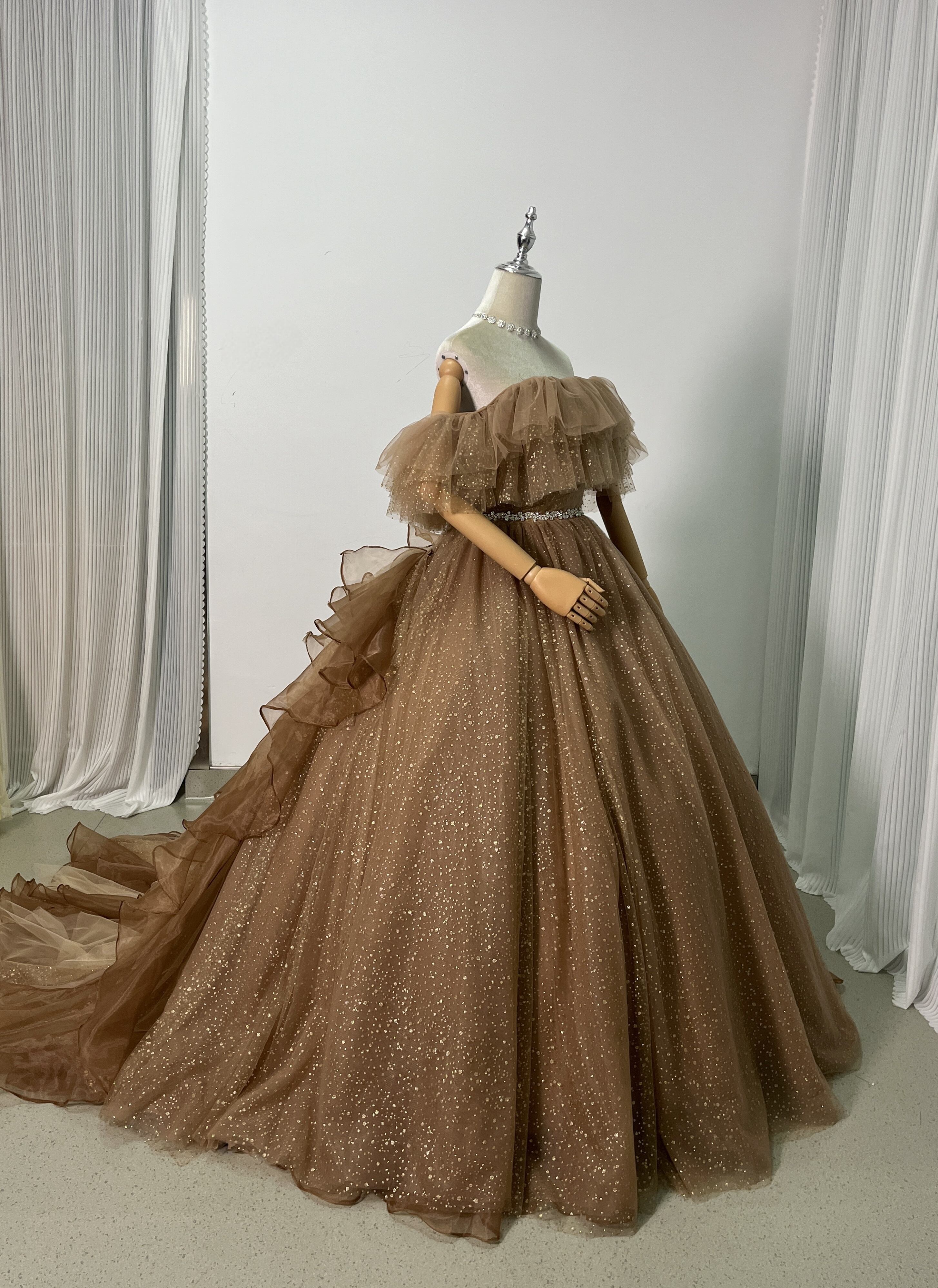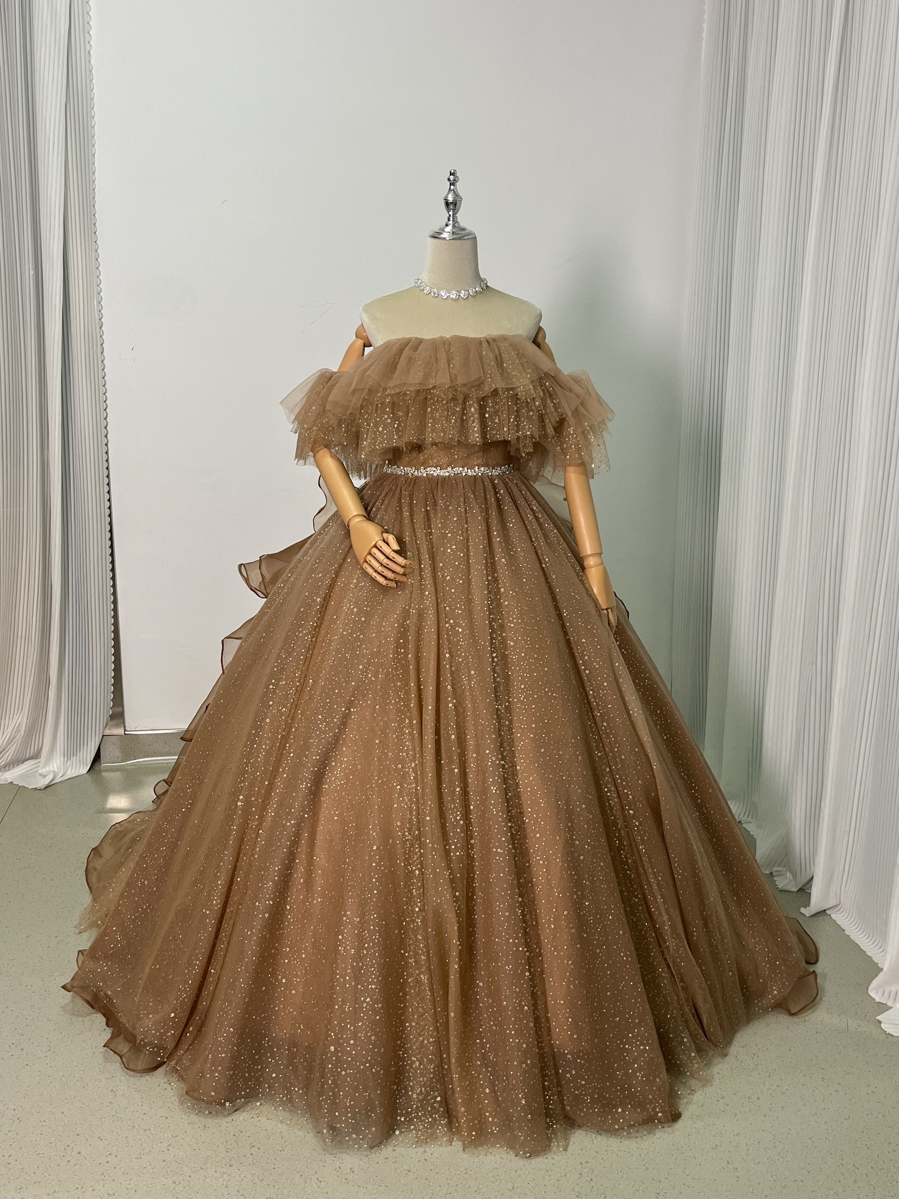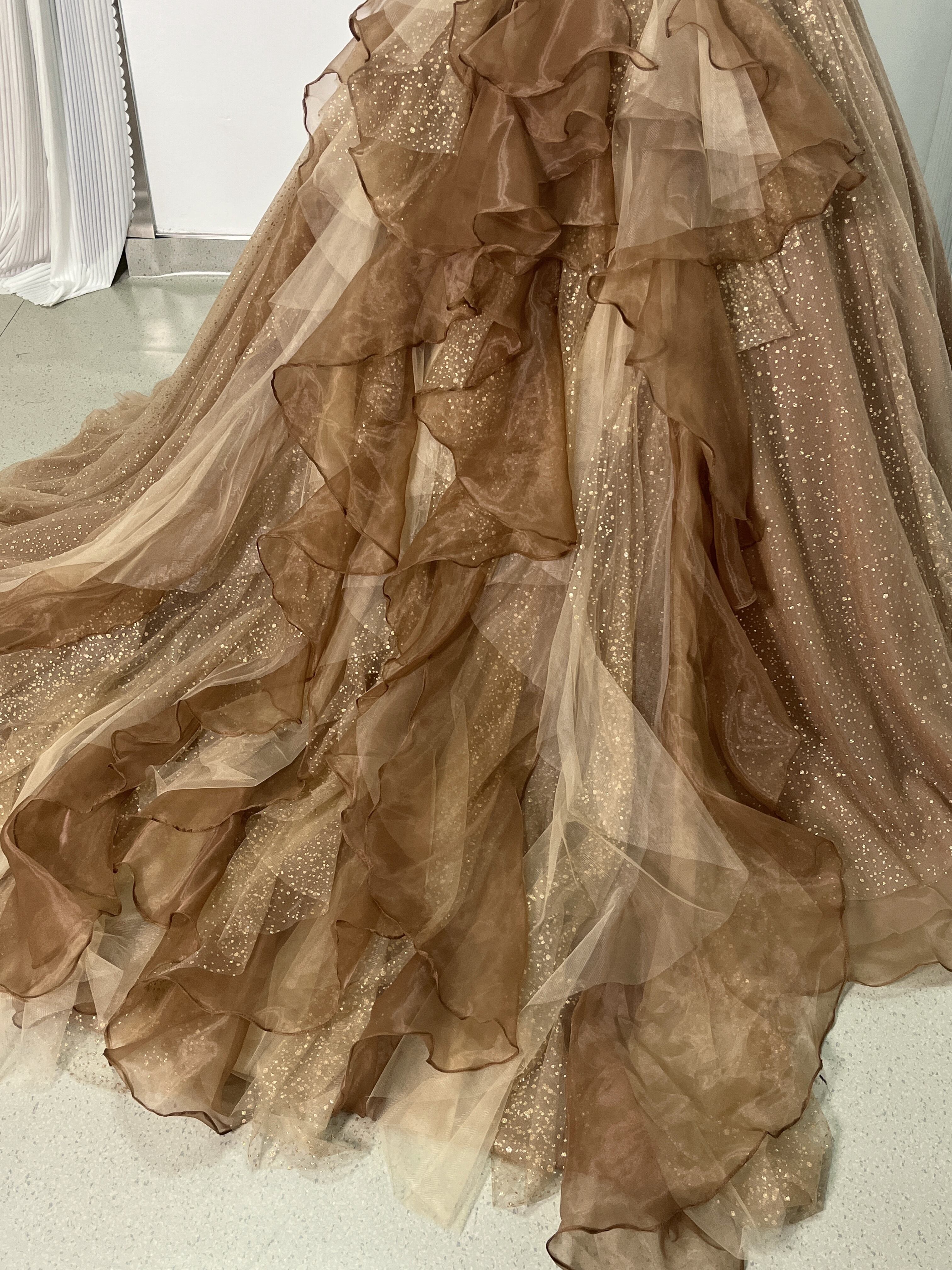 輝きな光彩を放つ ベージュ 取り外しオフショルダー ベアトップ キラキラグリッターチュール カラードレス ふっくら柔らかなバックリボン /花嫁