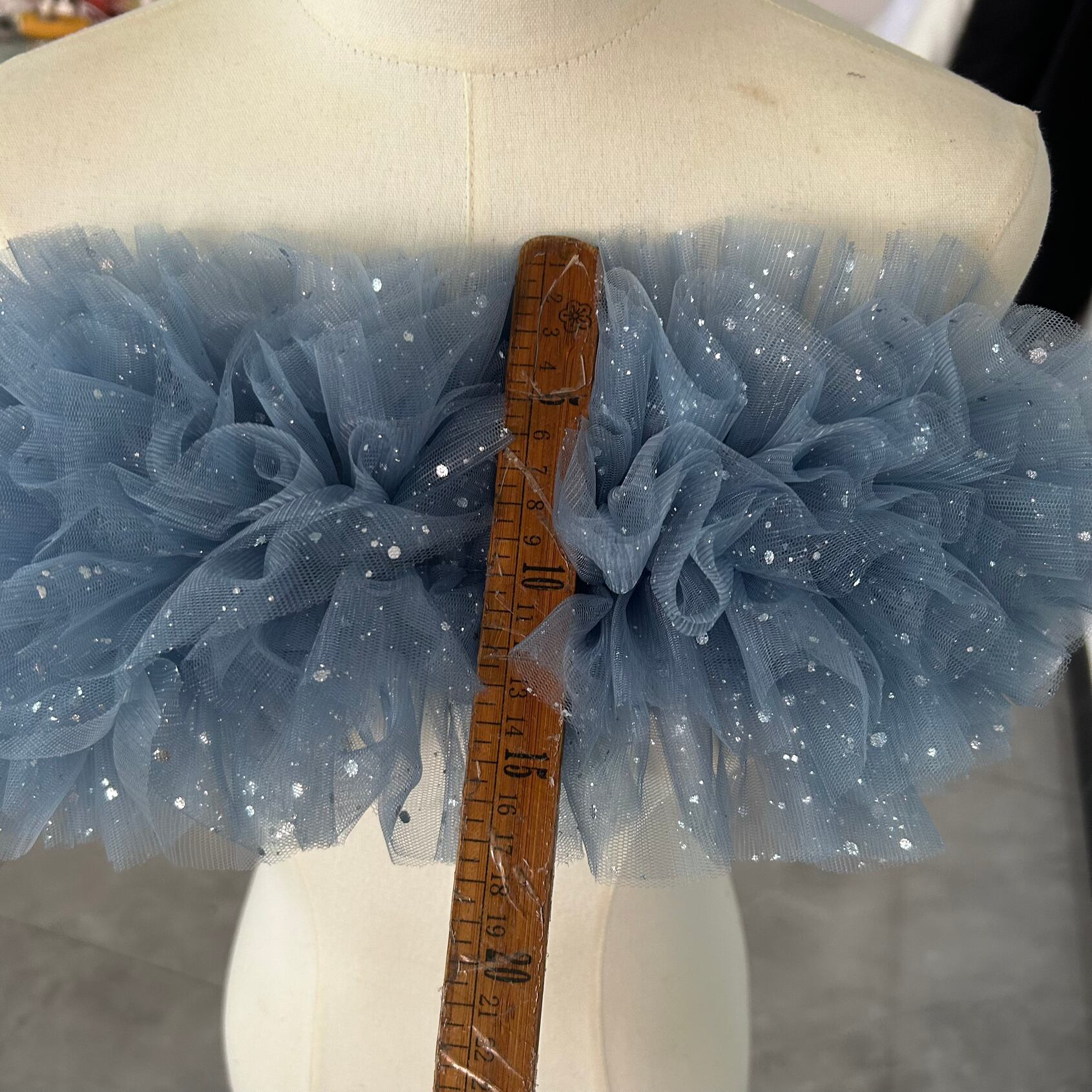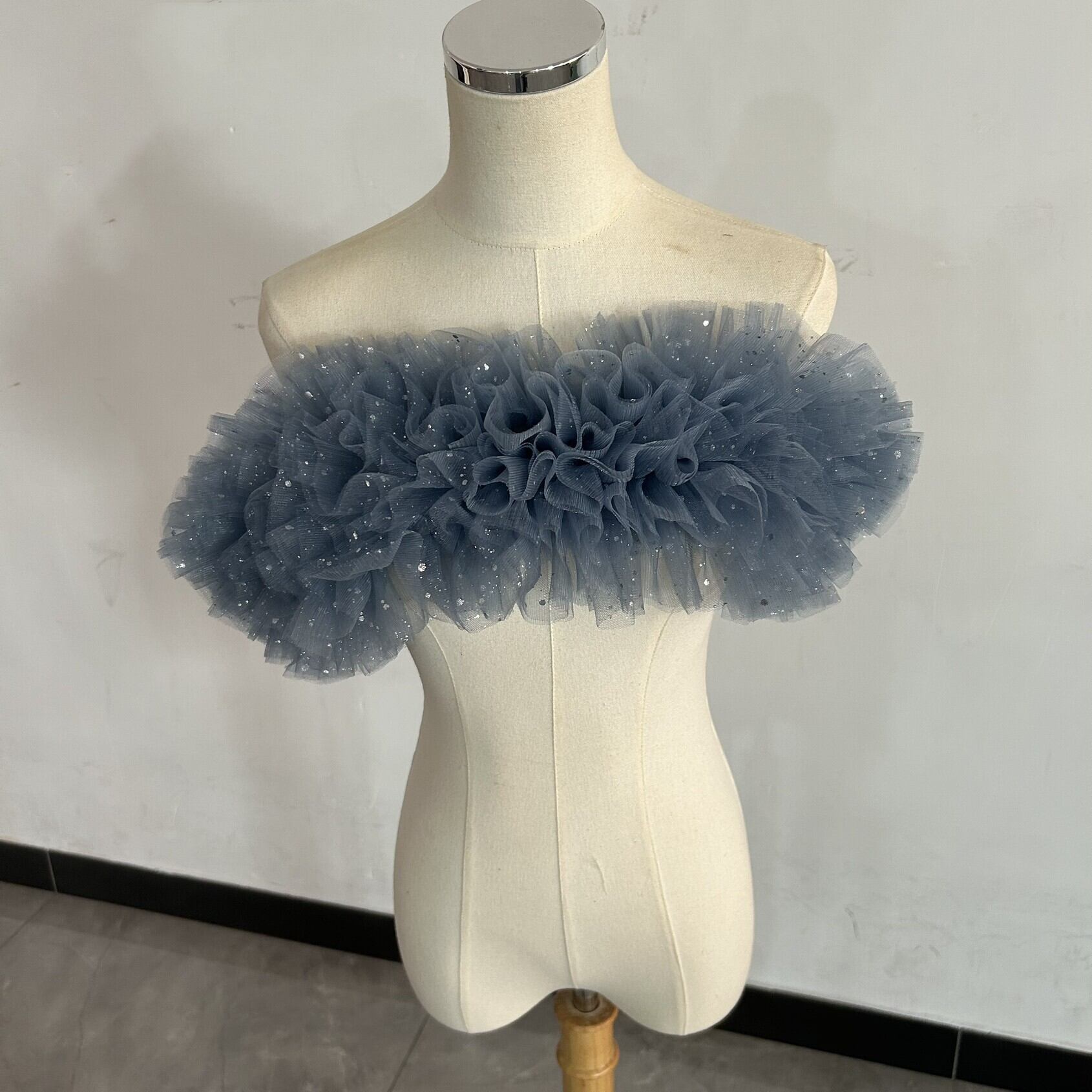 送料無料! 人気上昇! ブルーグレー キラキラグリッターチュール ポンチョ ソフトチュール ラッフルフリル  取り外しオフショルダー
