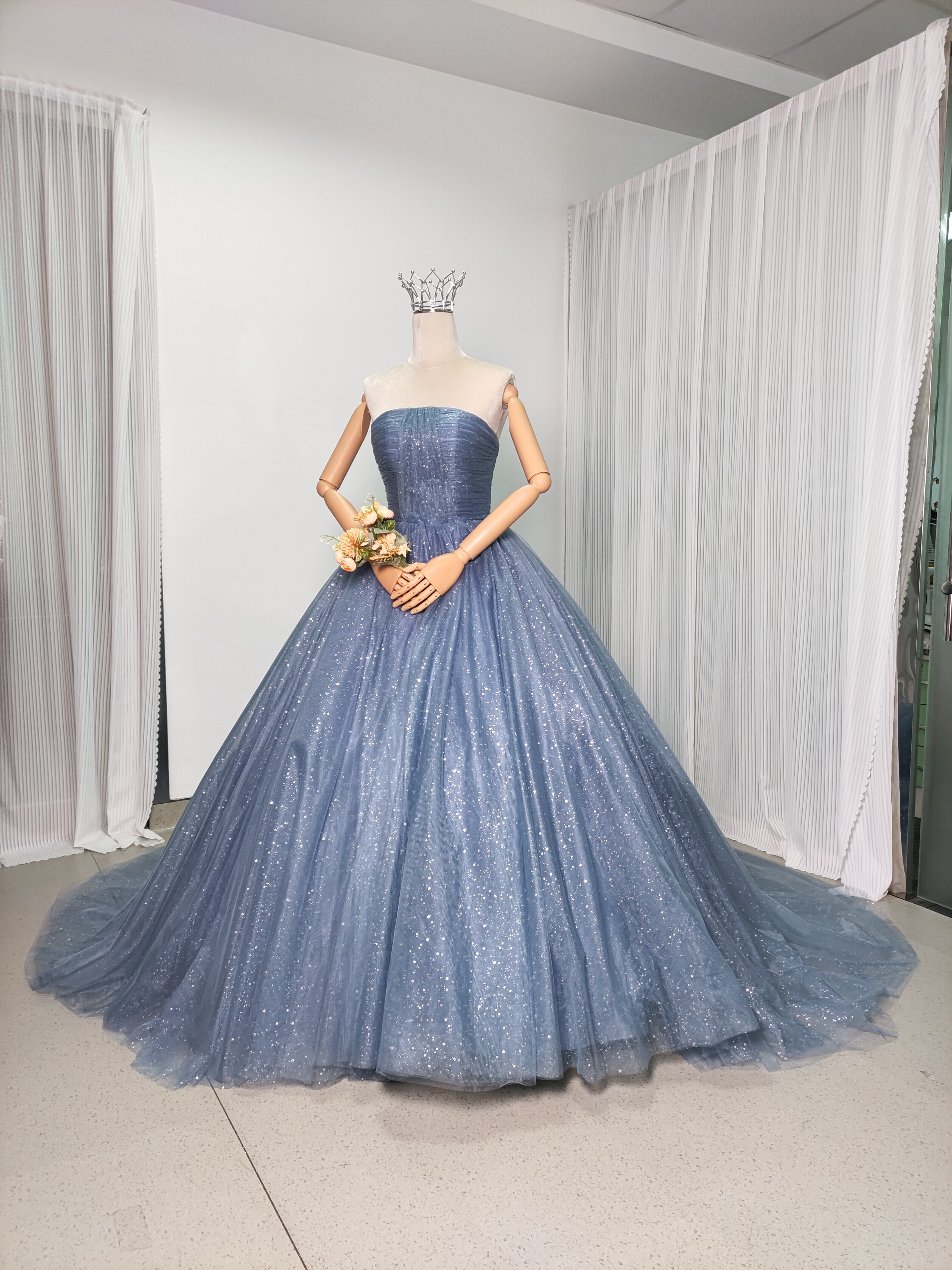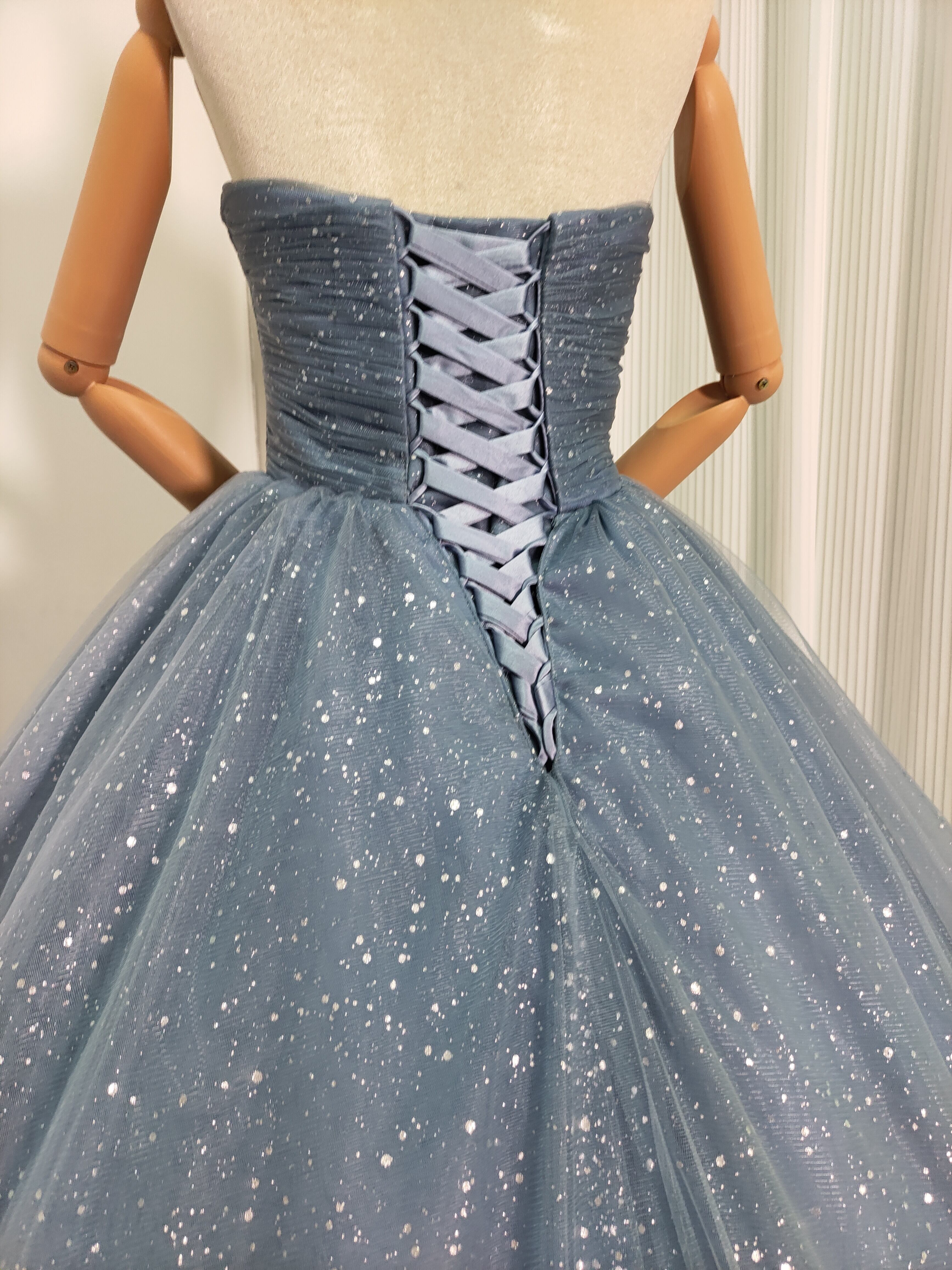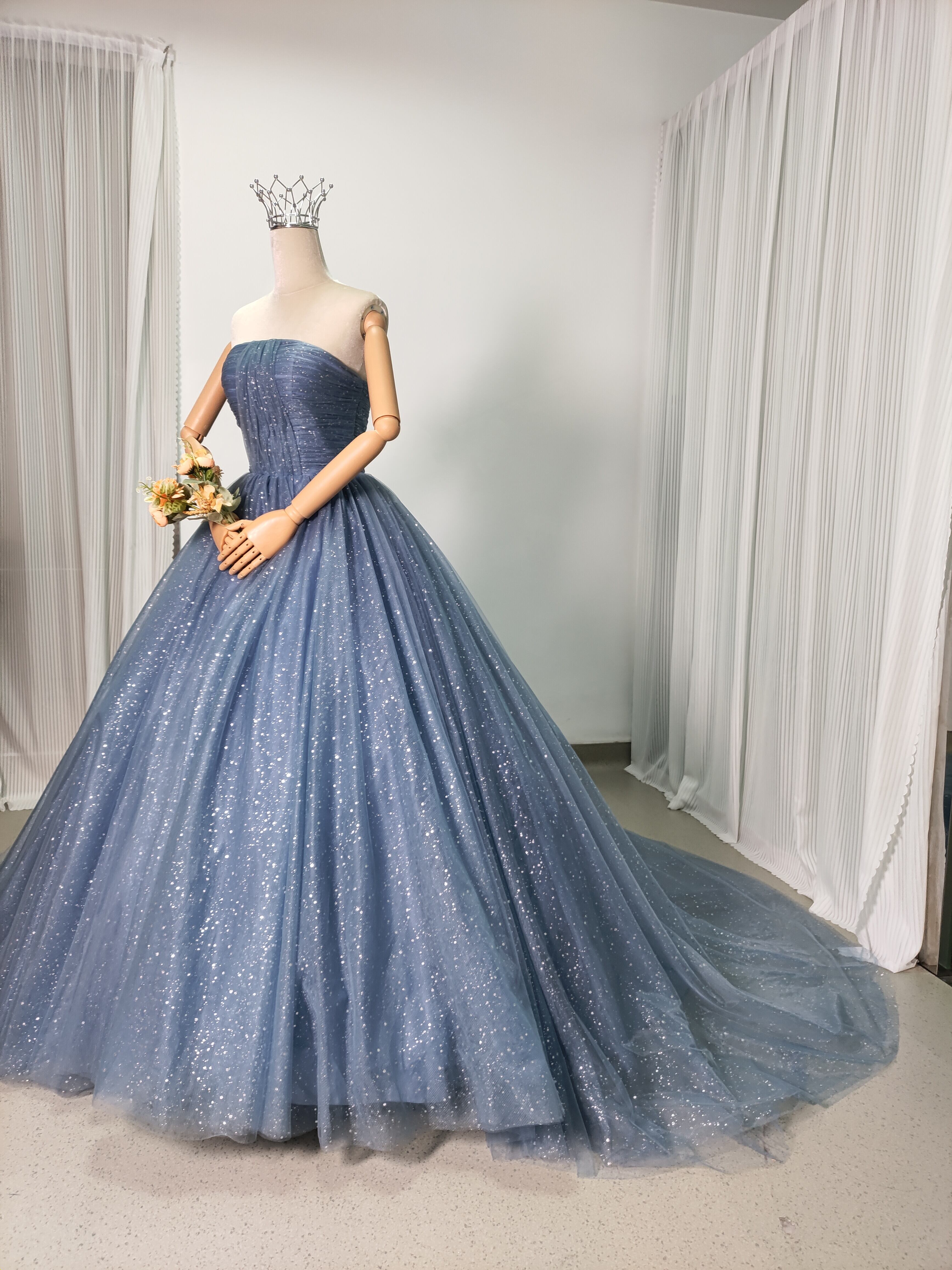 輝きな光彩を放つ ブルーグレ キラキラグリッターチュール カラードレス 華やかなトレーン /