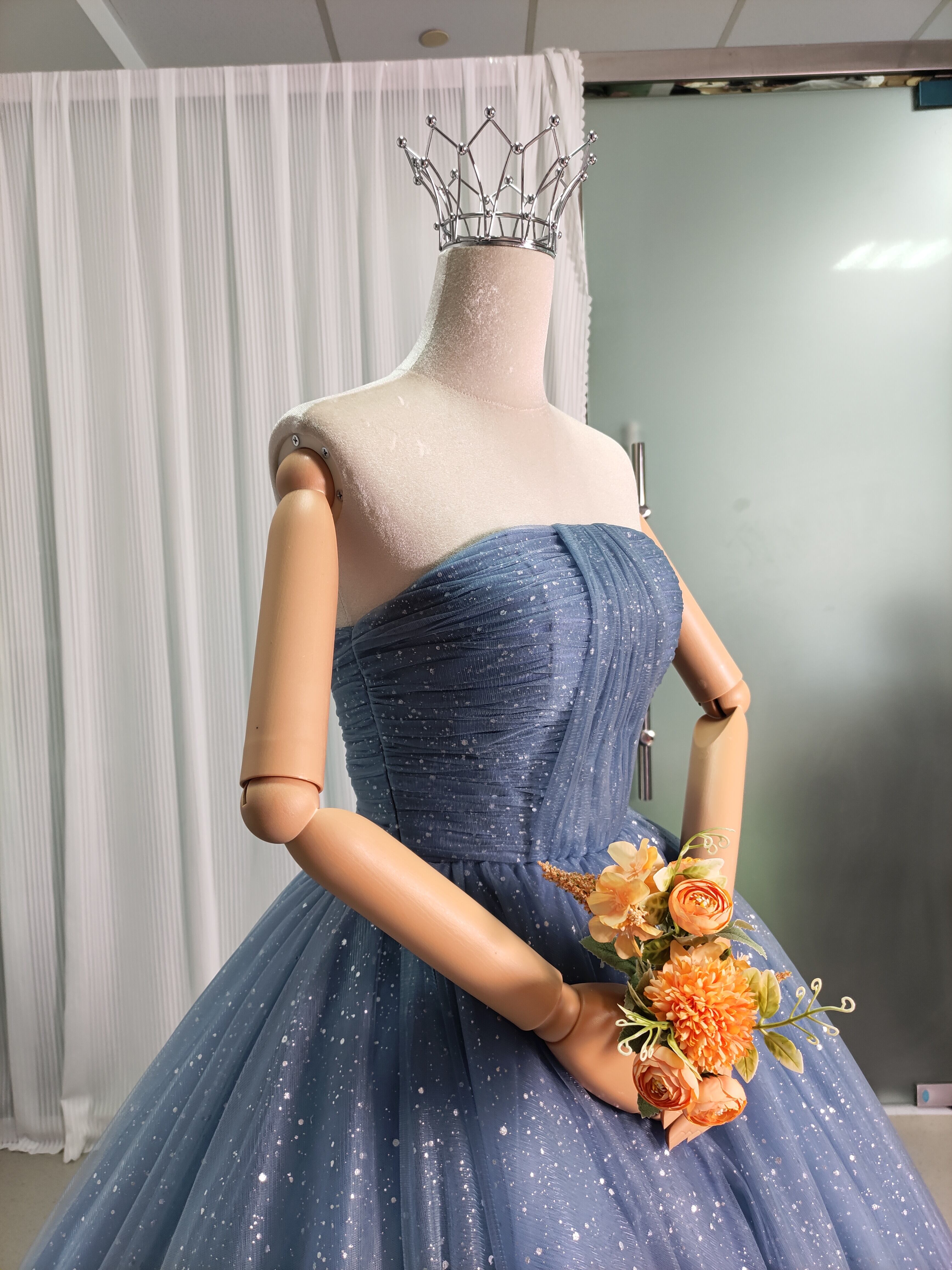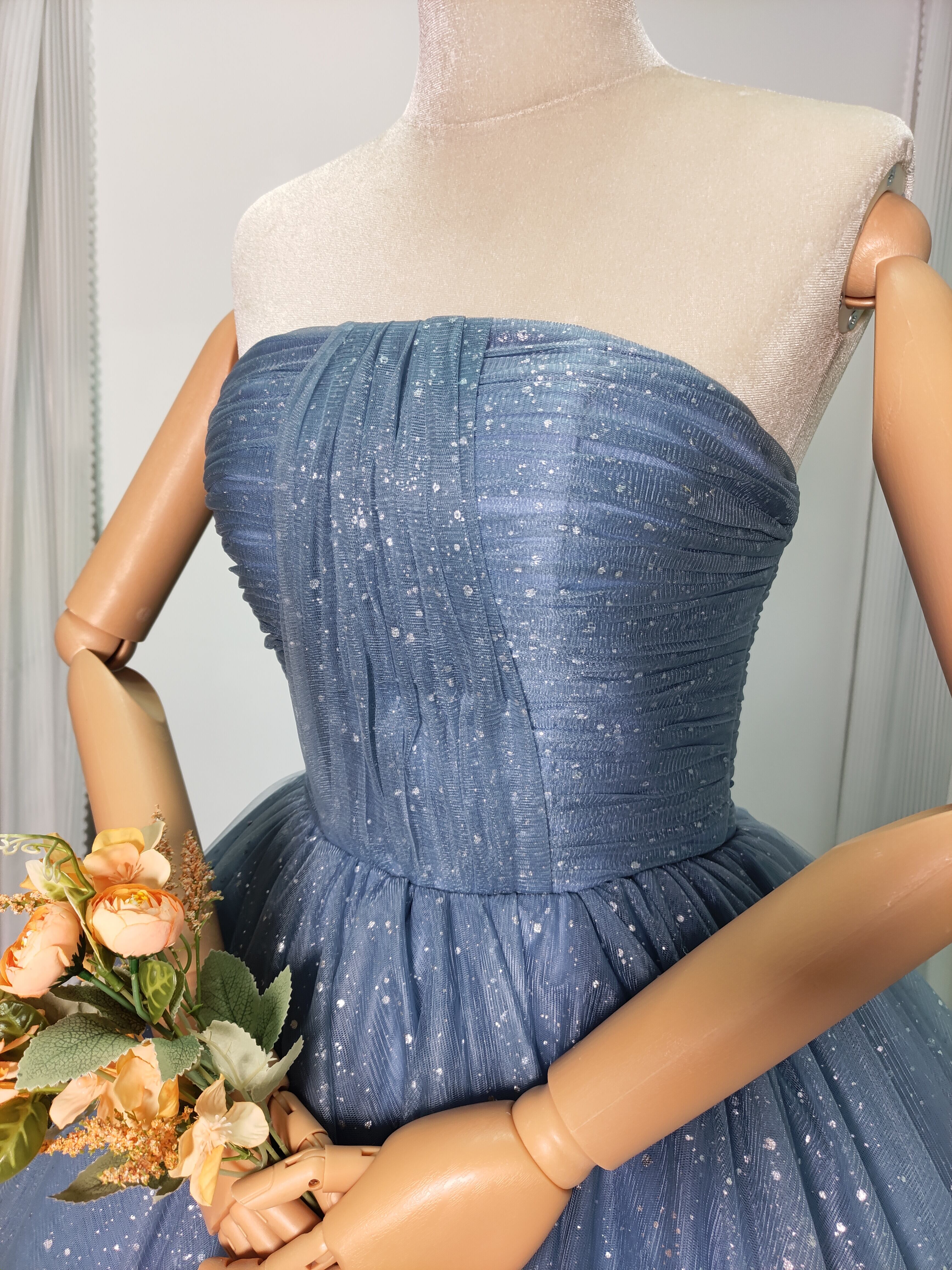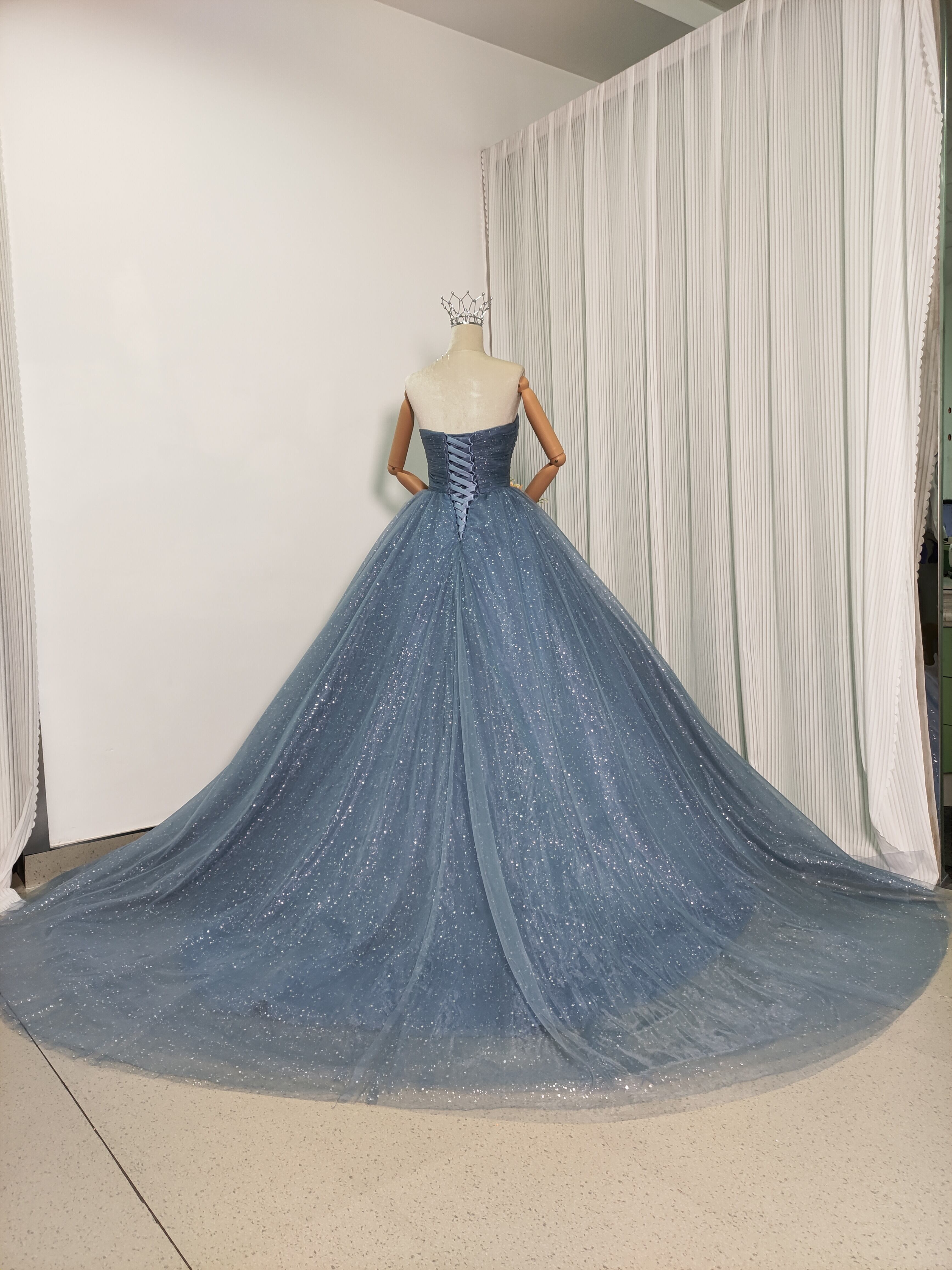 輝きな光彩を放つ ブルーグレ キラキラグリッターチュール カラードレス 華やかなトレーン /