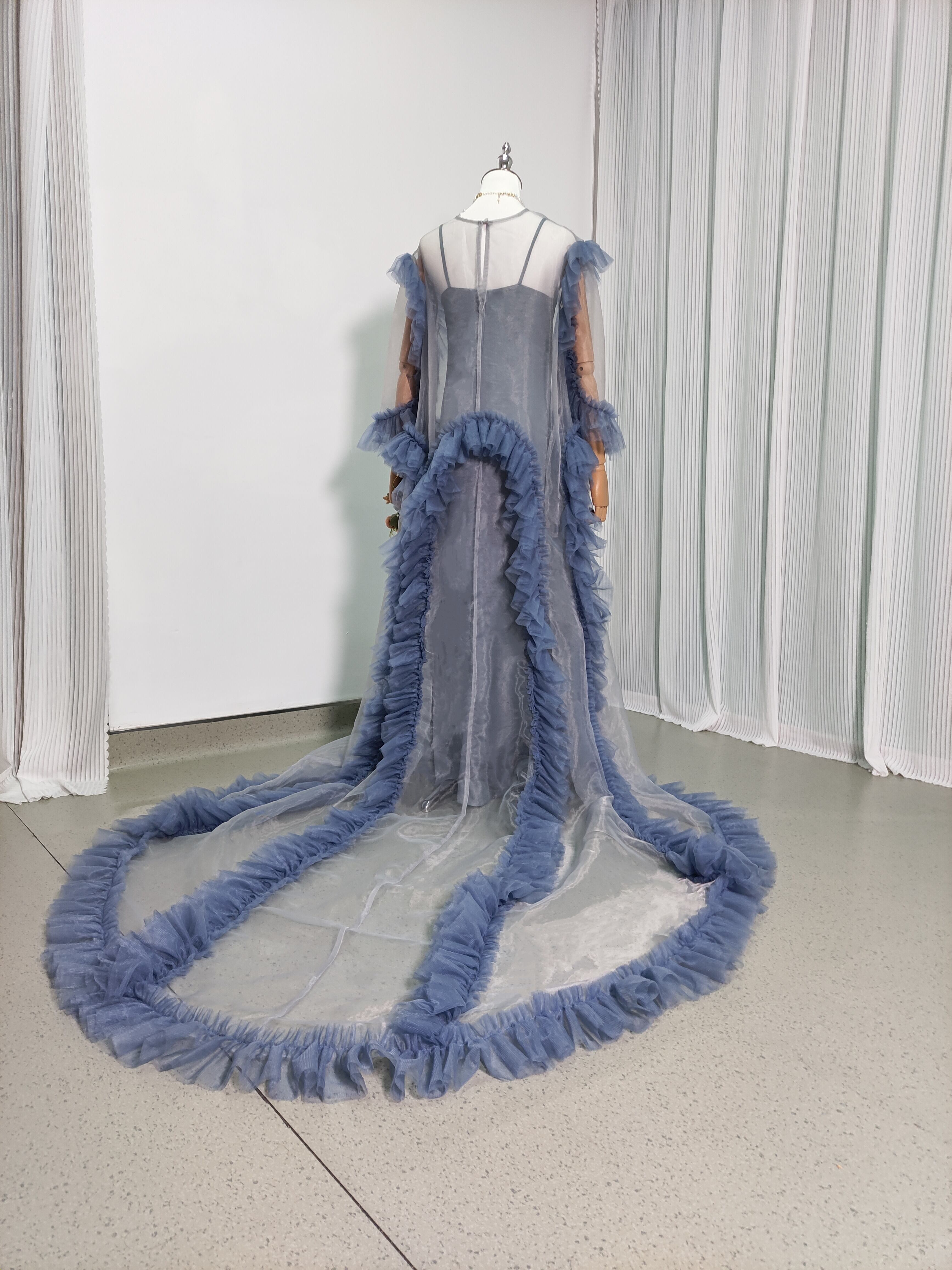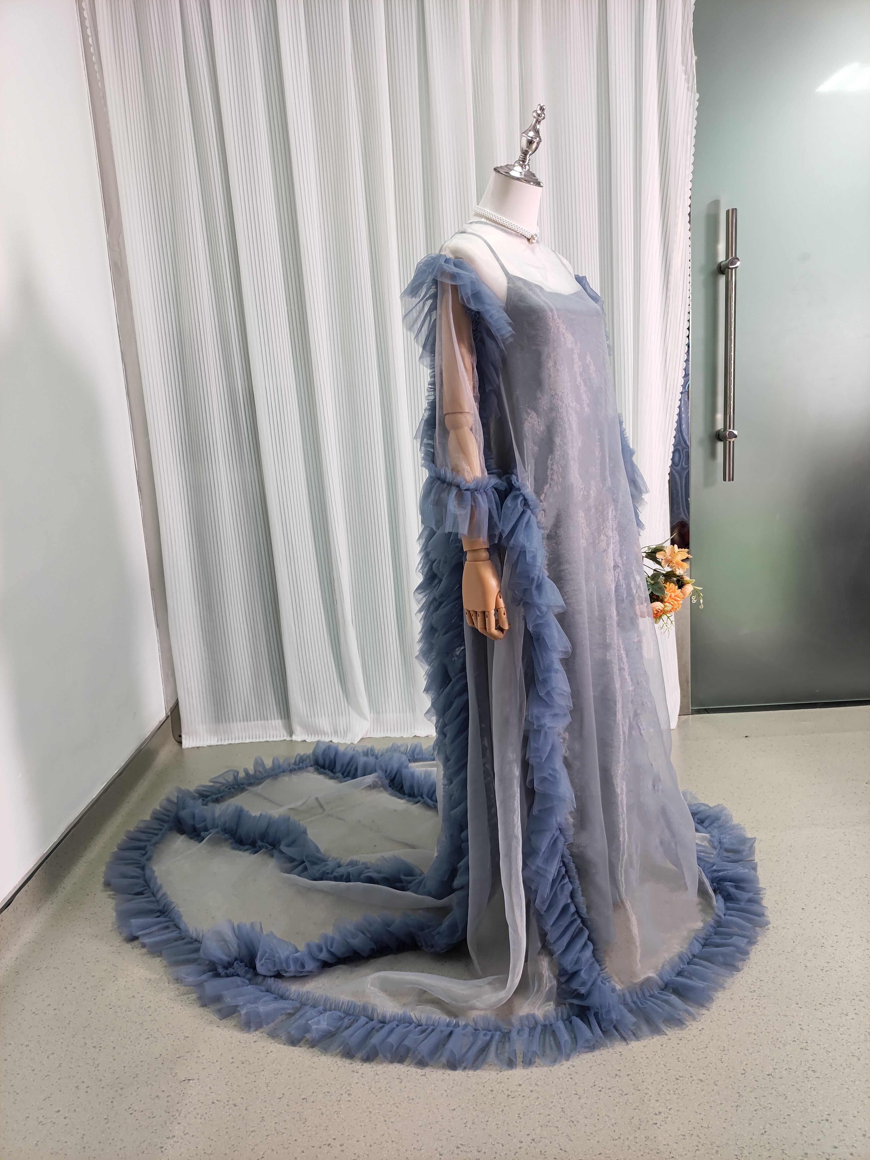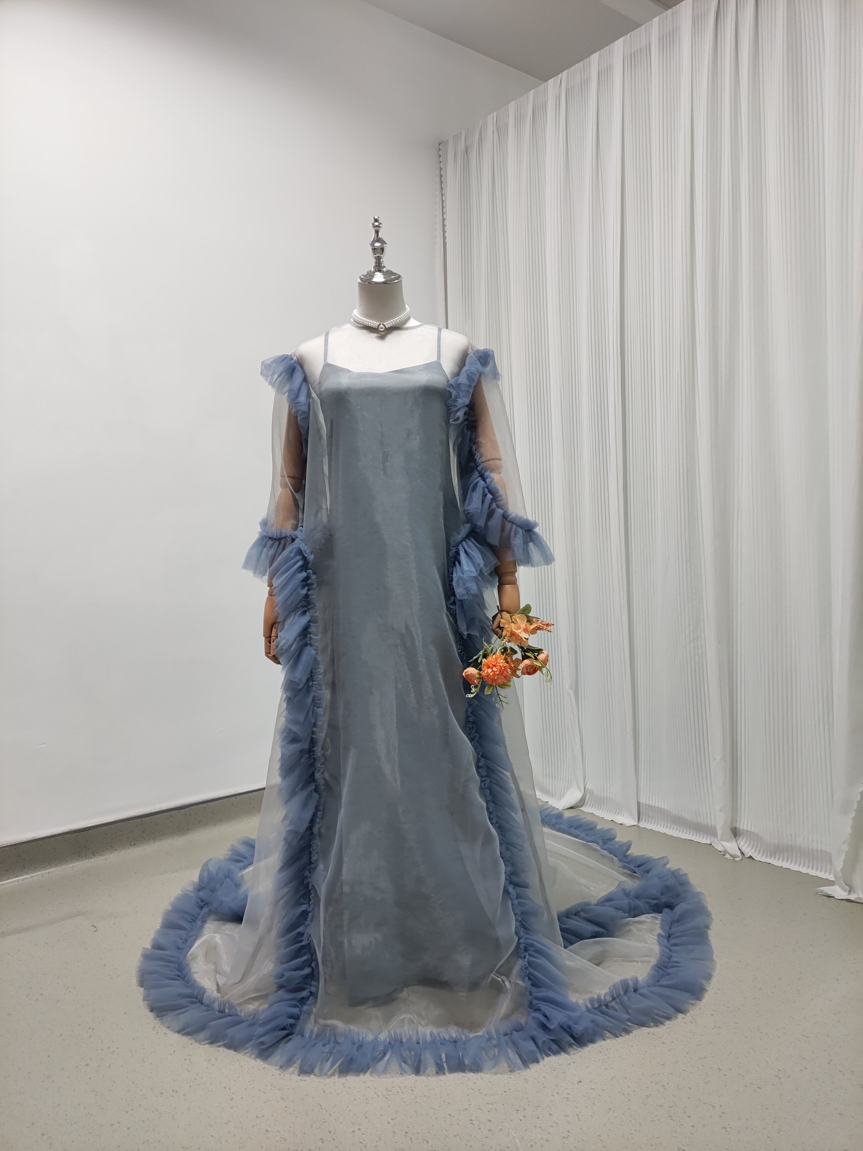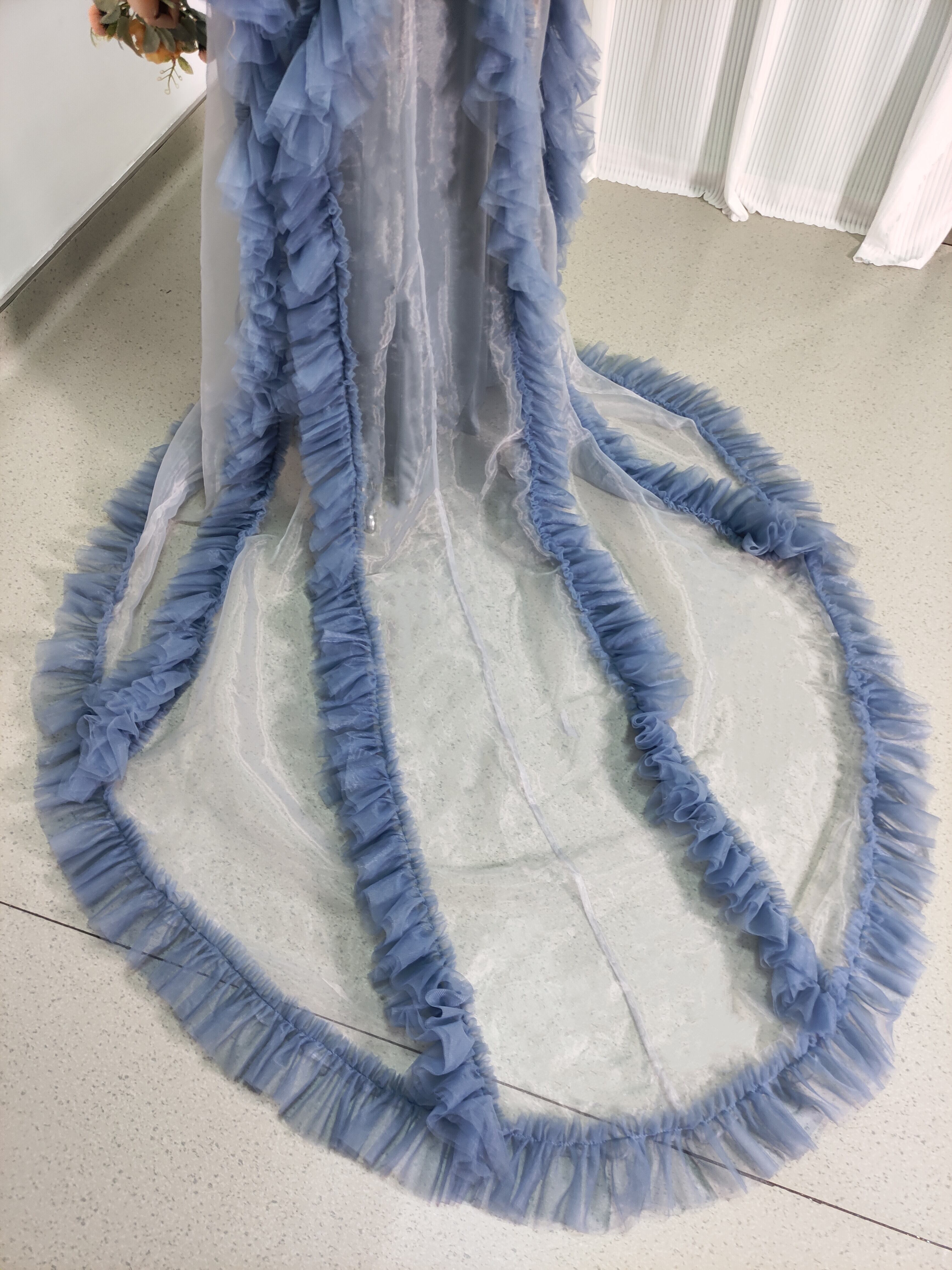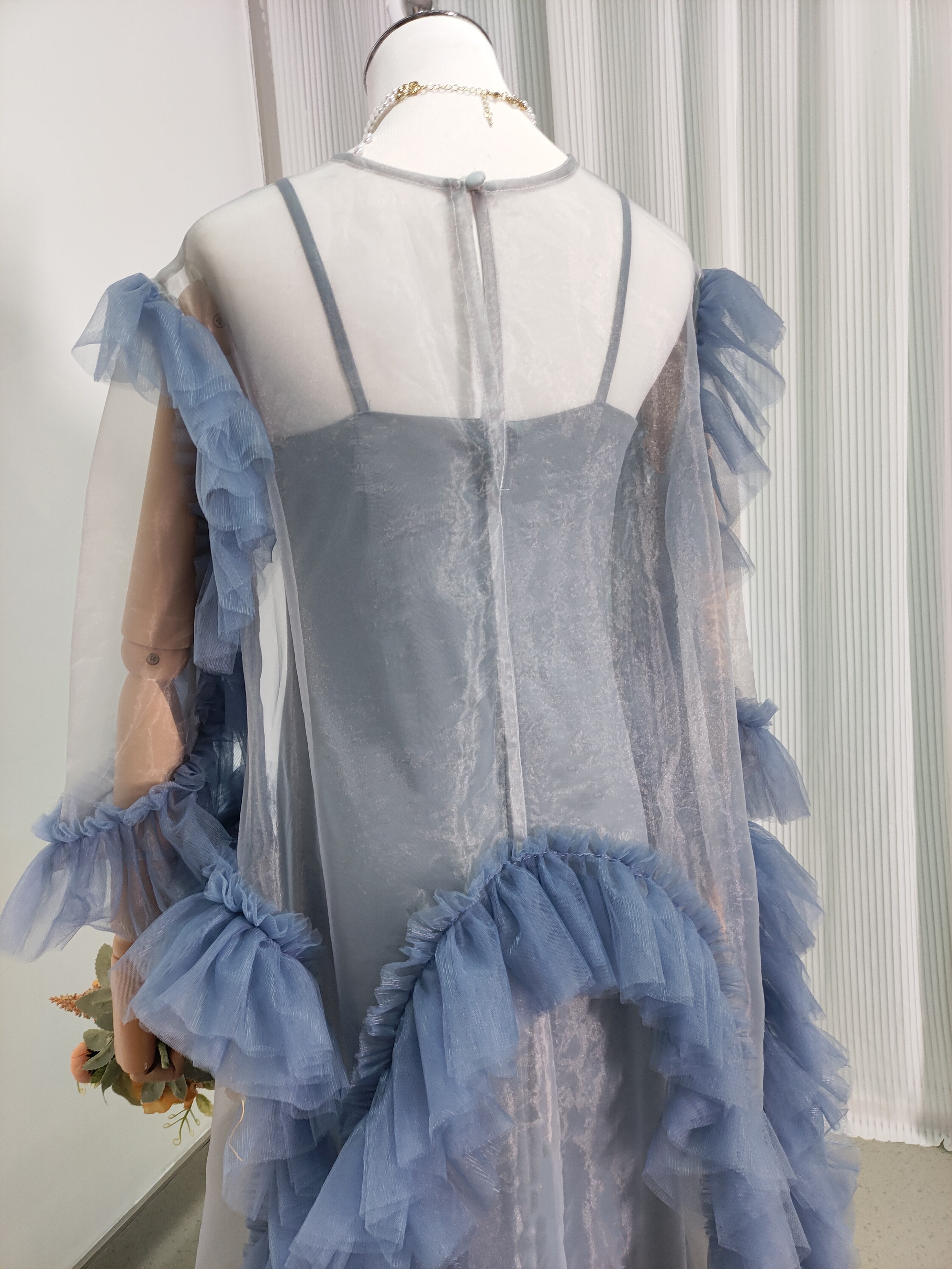 送料無料! 爽やかで優しいブルーオンショルダードレス+ ケープ風もこもこドレス 抜群のおしゃれ見え 前撮り結婚式