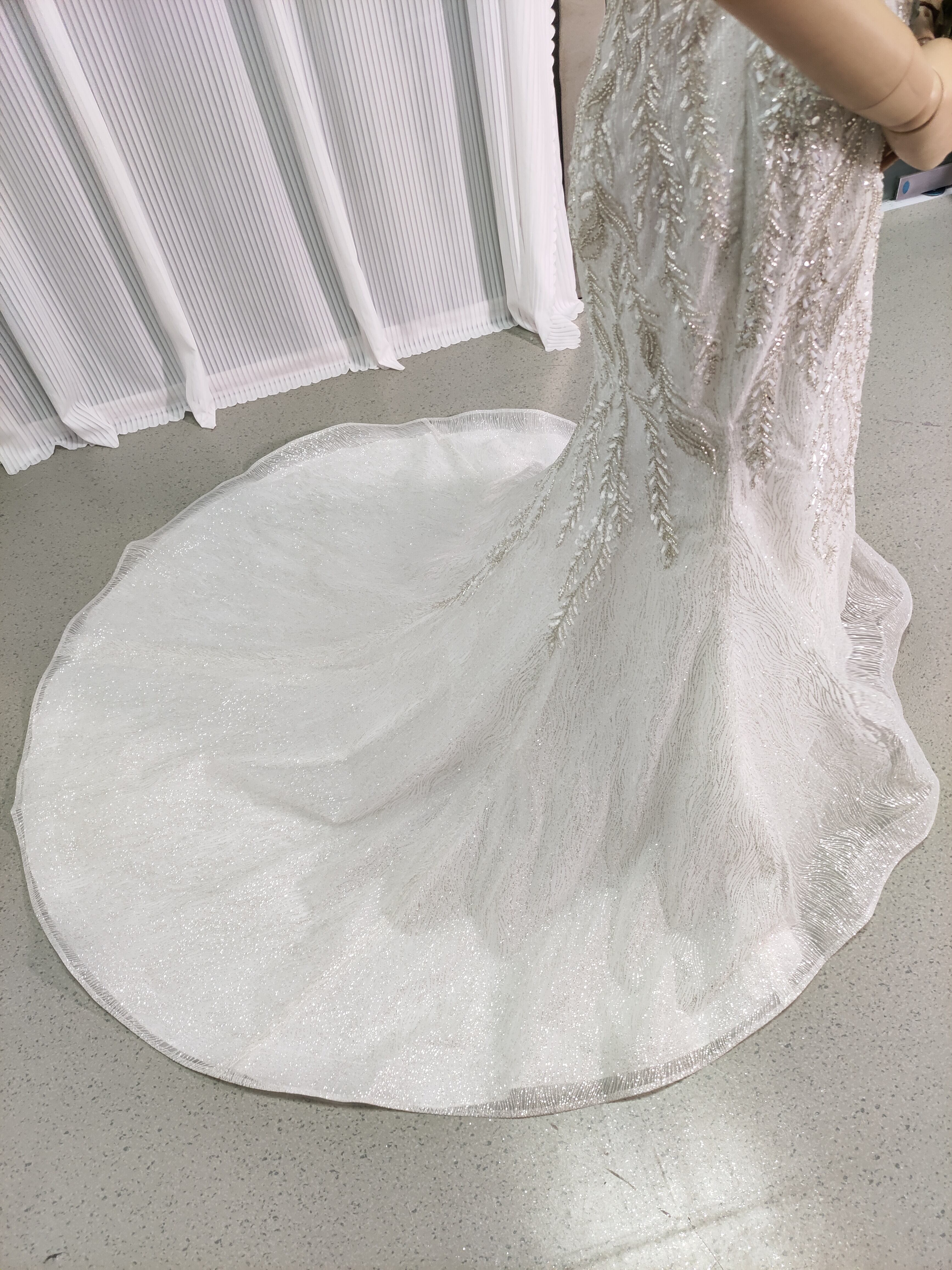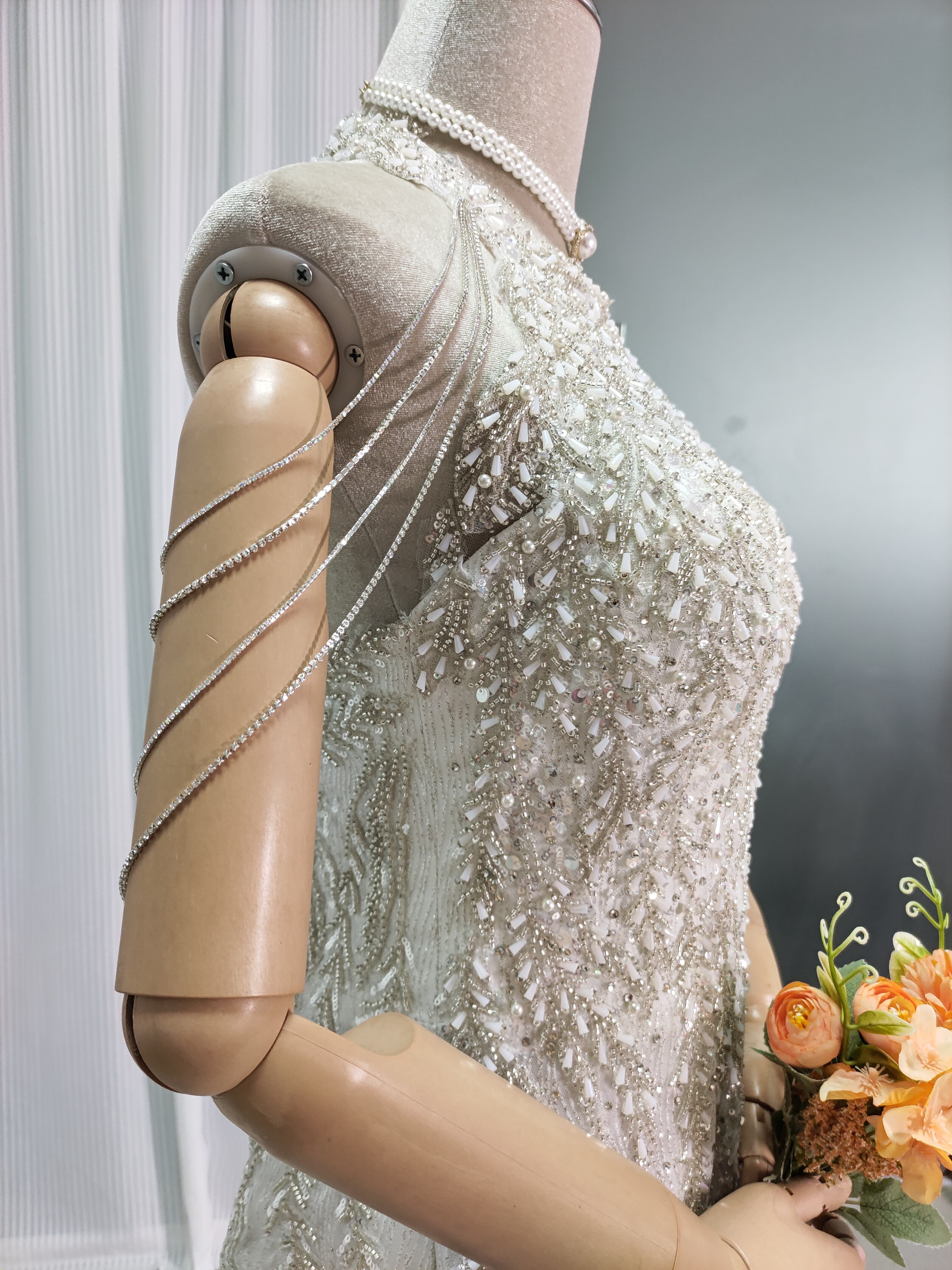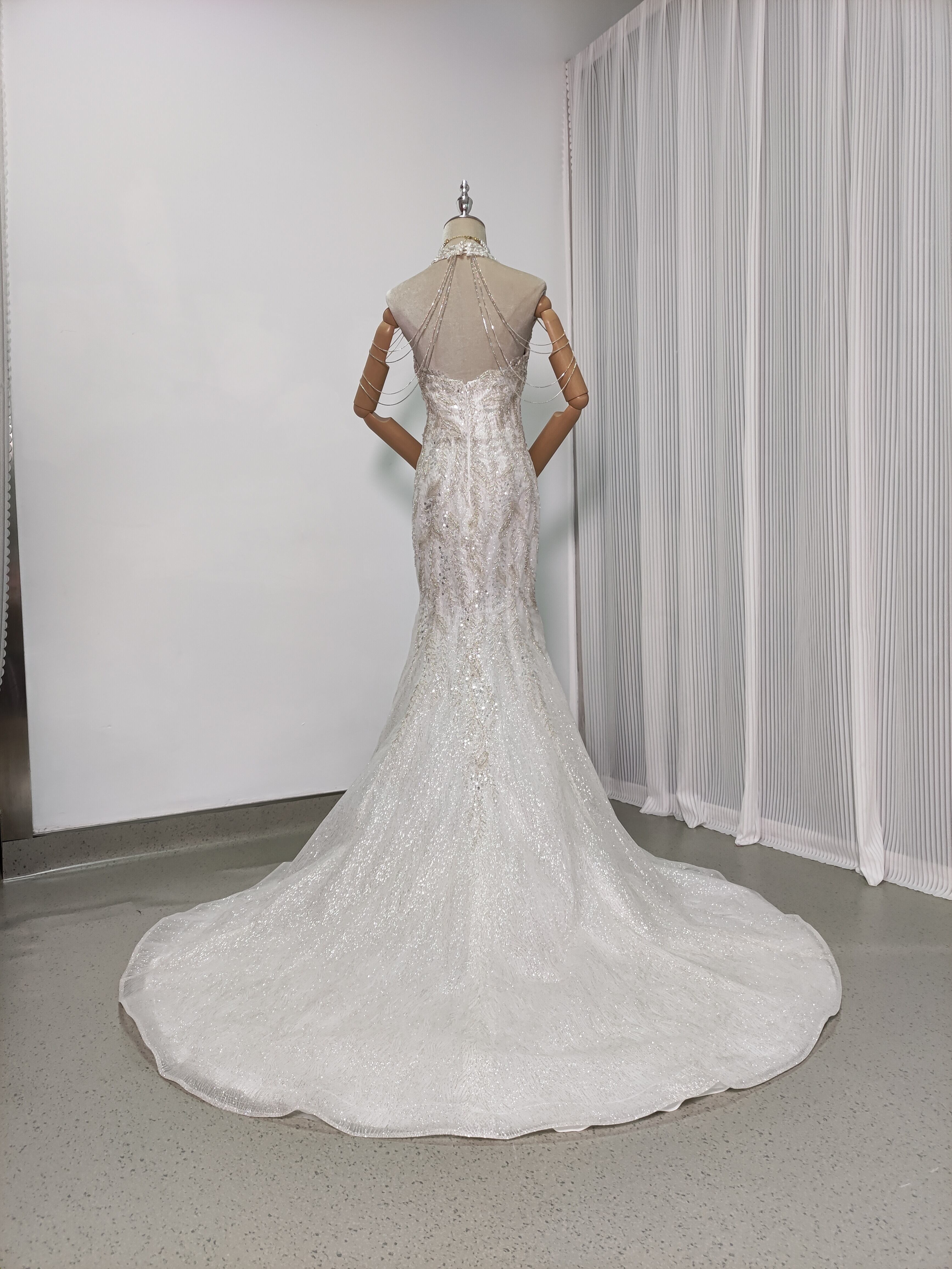 輝きな光彩を放つ アメリカンスリーブ ビジュー ウエディングドレス キラキラチュール 華やかなトレーン マーメイドライン