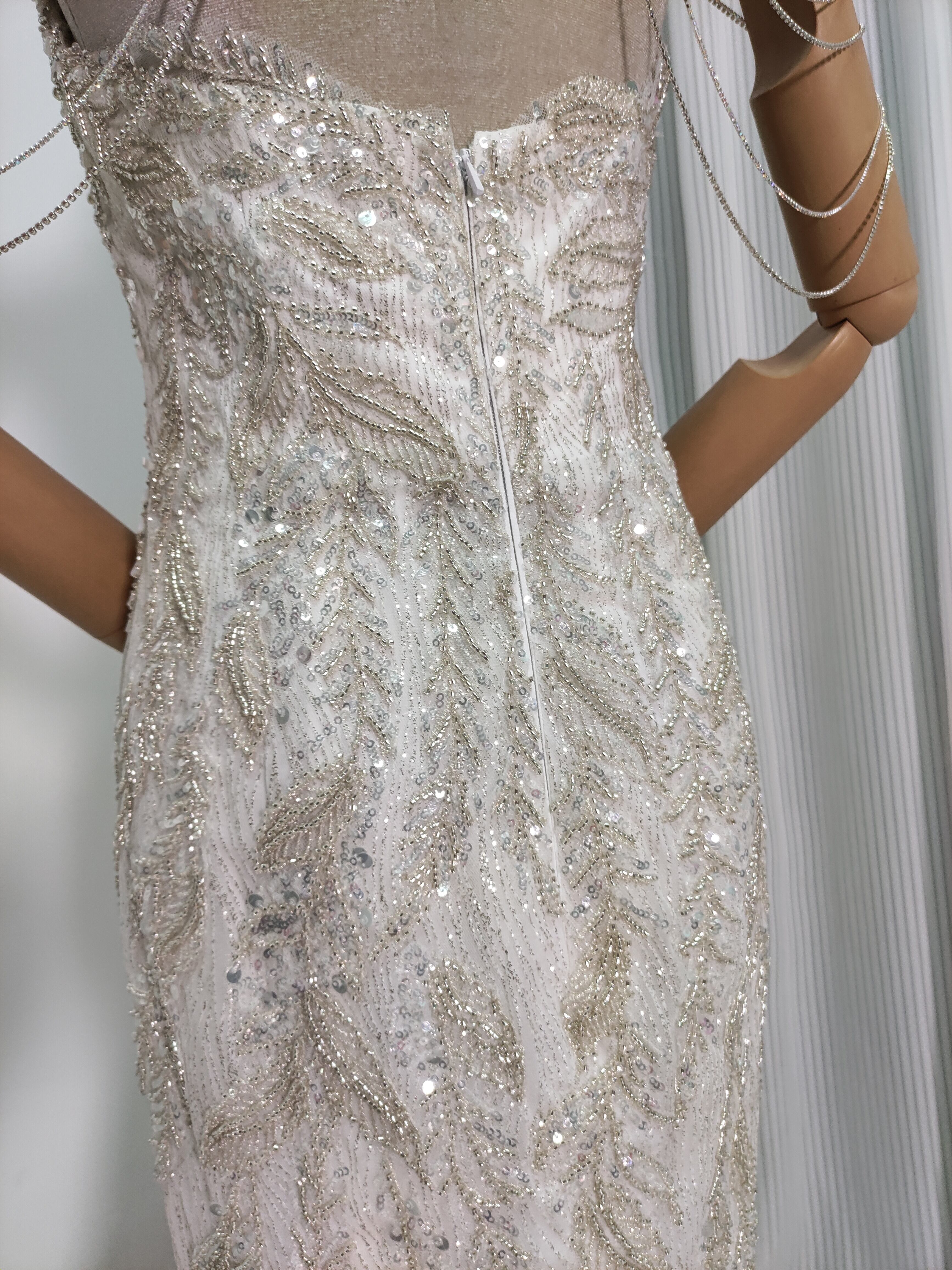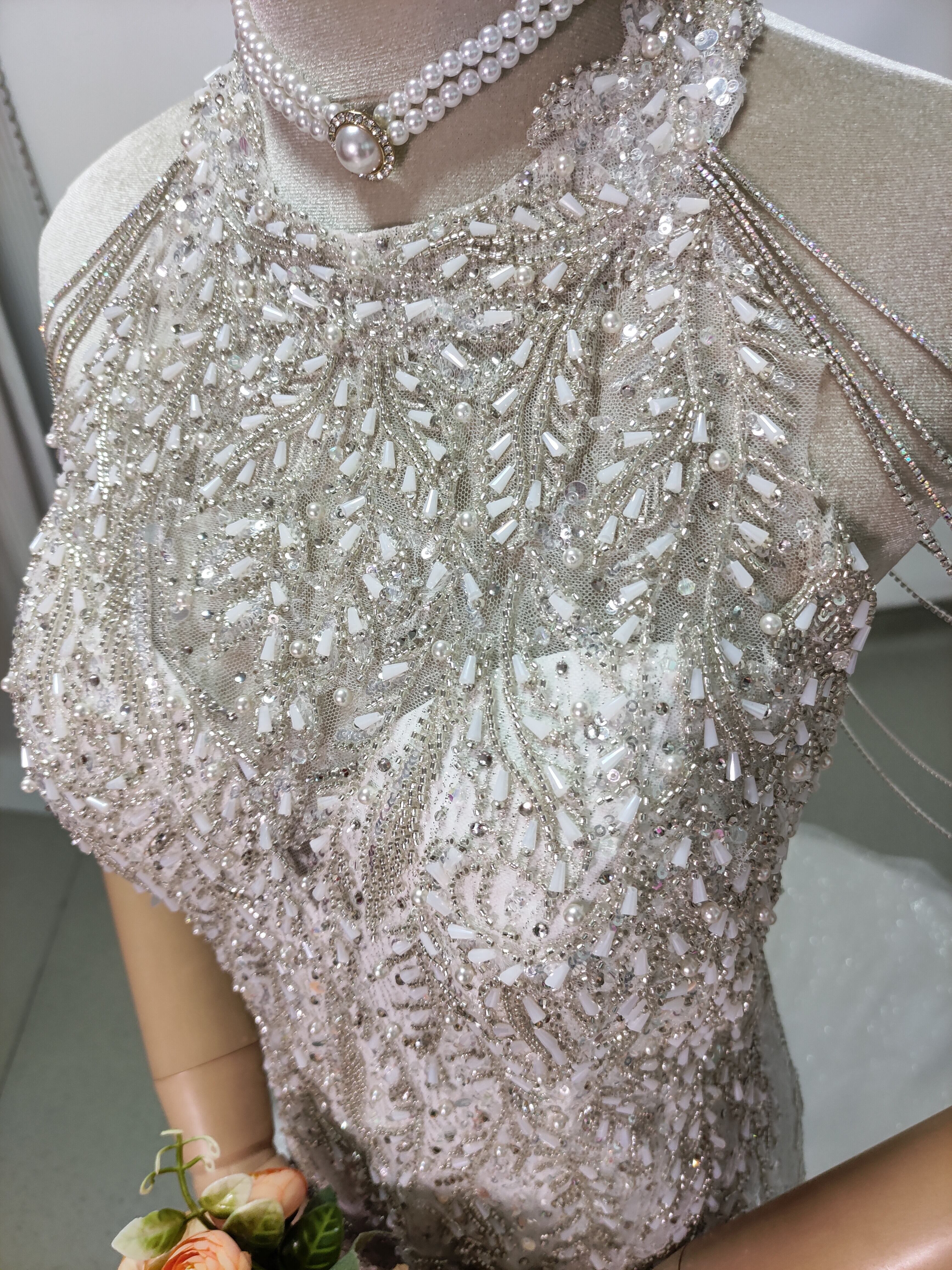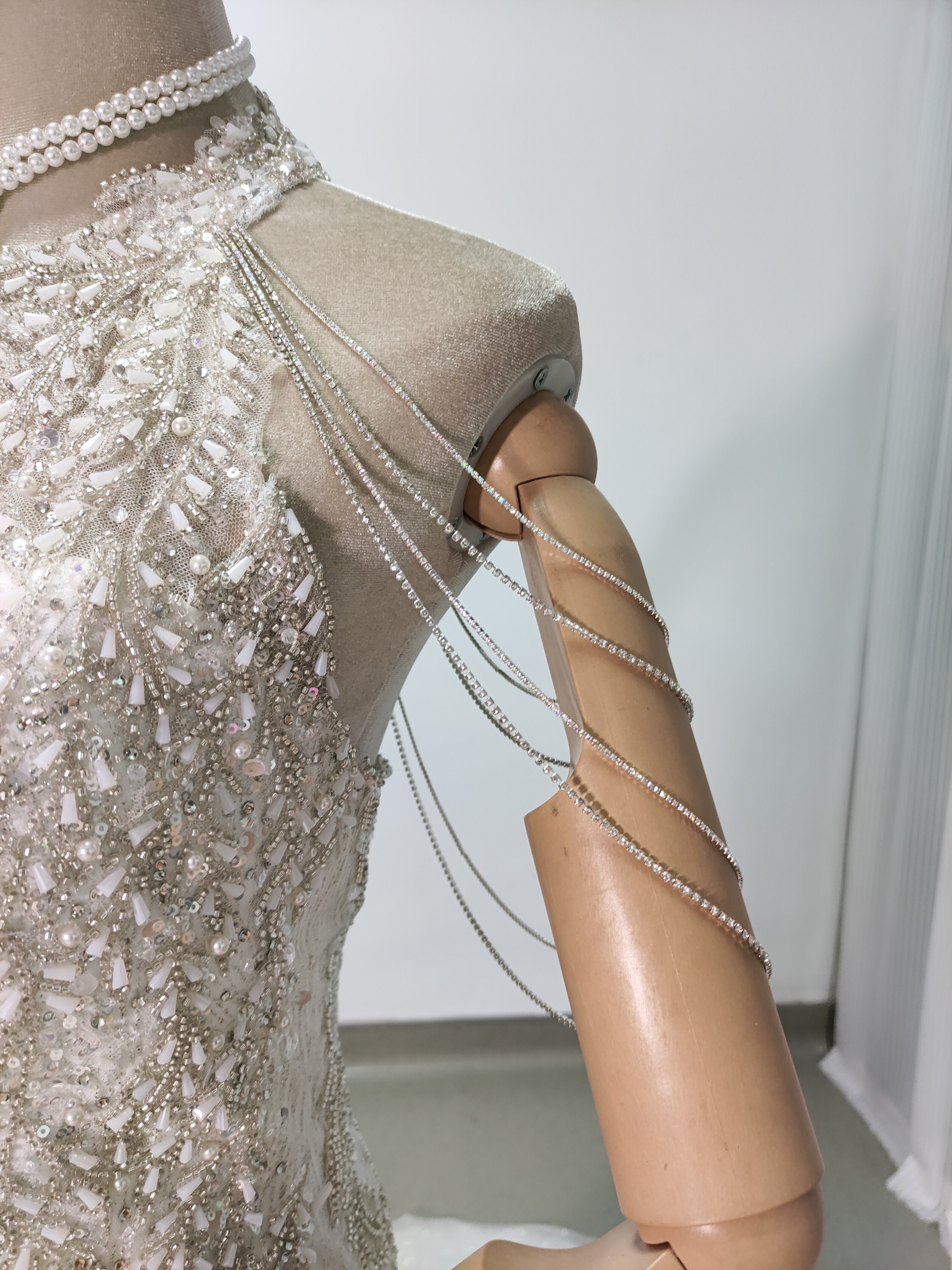 輝きな光彩を放つ アメリカンスリーブ ビジュー ウエディングドレス キラキラチュール 華やかなトレーン マーメイドライン