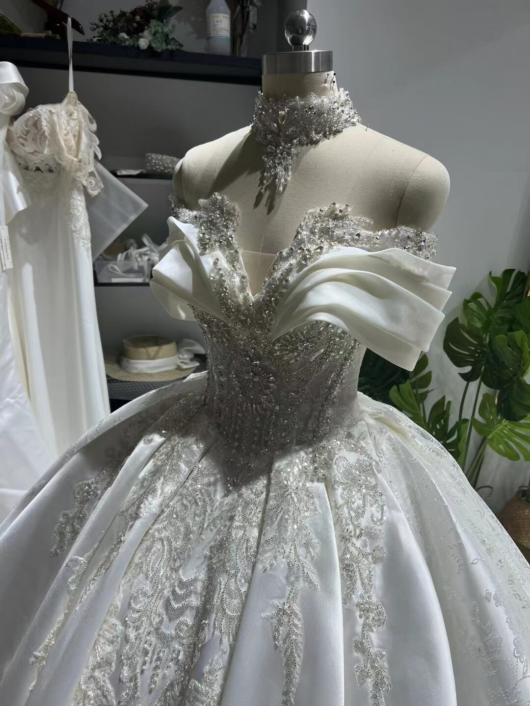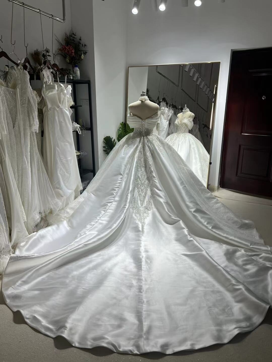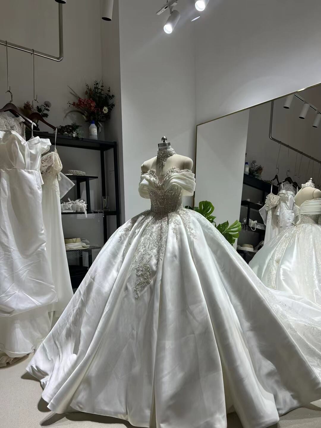 上品!ウエディングドレス ベアトップ オフショルダー プリンセスライン 高級サテン 豪華ドレス 韓国風ドレス ビジュー エレガント ハンドメイド オーダードレス ロングトレーン 結婚式/前撮り/披露宴