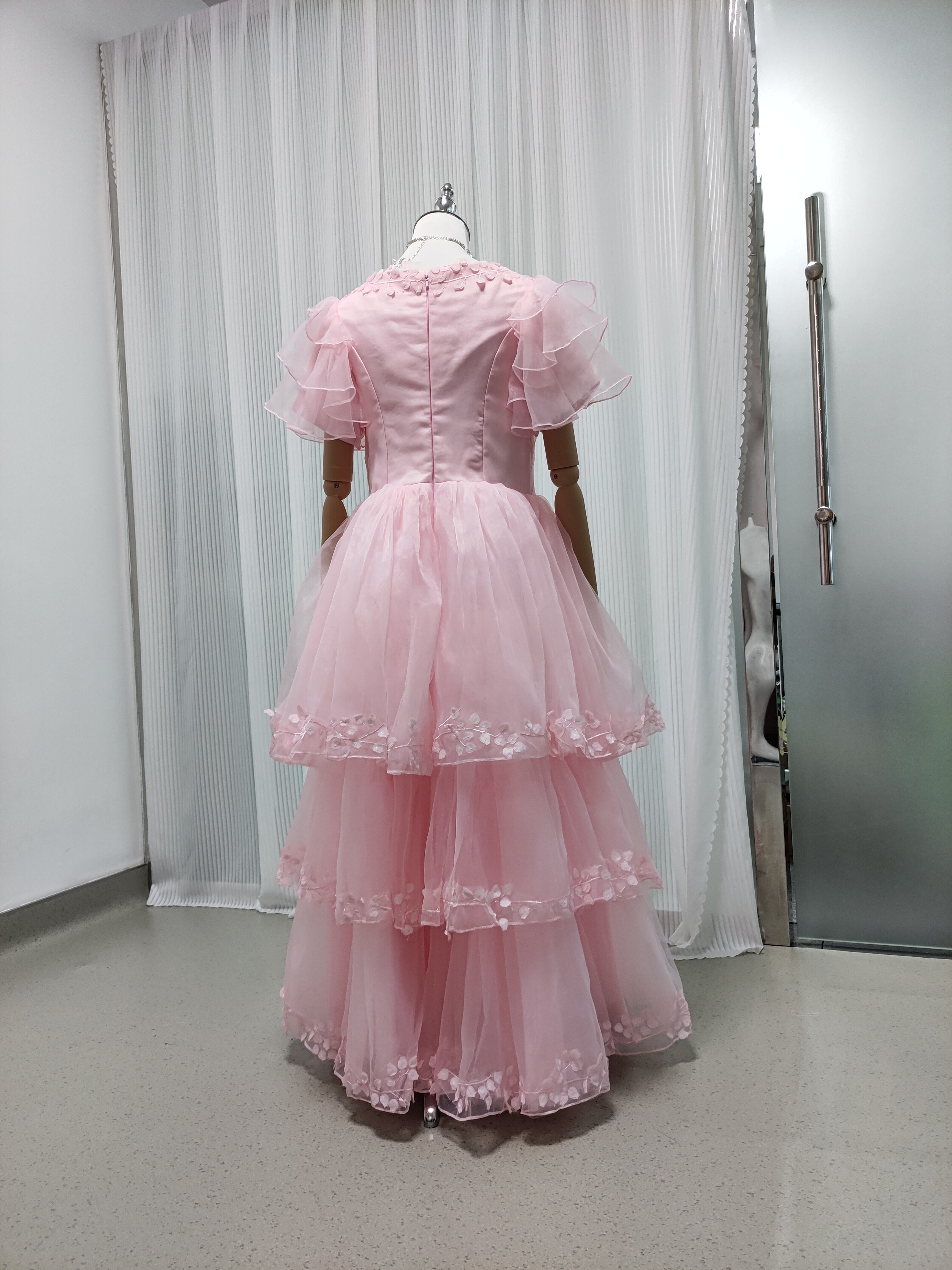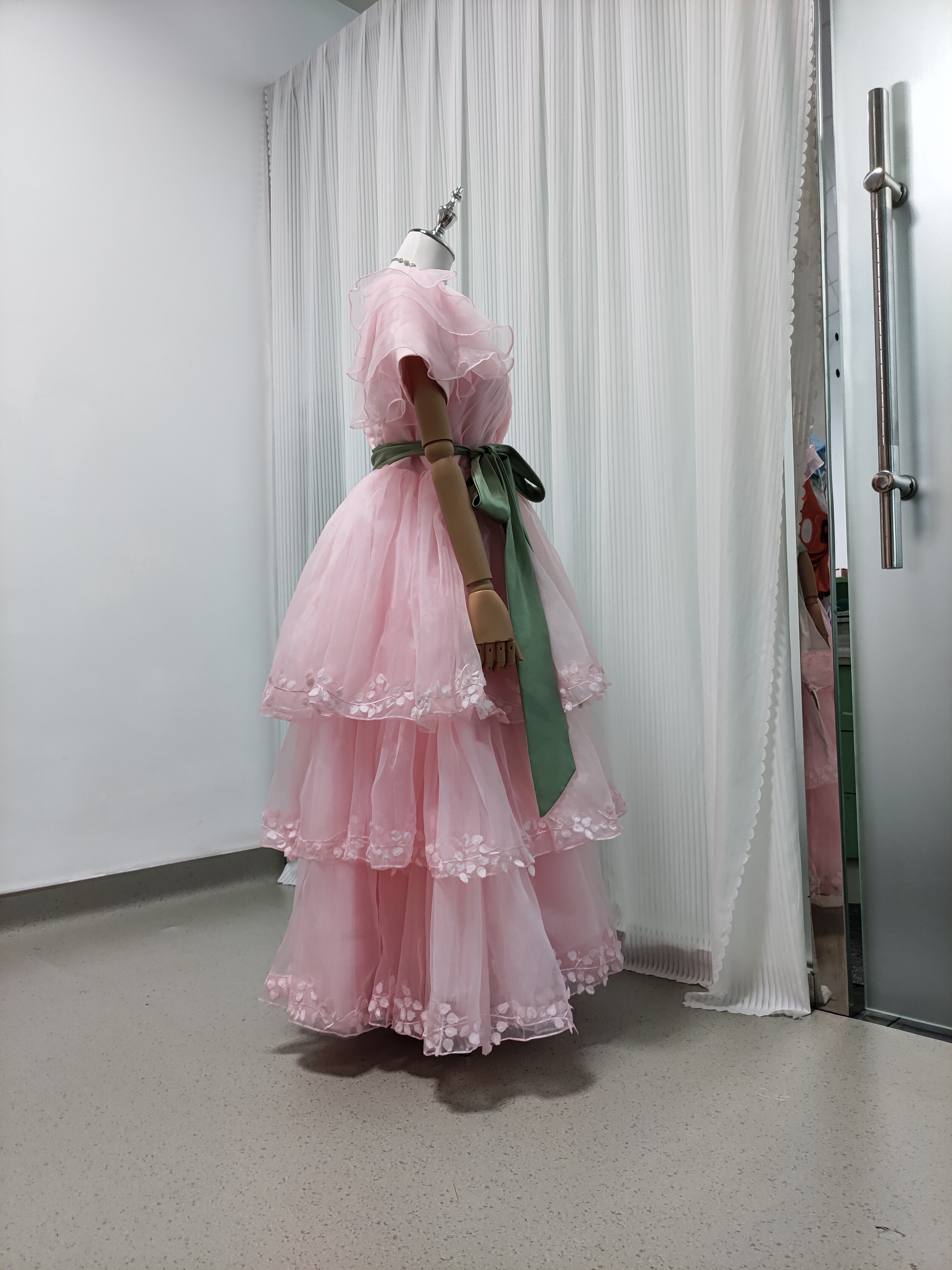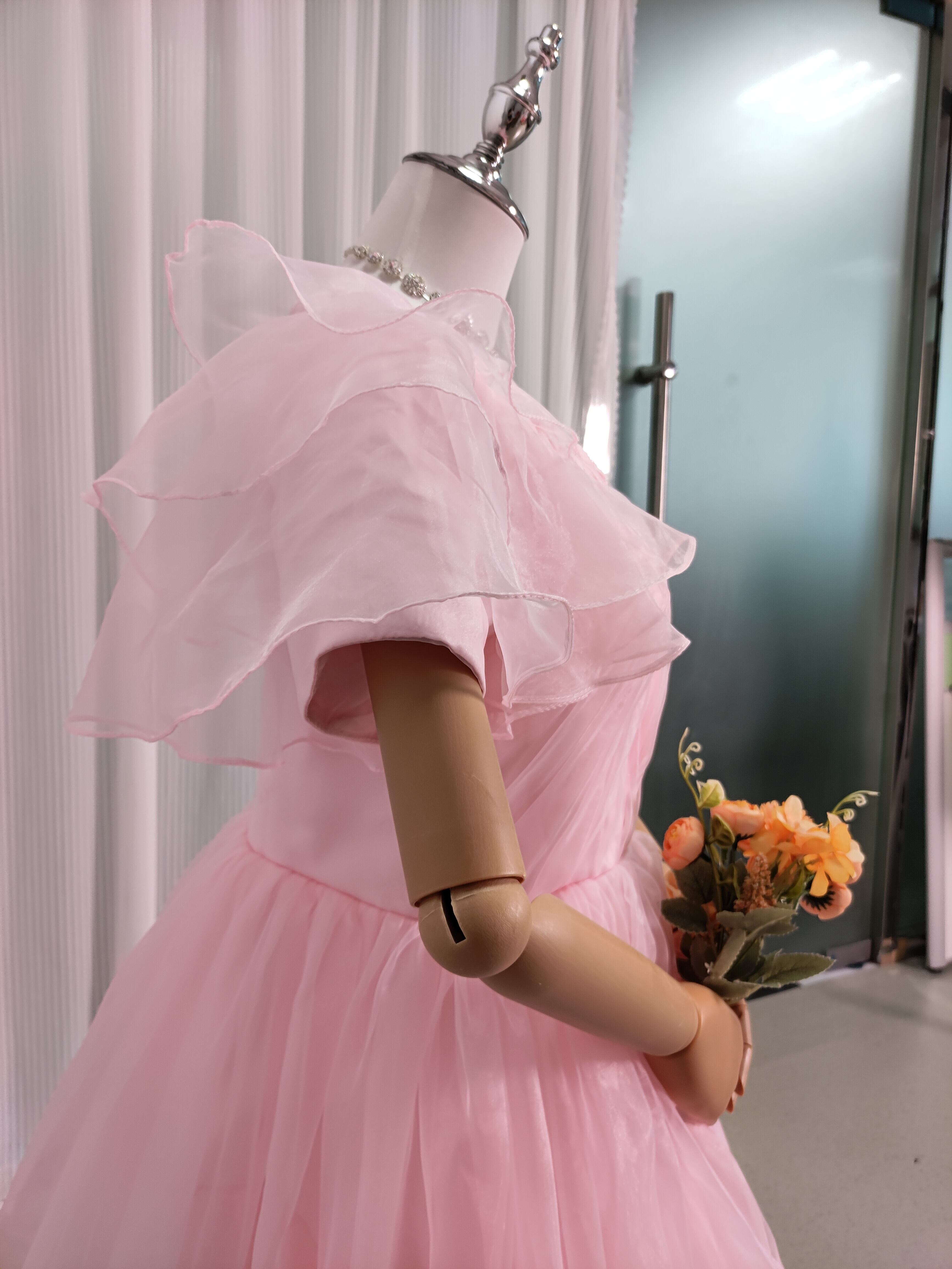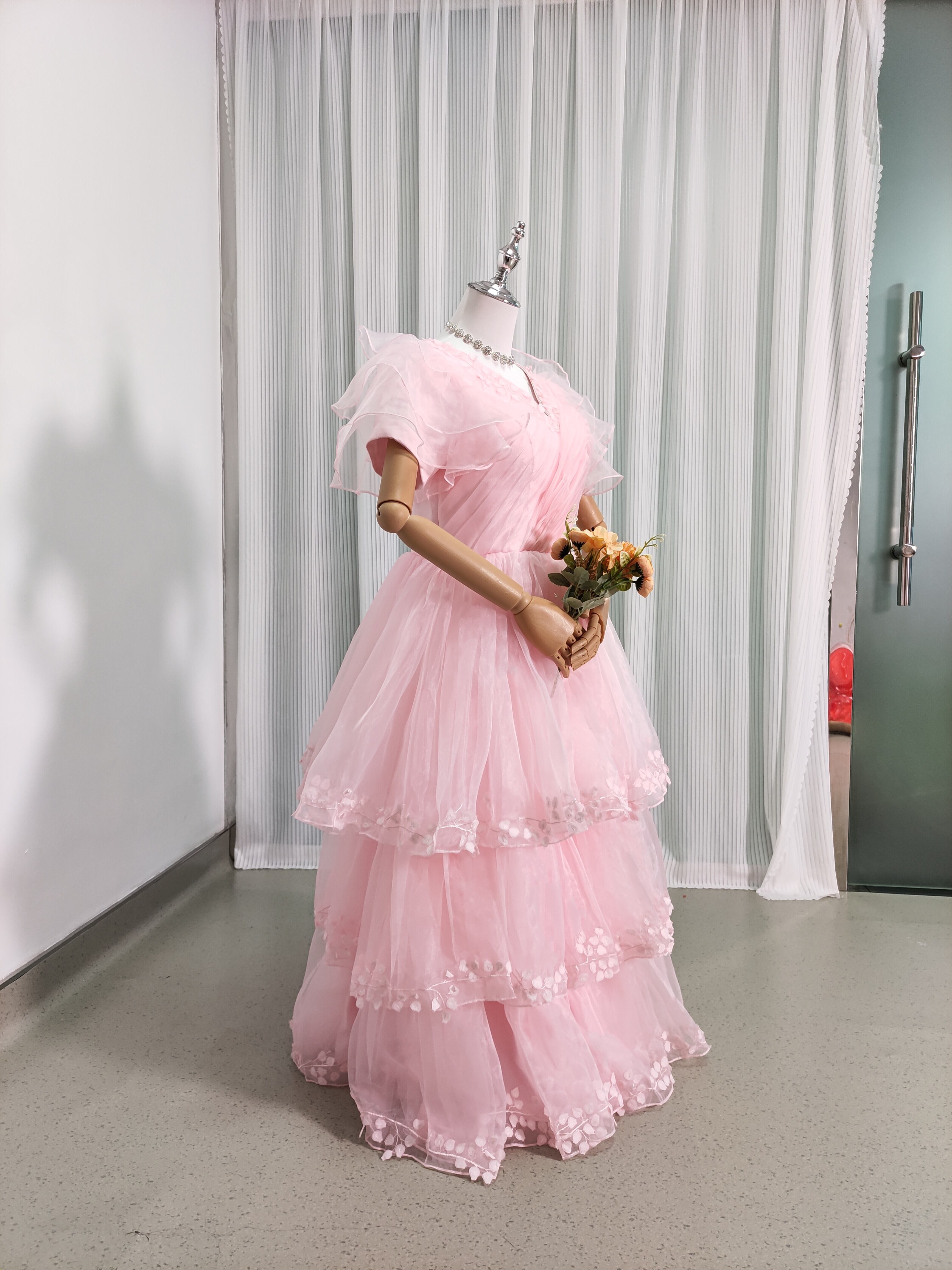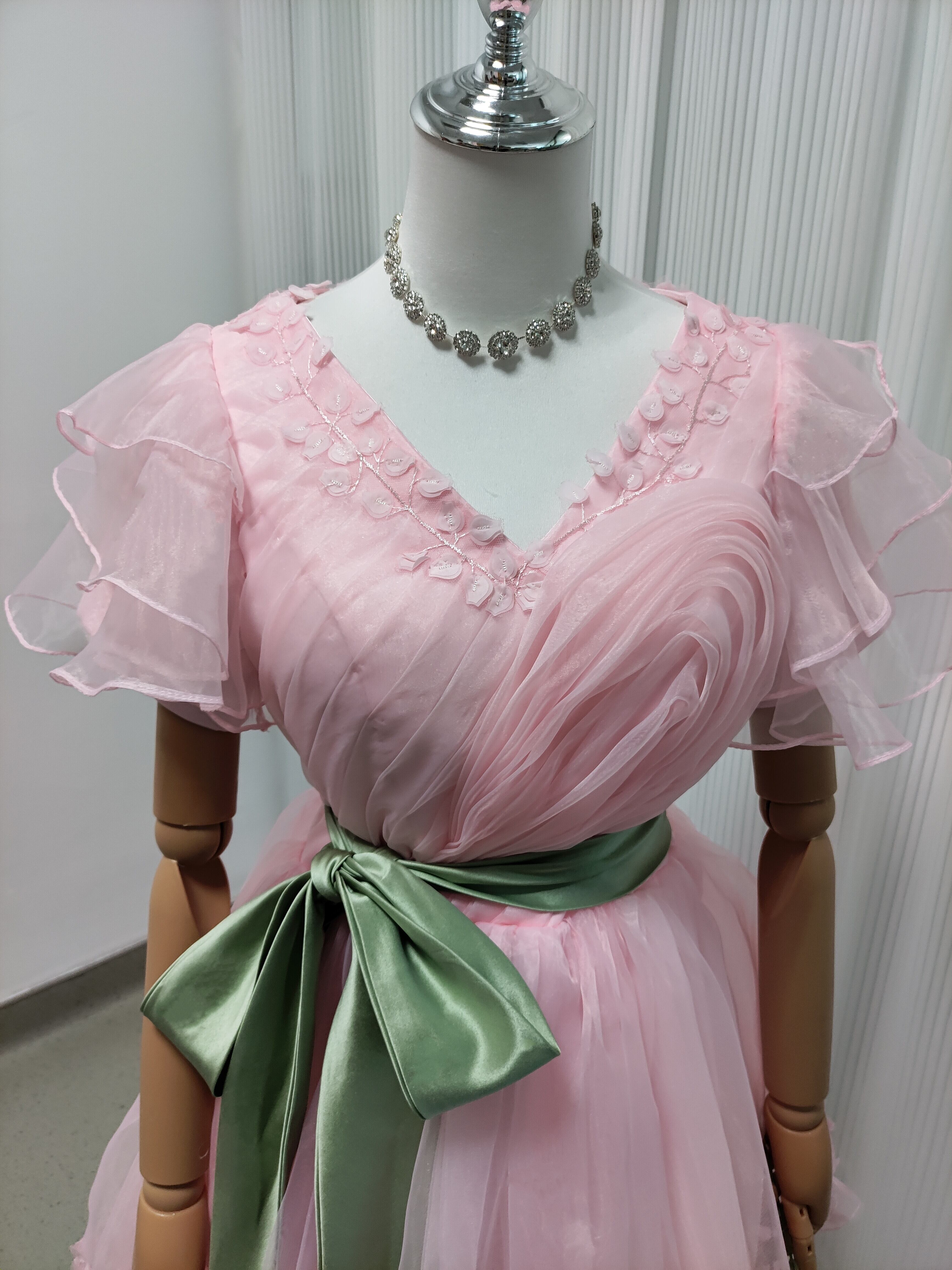 抜群のおしゃれ見え上質オーガンジー ピンク カラードレス Vネック 3D立体レース刺繍柔らかく重ねたチュールスカート