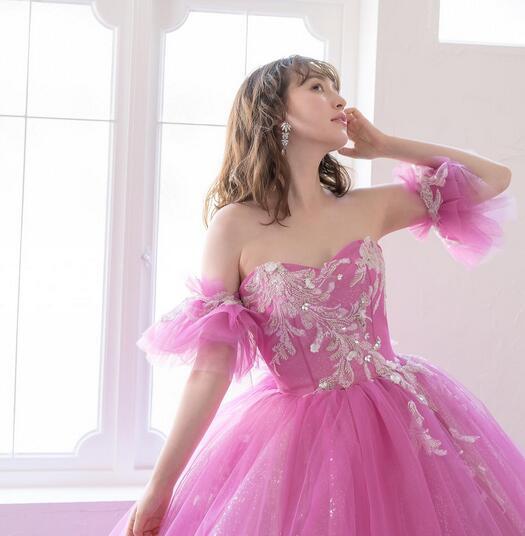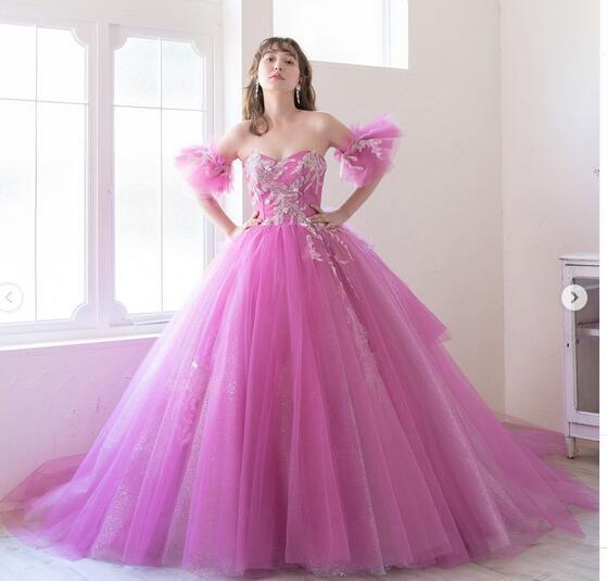 送料無料!カラードレス ピンク オーダードレス ハートカット プリンセスライン 柔らかく重ねたチュールスカート 前撮り 上品レース 取り外し袖 パーティドレス 披露宴/ステージ/演奏ドレス イブニングドレス 合コン ミディアムドレス プレゼント 結婚式/前撮り/二次会/披露宴 | David1021k Dress(ダヴィドレス)