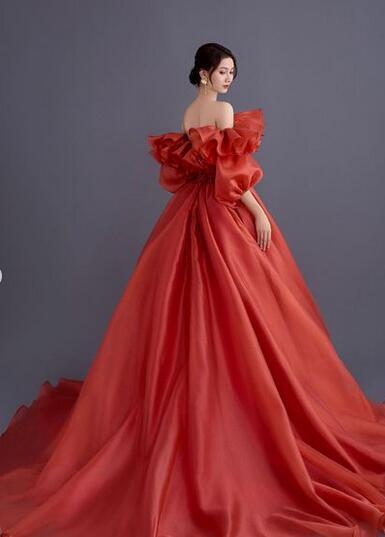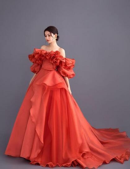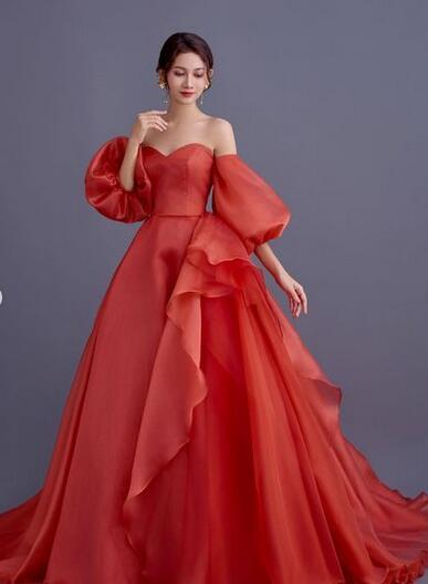高品質!カラードレス 高級サテン テラコッタ/レンガ色 オフショルダー レッド/赤 パフスリーブ クラシカル オーダードレス アンティークなドレス ベアトップ 花嫁 ハートカット 前撮り ロングトレーン パーティドレス アシンメトリー風 披露宴 プリンセスライン プレゼント 結婚式/前撮り/二次会/披露宴 | David1021k Dress(ダヴィドレス)