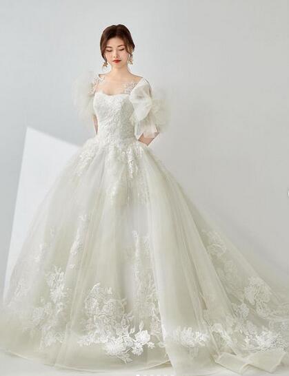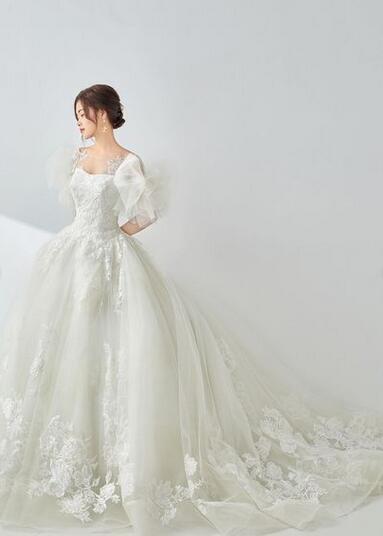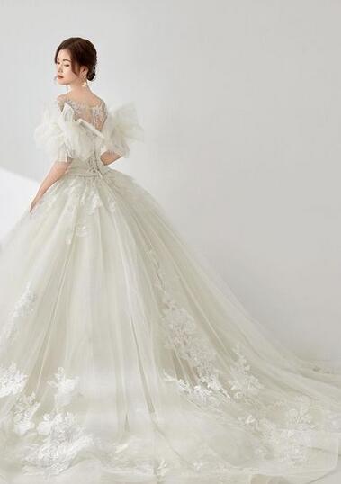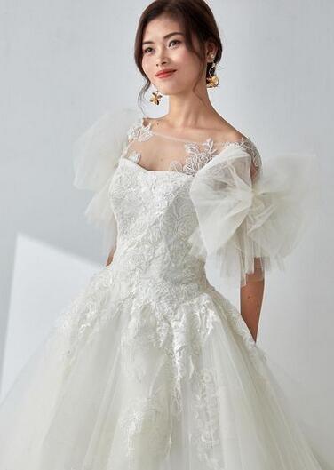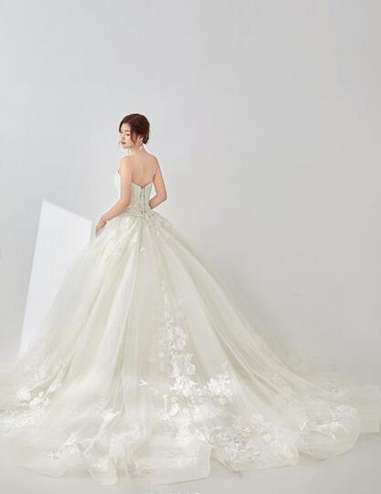 高品質!ウエディングドレス ソフトチュール オーダードレス 蝶結びリボン レースボレロ 花柄のモチーフ刺繍が美しく ベアトップ 花嫁 トップス 前撮り ふっくら柔らかなバックリボン ロングトレーン パーティドレス 披露宴 プリンセスライン プレゼント 結婚式/前撮り/二次会/披露宴 | David1021k Dress(ダヴィドレス)