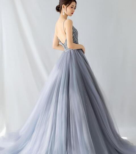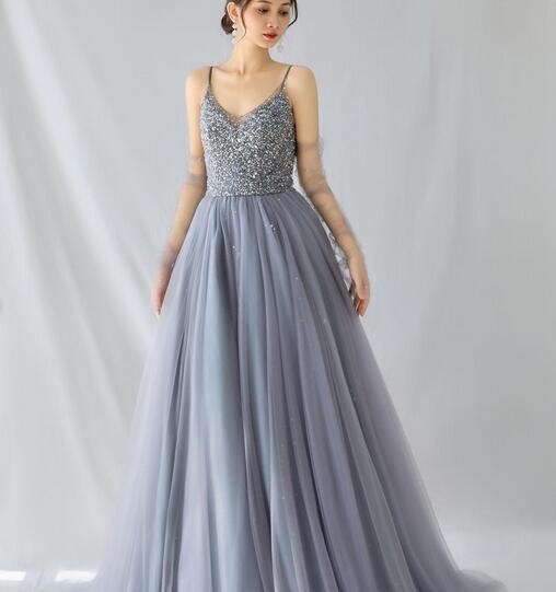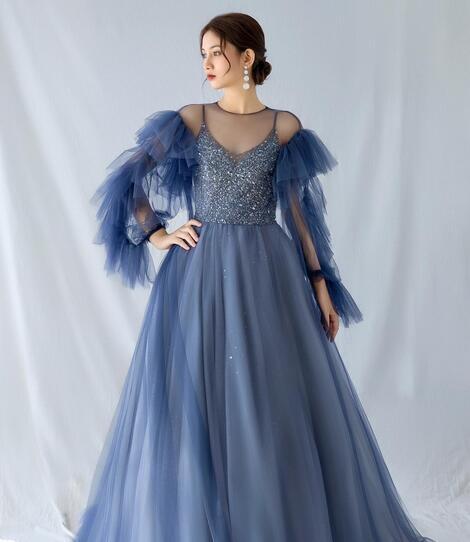 高品質!カラードレス ダークブルー オーバードレス バックレス スパンコール フリルスリーブ キャミソール チュールトップス 前撮り パーティドレス 披露宴 結婚式/前撮り/二次会