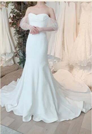 高品質!ウエディングドレス ソフトチュール ベアトップ マーメイドライン オーダードレス ハンドメイド 取り外し袖 花嫁 前撮り ロングトレーン 披露宴 シンプルなデザインプレゼント 結婚式/前撮り/二次会 | David1021k Dress(ダヴィドレス)